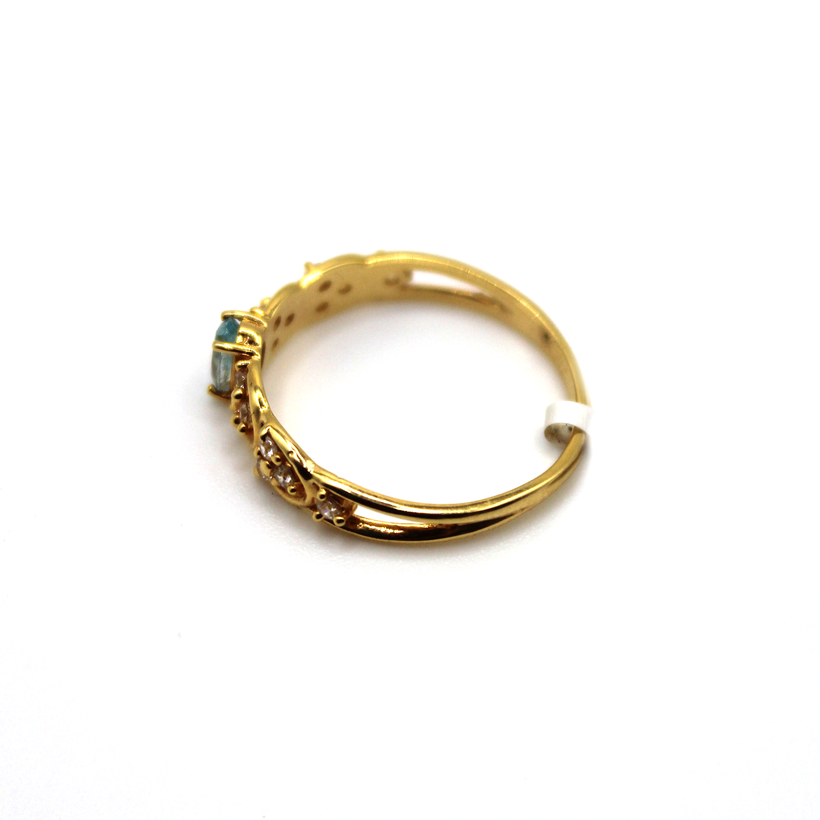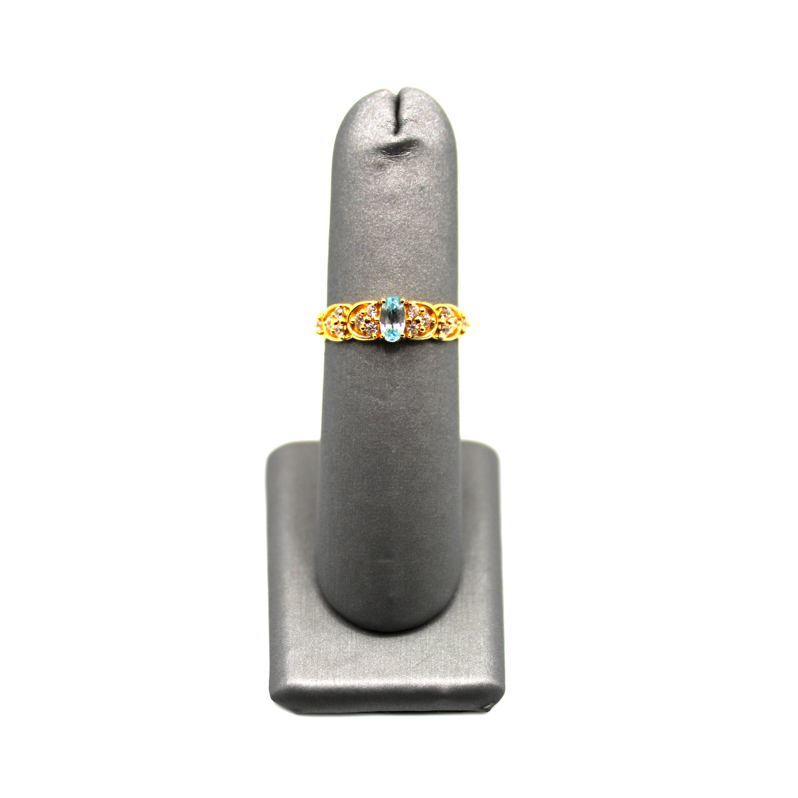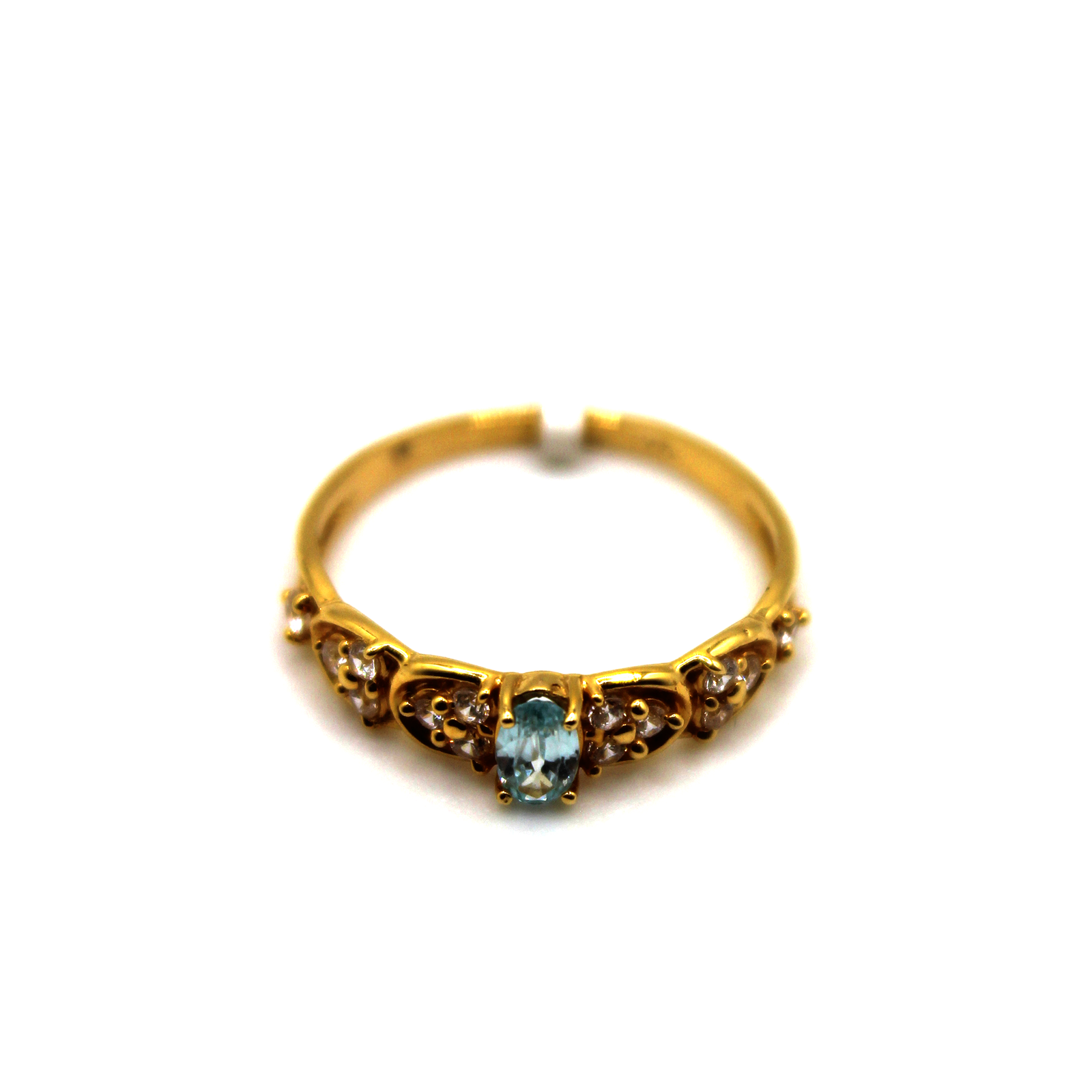 A 14KT gold ring with an oval aqua gemstone and elegant accent details.