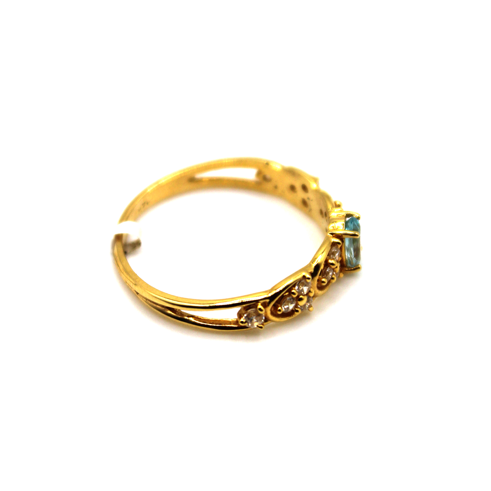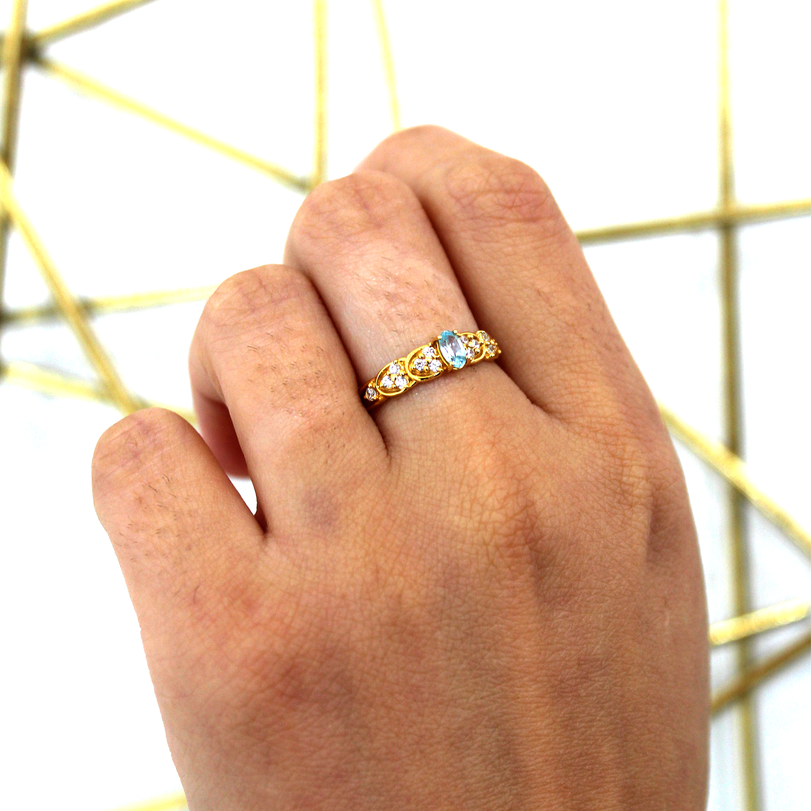 The Aqua Grace Ring features a delicate oval-cut aqua gemstone framed by intricate gold detailing and accented with shimmering stones. Crafted in 14KT gold, this graceful design radiates timeless beauty and sophistication.