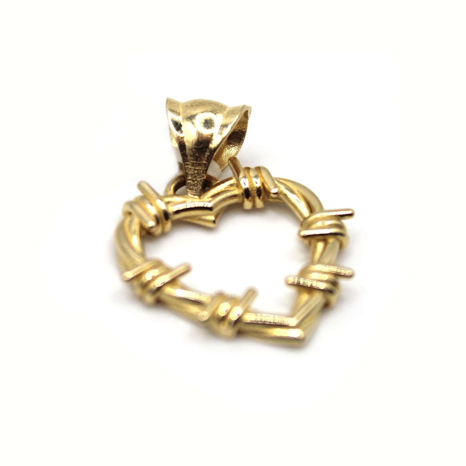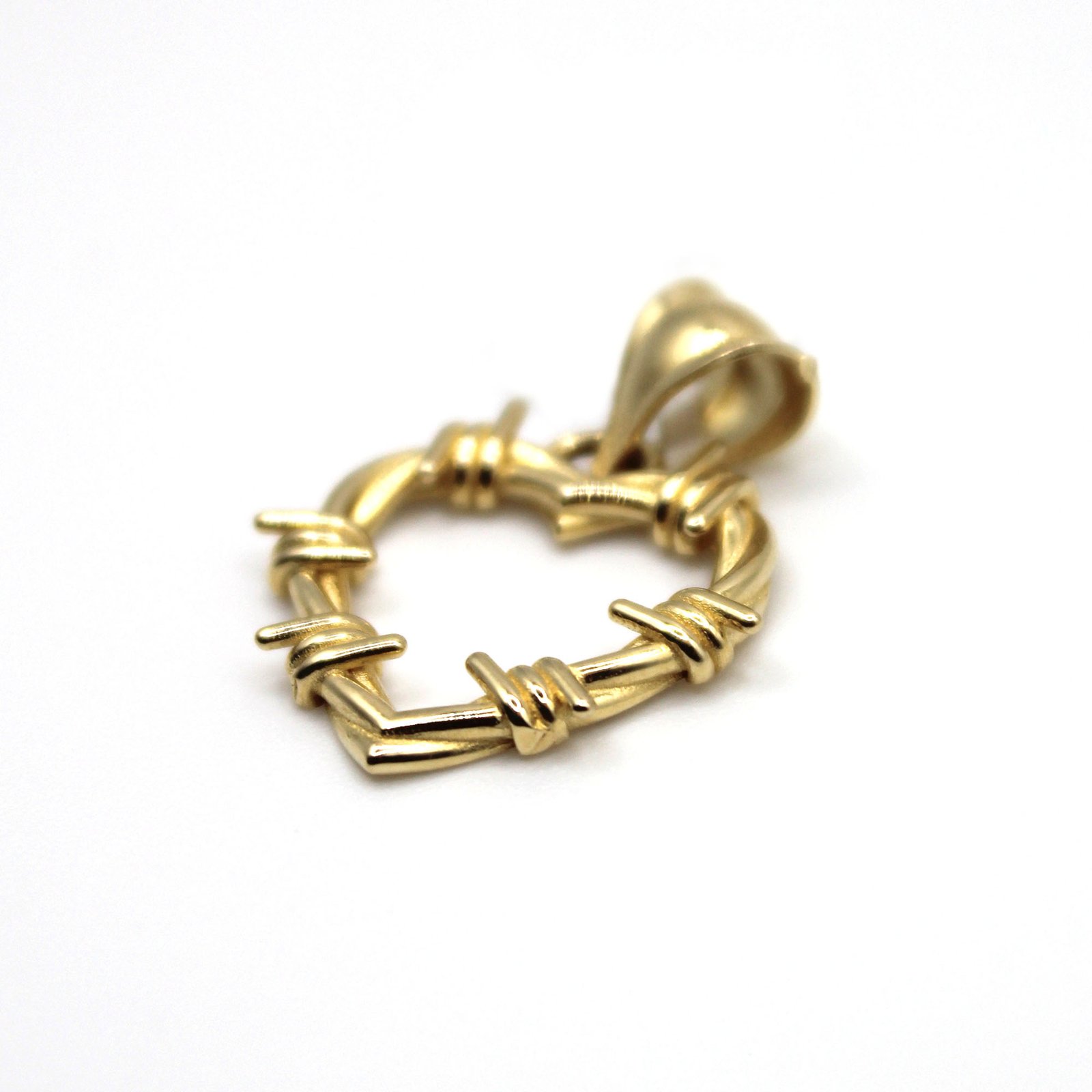 Make a bold statement with this 14KT Gold Barbed Heart Pendant. Designed with a heart outline wrapped in barbed-wire style details, it symbolizes strength, resilience, and love with an edge. Perfect for pairing with a simple chain or layering with other necklaces.
