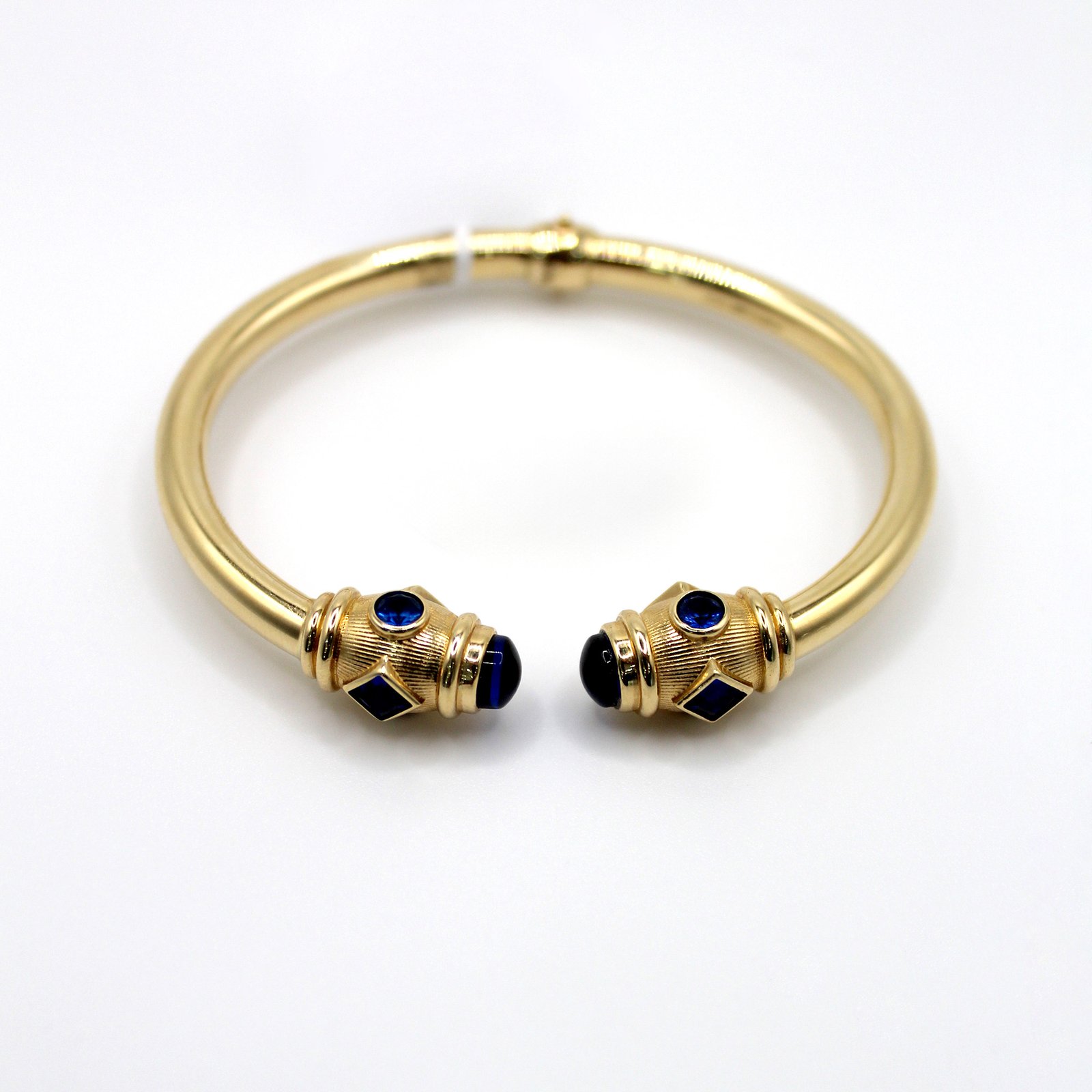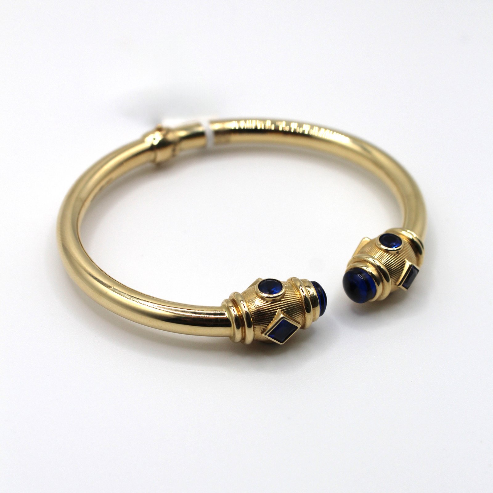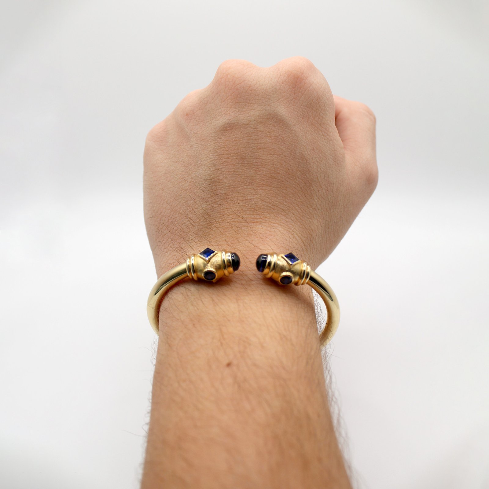 This handsome and weighty 14KT yellow gold men’s bracelet features a bold, classic cuff design. The smooth, tubular bangle culminates in two intricate gold caps. These end caps are adorned with contrasting dark blue and black color stones in both rounded cabochon and squared shapes, which are set against textured, detailed gold work. The open-cuff style allows for easy on-and-off wear and offers a perfect blend of modern design with timeless sophistication.