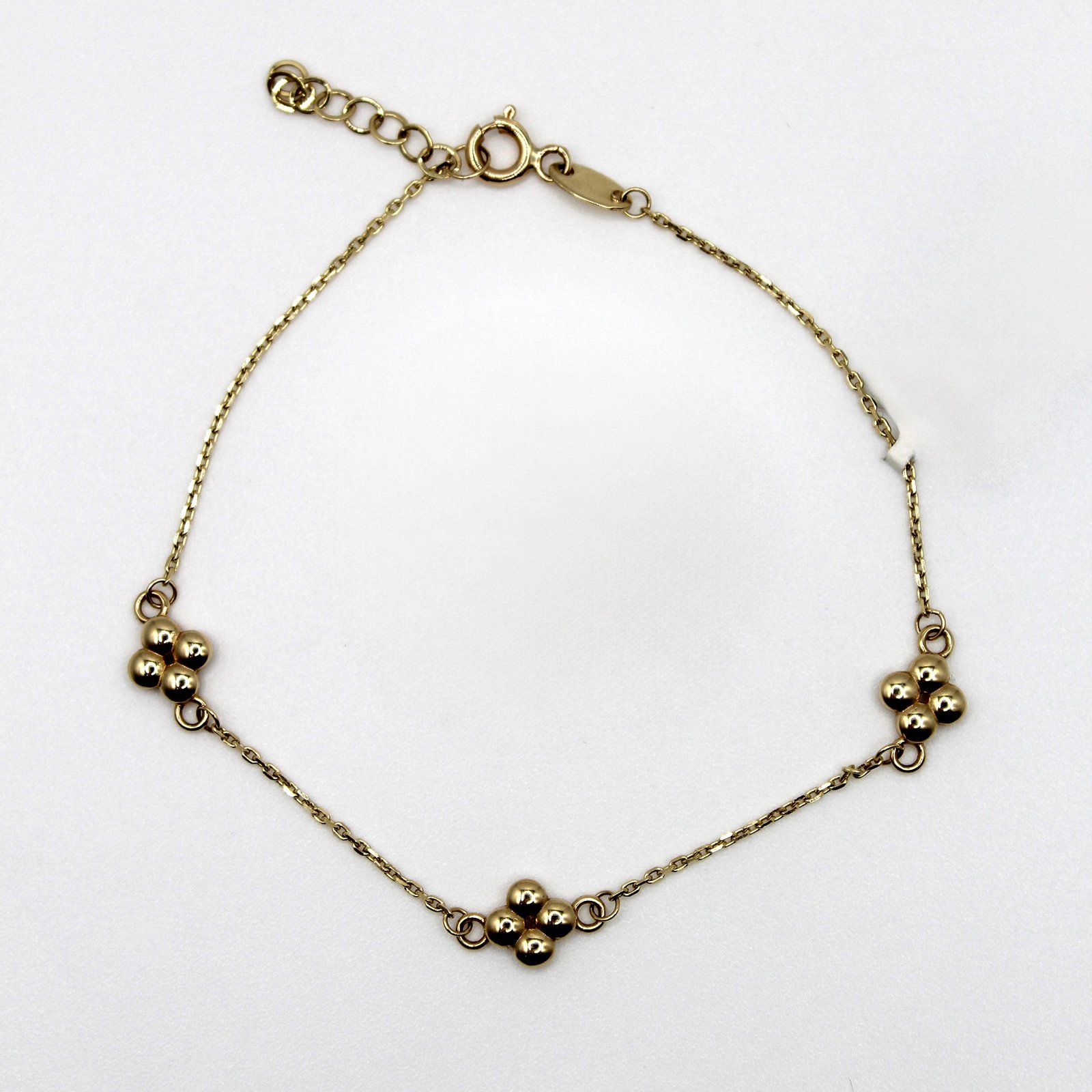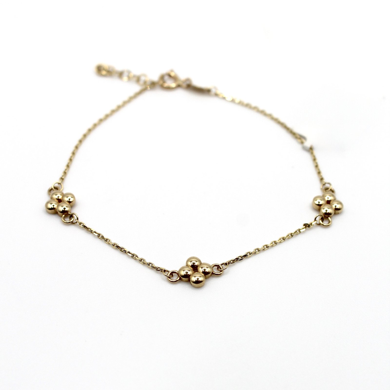 Crafted in high-quality 14KT gold, this women’s bracelet is the essence of understated luxury. The fine link chain is punctuated by three evenly spaced stations, each formed by a tiny cluster of four highly-polished gold beads. This design creates a lovely, subtle motif that catches the light beautifully. Lightweight and elegant, this bracelet is perfect for layering with other pieces or wearing on its own for a minimalist statement. It features an adjustable chain and a secure clasp, making it a versatile and cherished addition to any jewelry collection.