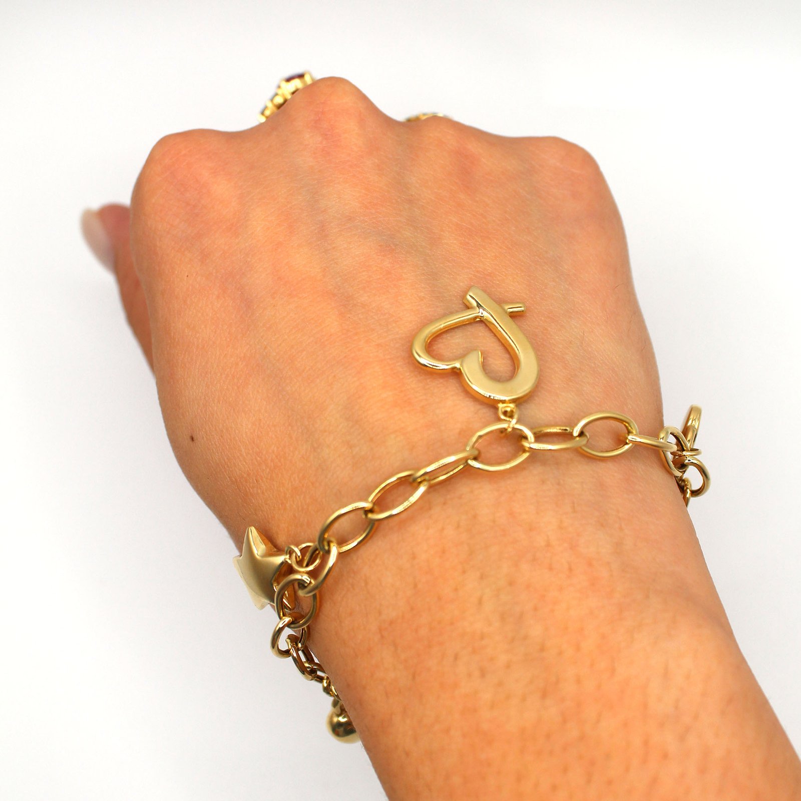 This 14KT gold bracelet features a delicate chain adorned with glossy black beads and dainty gold heart charms. The contrasting tones create a striking balance of sophistication and charm, making it a versatile piece that transitions seamlessly from casual wear to evening elegance. Its lightweight design ensures comfort while adding a bold, stylish statement to your jewelry collection.