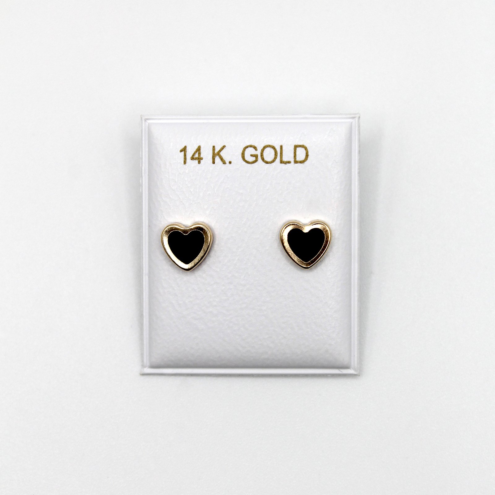 These striking 14KT gold stud earrings feature a smooth, classic heart shape filled with deep black enamel, creating a sleek and modern contrast with the warm, polished gold border. The black and gold combination is timelessly elegant and versatile, making these studs a sophisticated staple piece. They are perfect for adding a touch of bold, graphic appeal to your daily wear. These earrings make a wonderful, expressive gift.