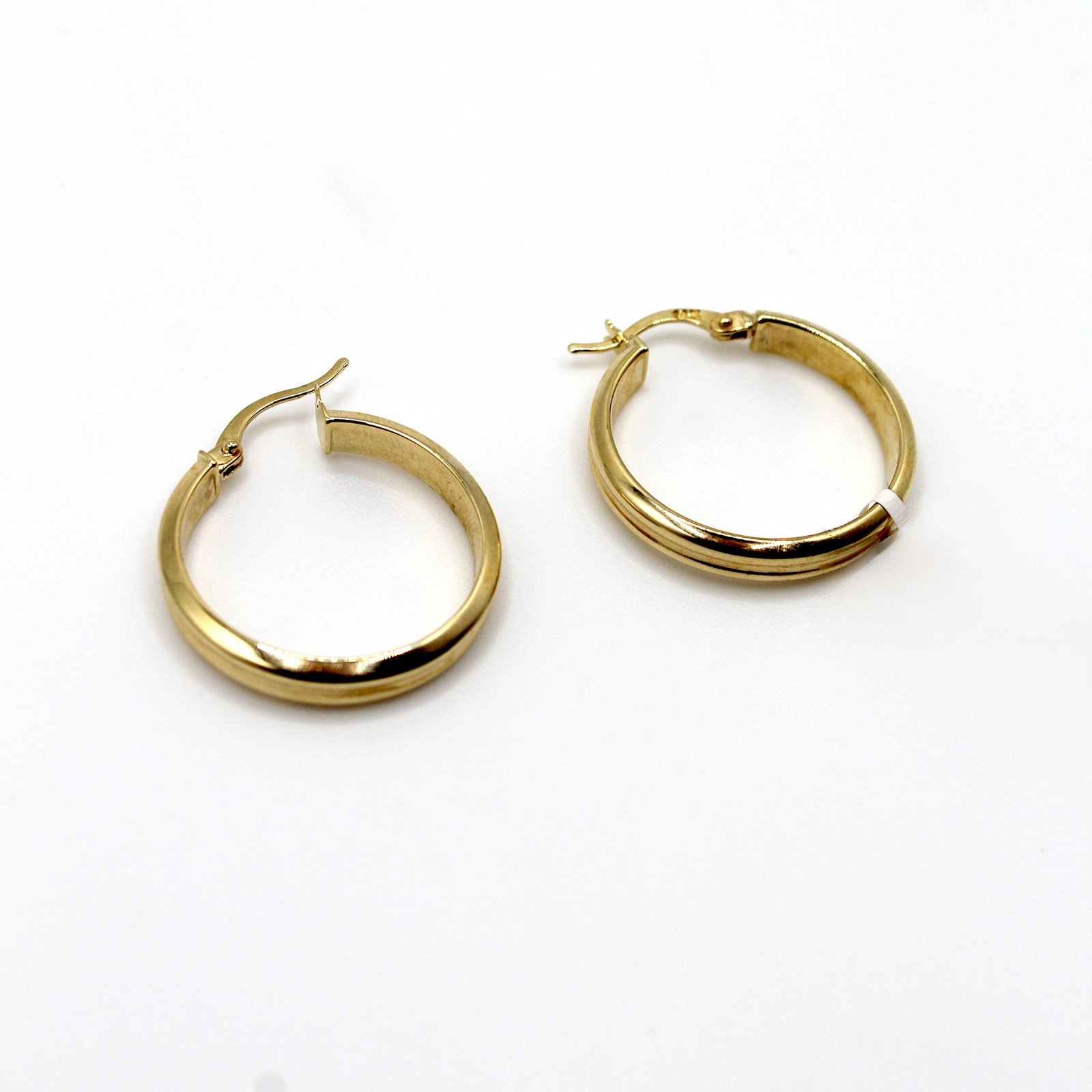 Crafted in high-quality 14KT yellow gold, these women’s hoop earrings offer a luxurious and dimensional look. The medium-sized, rounded profile boasts a substantial, polished surface that is uniquely defined by a deep central indentation or channel. This ribbing creates a distinct, sophisticated contrast between the two smooth, raised edges, maximizing light reflection and visual interest. Secured with a durable hinged closure, these comfortable hoops are perfect for adding volume and a refined, textural detail to both casual and formal attire.