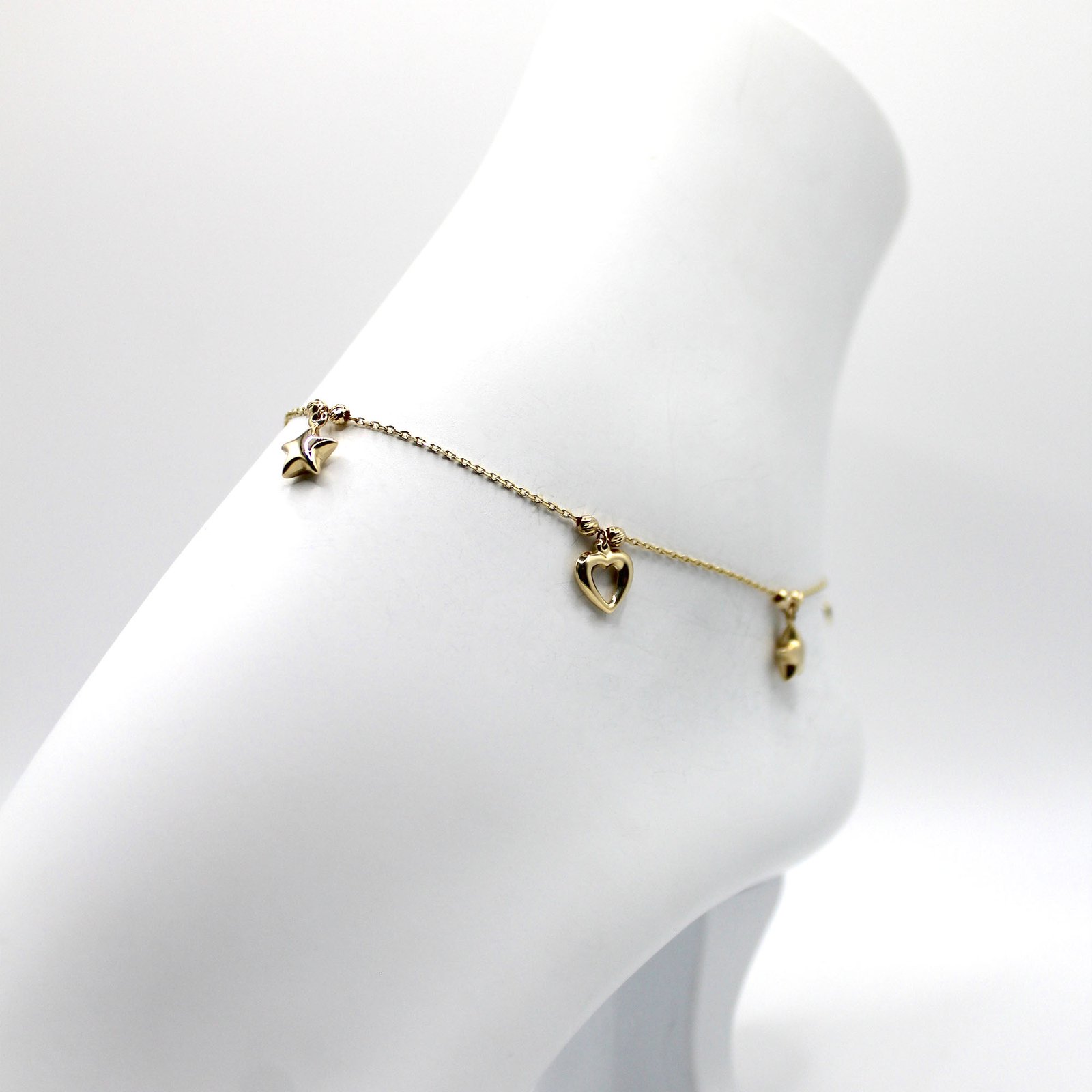 Add a touch of charm to your style with this 14KT anklet featuring dainty heart and star pendants. Crafted in polished gold, this piece blends elegance with fun, making it perfect for both casual wear and special occasions. Its lightweight design and timeless motifs ensure it’s an anklet you’ll love to wear daily.