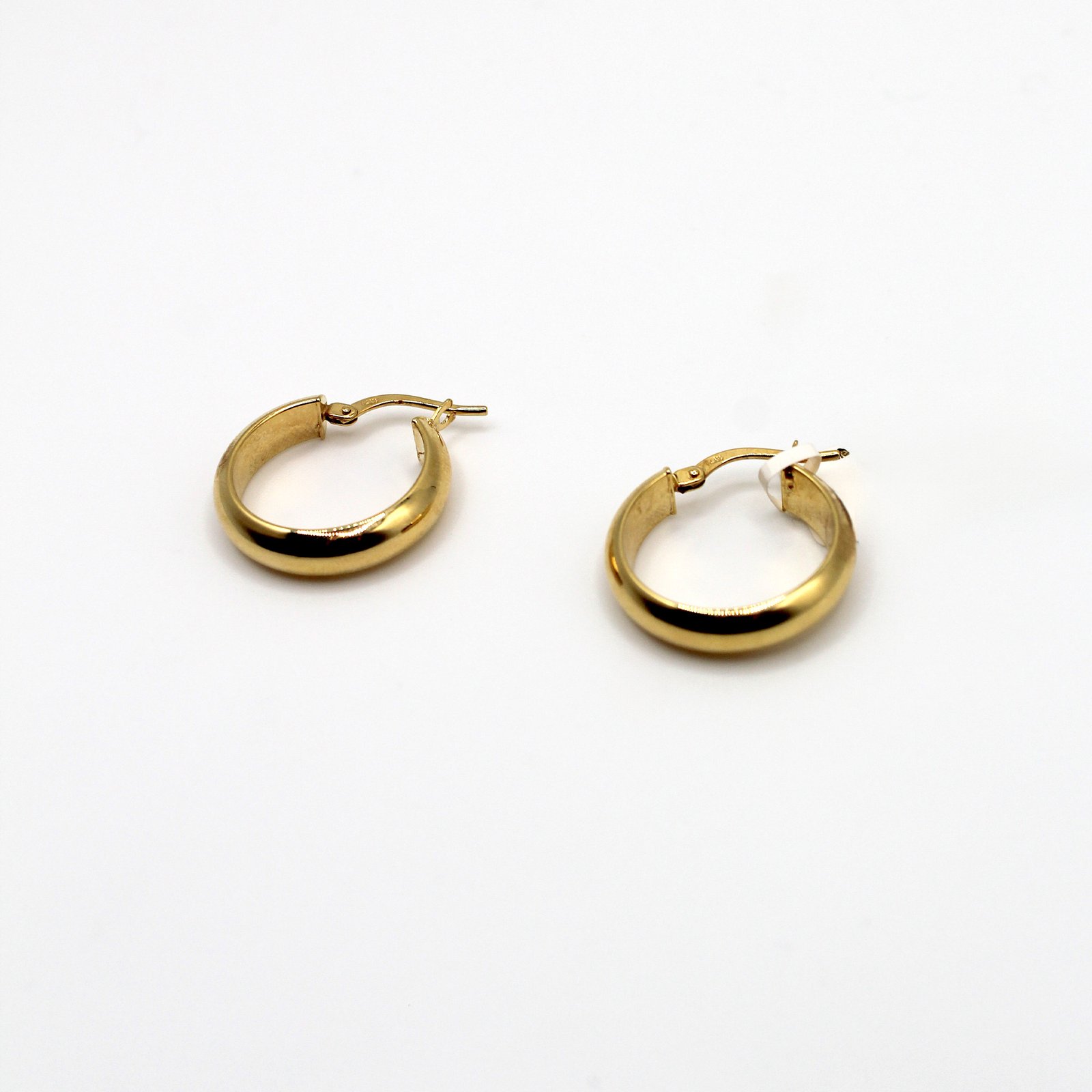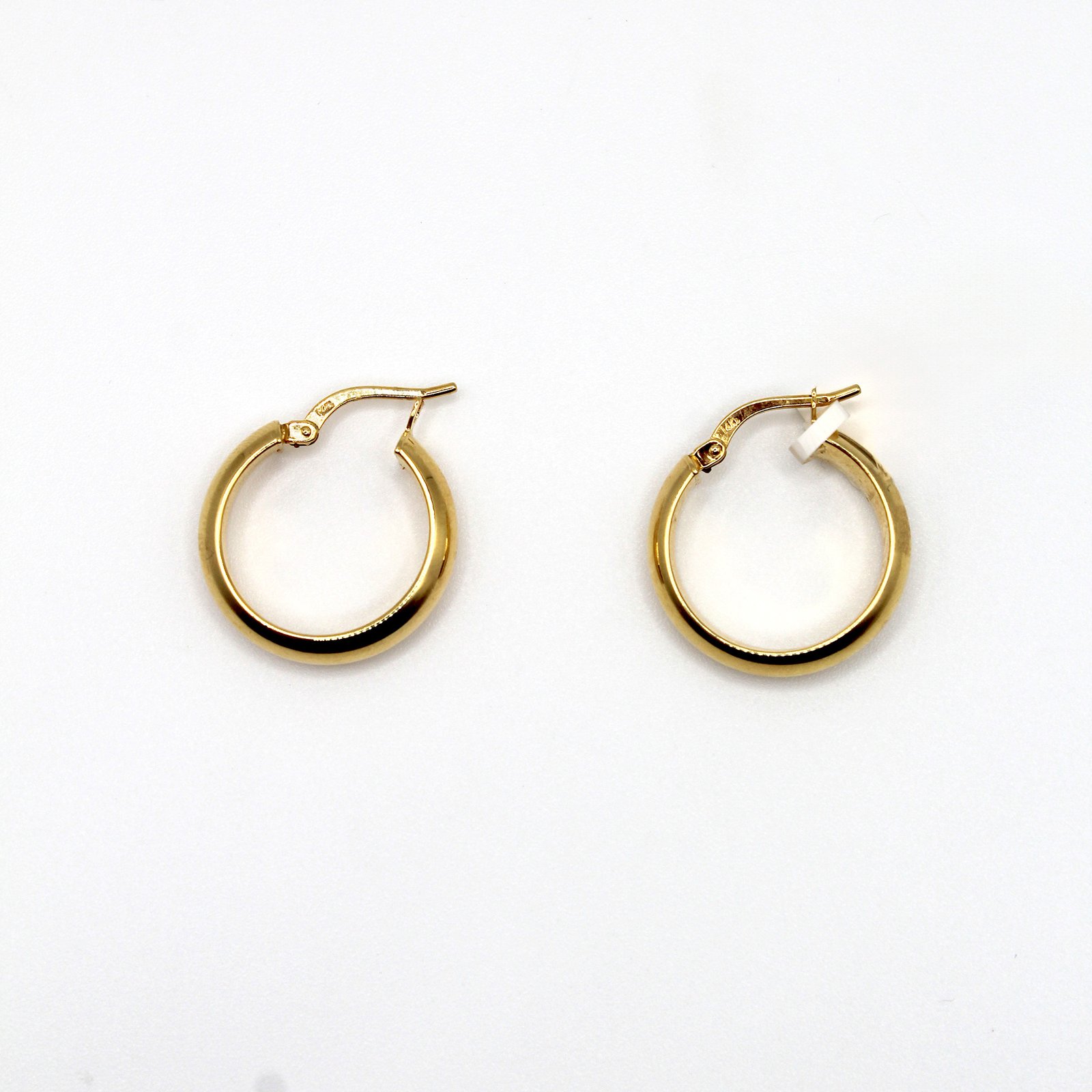 Crafted in rich 14KT yellow gold, these women’s hoop earrings are a timeless, high-impact accessory. The round, medium-sized silhouette boasts a wide, rounded profile that feels weighty and substantial. The entire surface is perfectly smooth and finished with a brilliant high-polish, which ensures a continuous, deep reflection of light. Secured with a durable hinged closure, these everyday statement hoops are perfect for adding volume, sophistication, and a rich, golden gleam to any look.