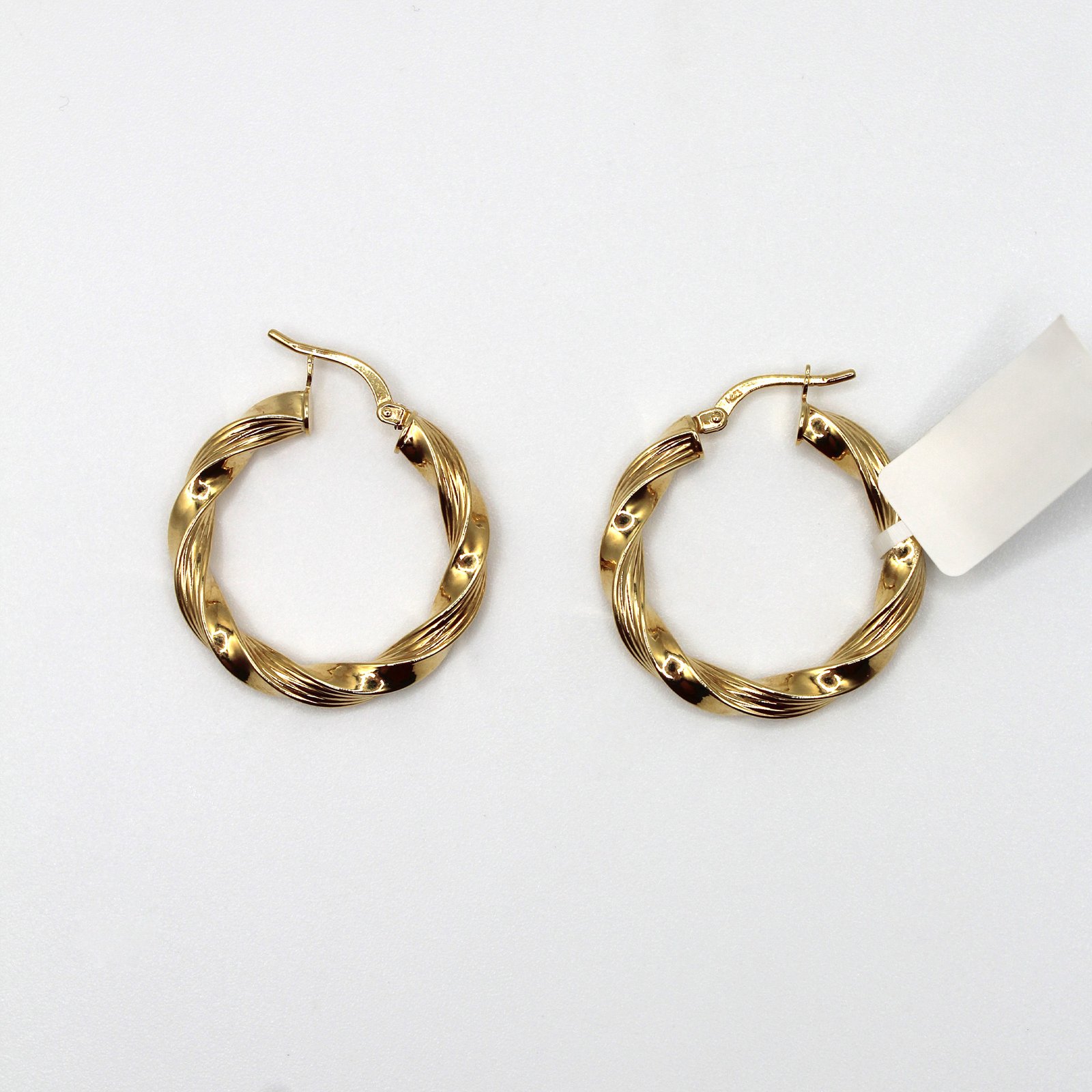 Crafted in rich 14KT yellow gold, these women’s hoop earrings are a statement piece with enduring appeal. The chunky, round silhouette is created by two wide strands of gold that are intricately twisted together. The surface features subtle ribbing or diamond-cut accents that enhance the texture and maximize light reflection, giving the appearance of continuous sparkle. Secured with a durable hinged closure, these substantial hoops are perfect for adding volume, sophistication, and a touch of golden luxury to any look.