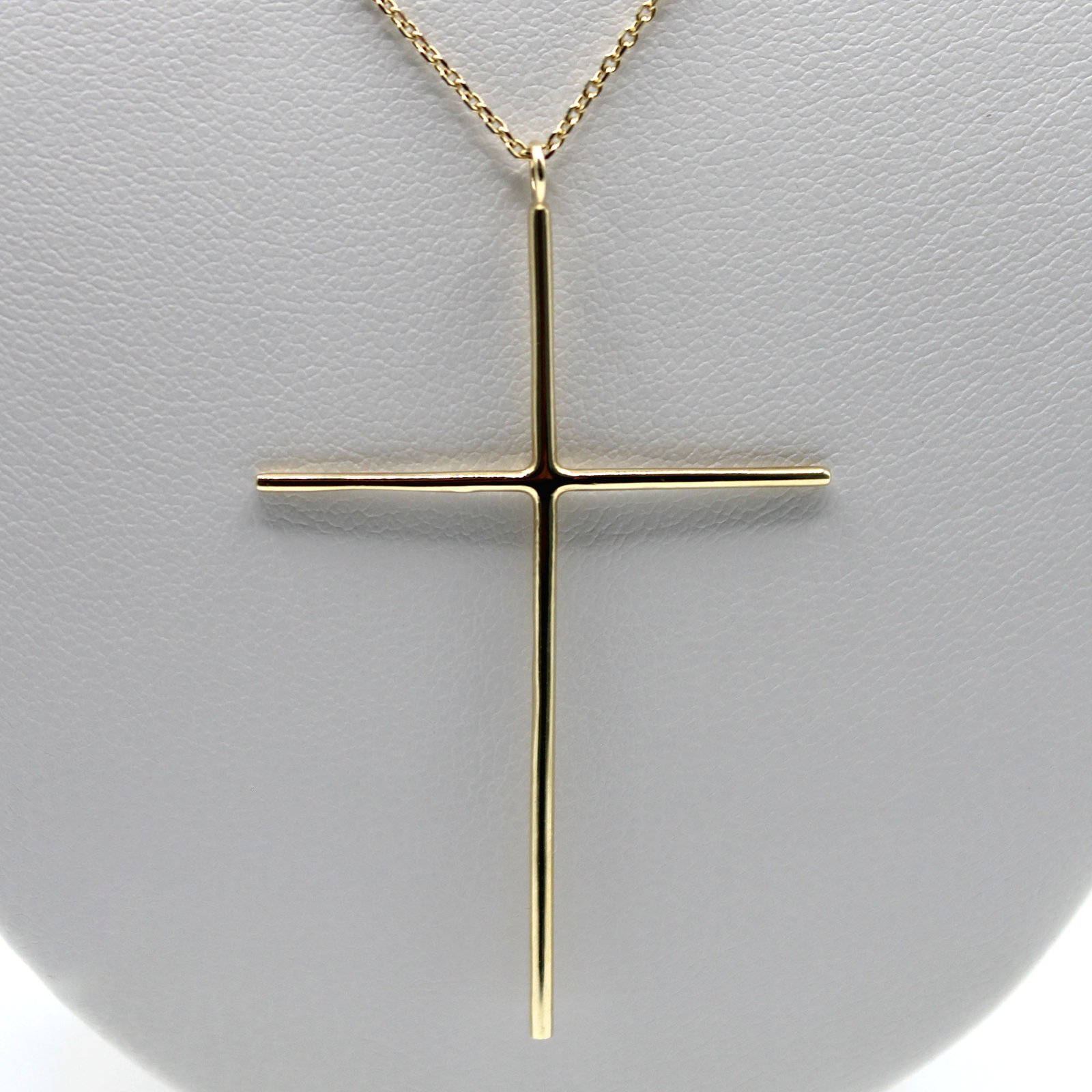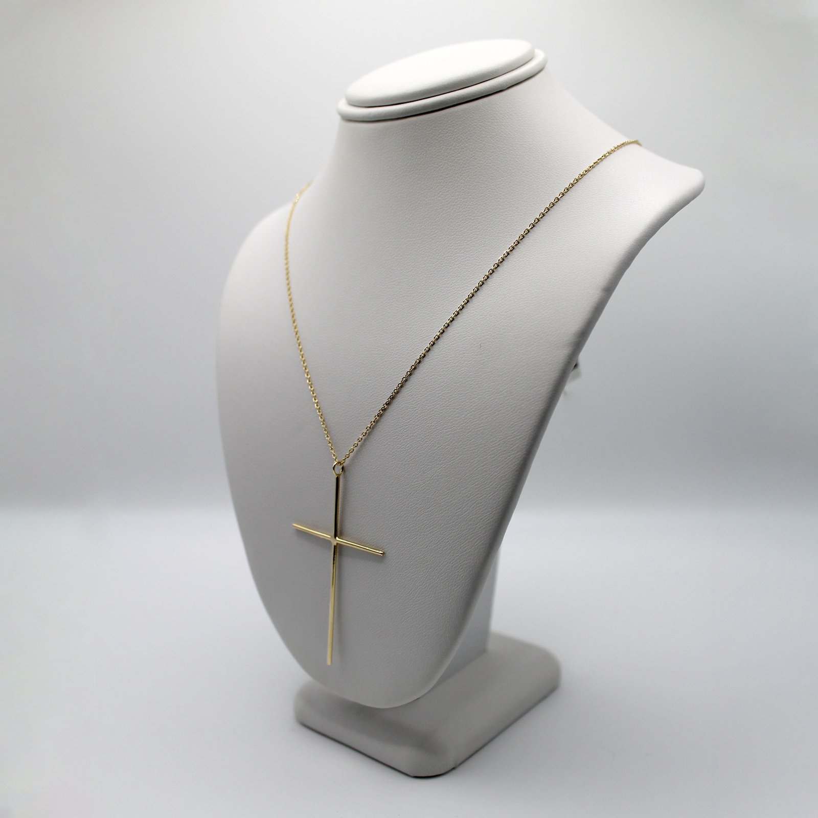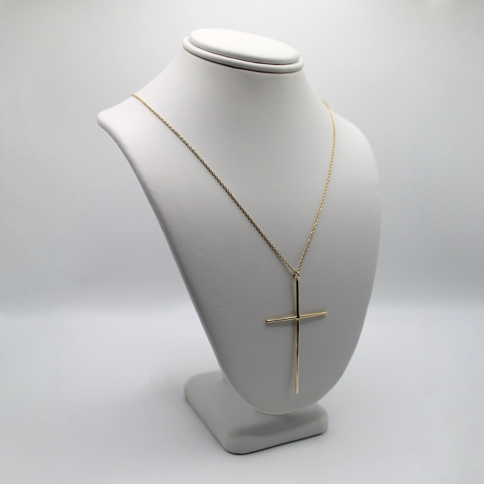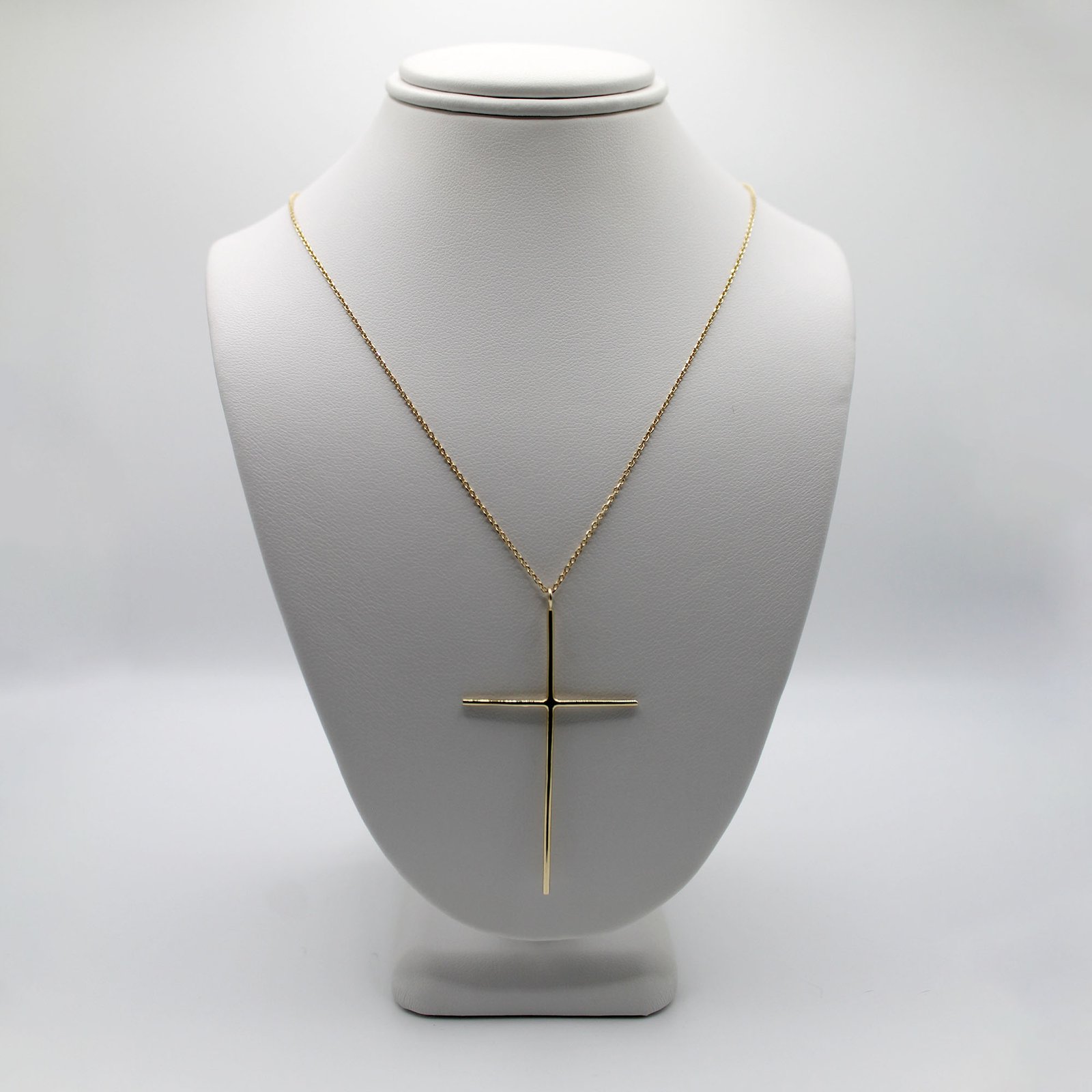 Crafted in radiant 14KT yellow gold, this necklace is an essential and meaningful accessory. It features a medium-sized Latin cross pendant with a substantial feel and a beautifully simple design. The entire surface of the cross is finished with a flawless high-polish, ensuring a rich, continuous golden reflection. The pendant is secured to a durable yet delicate link chain (typically a rope or curb style) that complements the weight of the cross. This necklace is perfect for wearing every day as a quiet statement of faith or for layering with other jewelry. Its timeless design makes it suitable for both men and women.