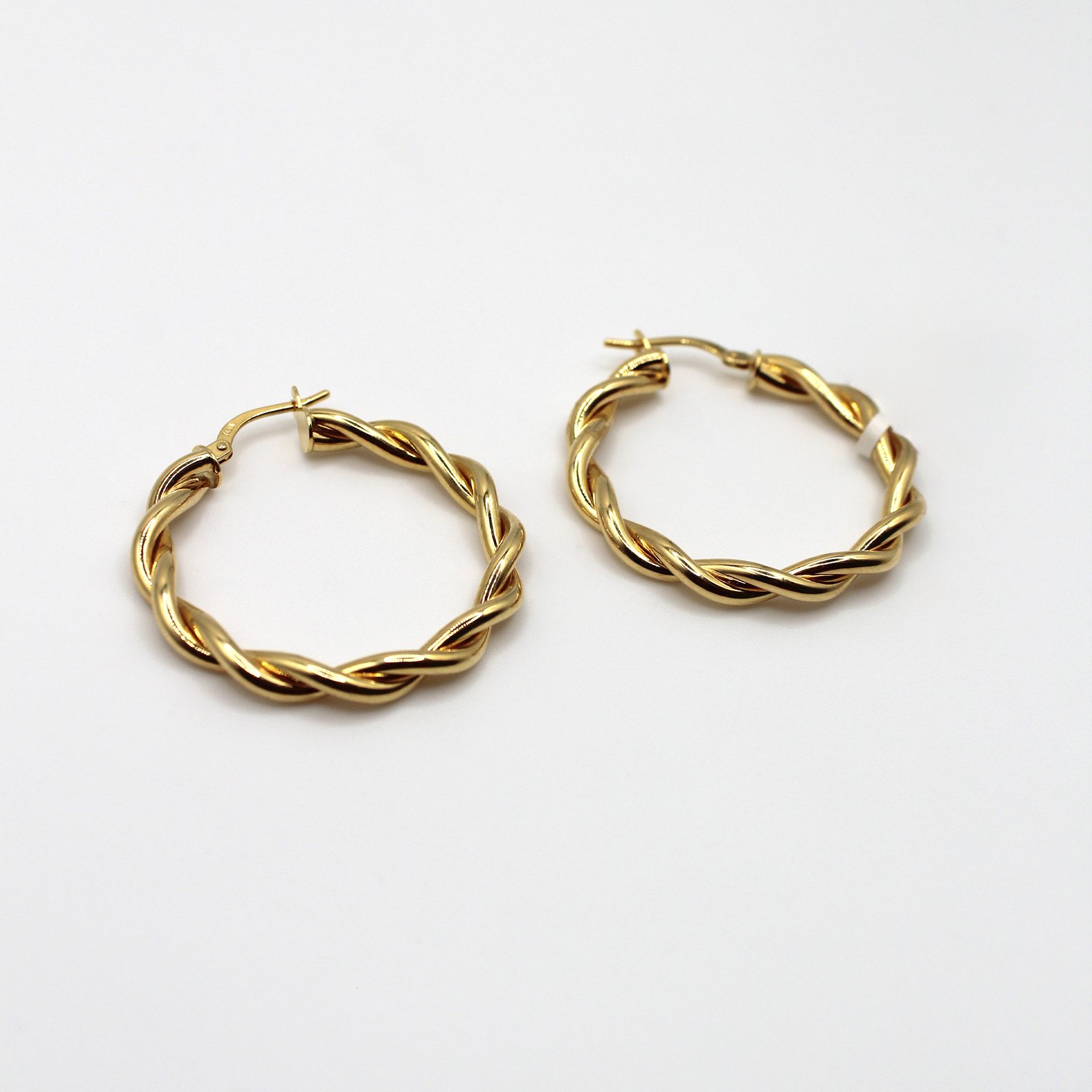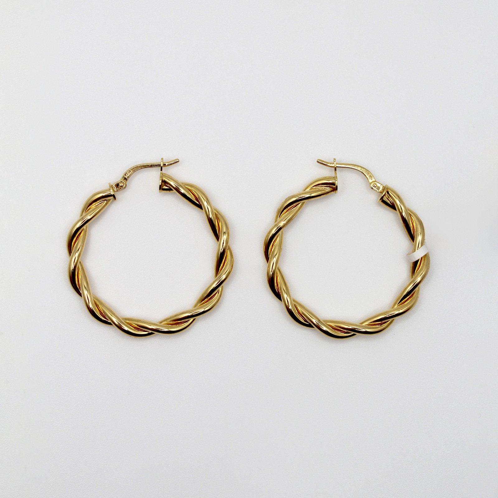 Crafted in high-quality 14KT yellow gold, these women’s hoop earrings offer a classic yet dimensional look. The medium-sized, round silhouette is formed by two polished gold strands that are gracefully twisted together, creating a beautiful spiral texture. This design adds noticeable depth and a sophisticated, continuous shimmer. Secured with a durable hinged closure, these comfortable hoops are a versatile staple, perfect for elevating any outfit from casual daywear to evening chic.