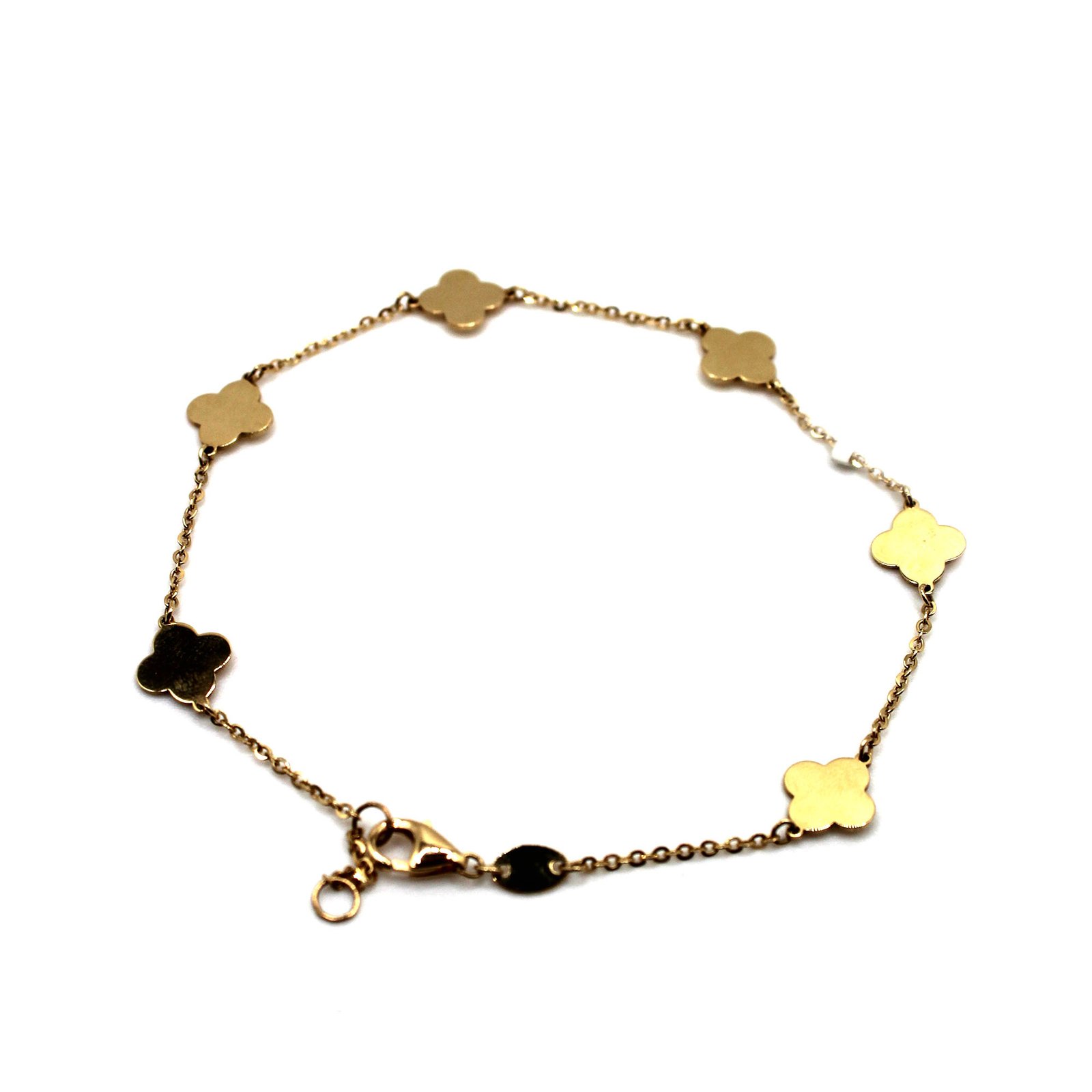 This women’s bracelet is beautifully crafted in 14KT gold and adorned with sleek clover-shaped charms, each representing a touch of luck and charm. The delicate chain design makes it lightweight and comfortable for everyday wear while maintaining a sophisticated style for special occasions. Its polished finish brings out a radiant glow, making it perfect to wear on its own or layered with other pieces. A versatile bracelet that embodies grace and good fortune.
