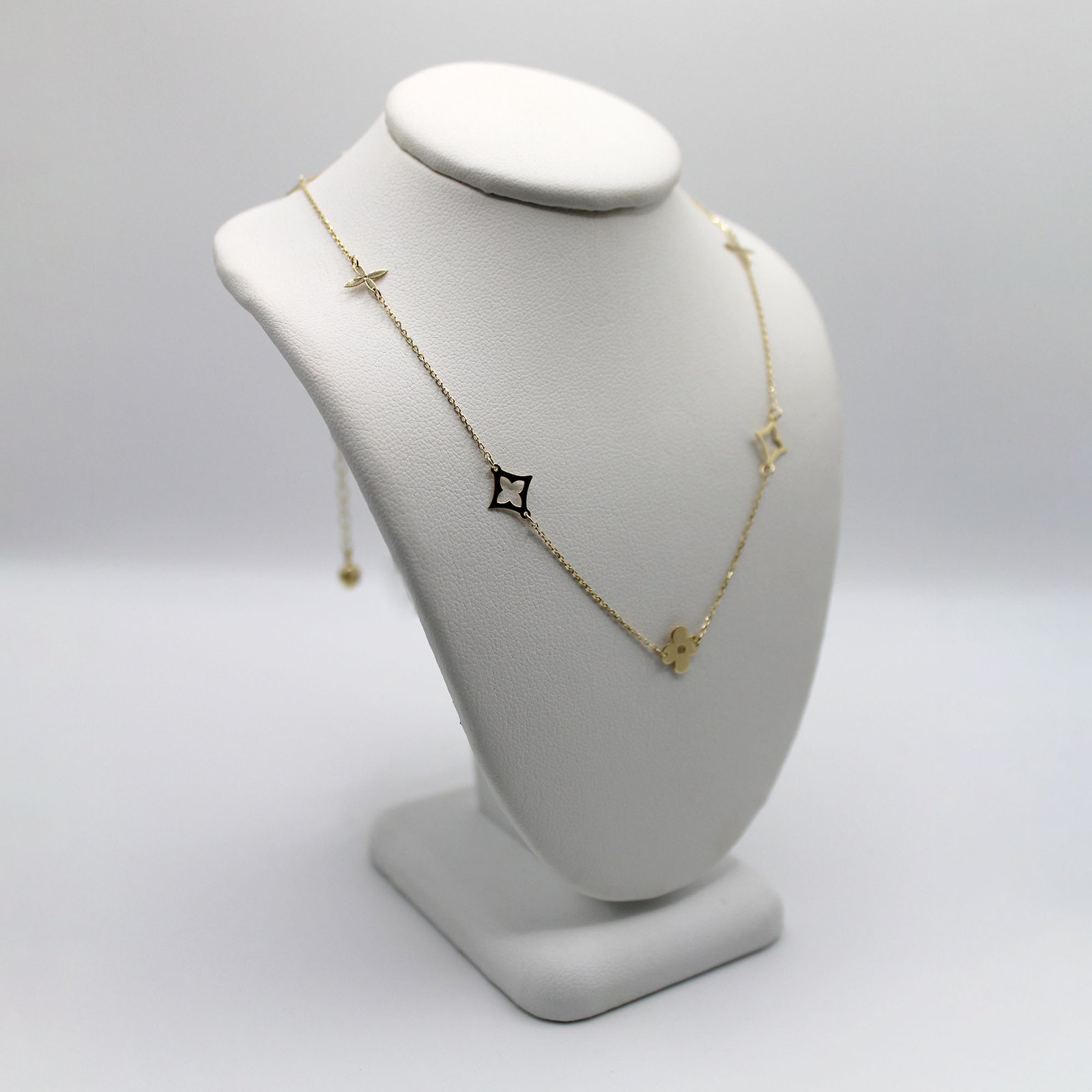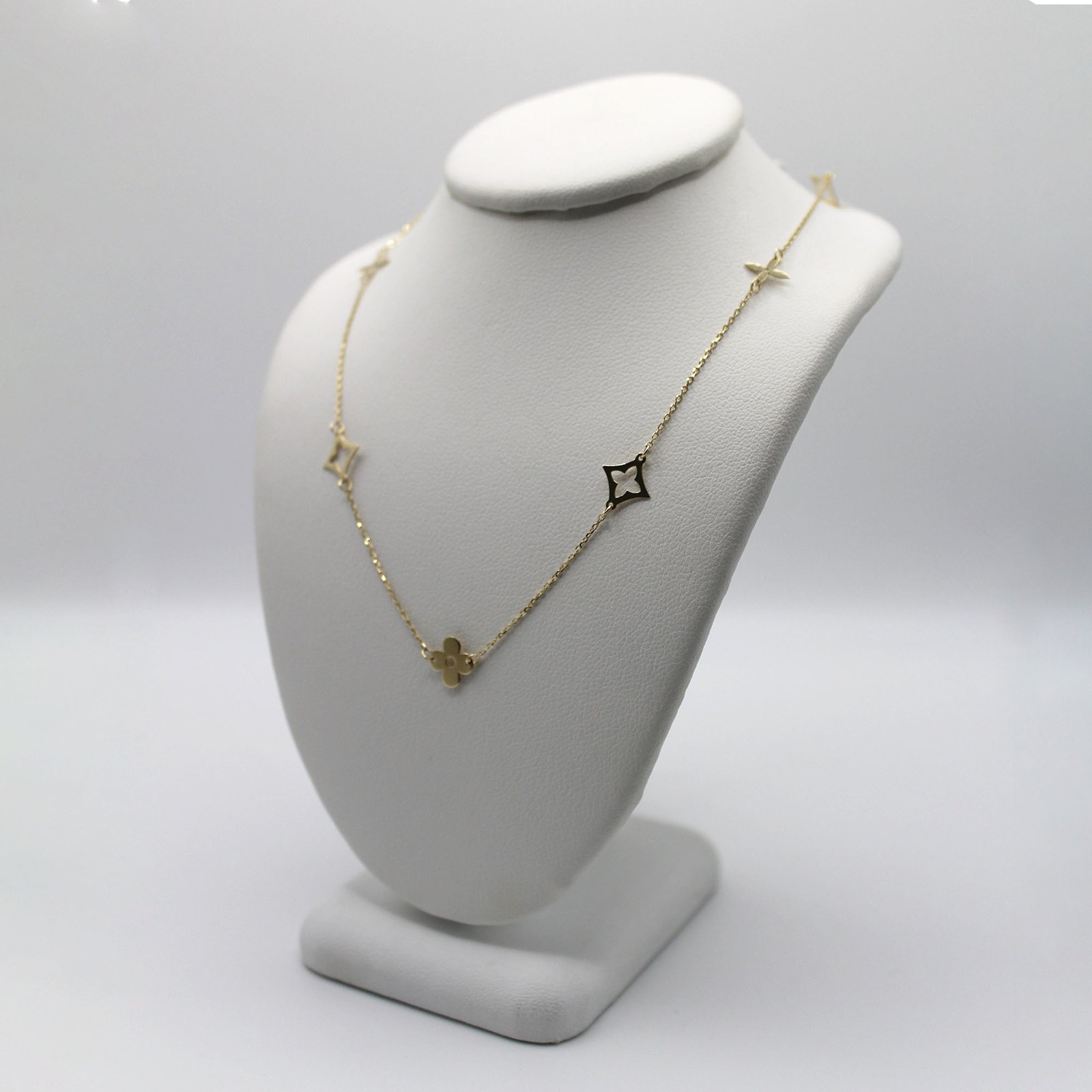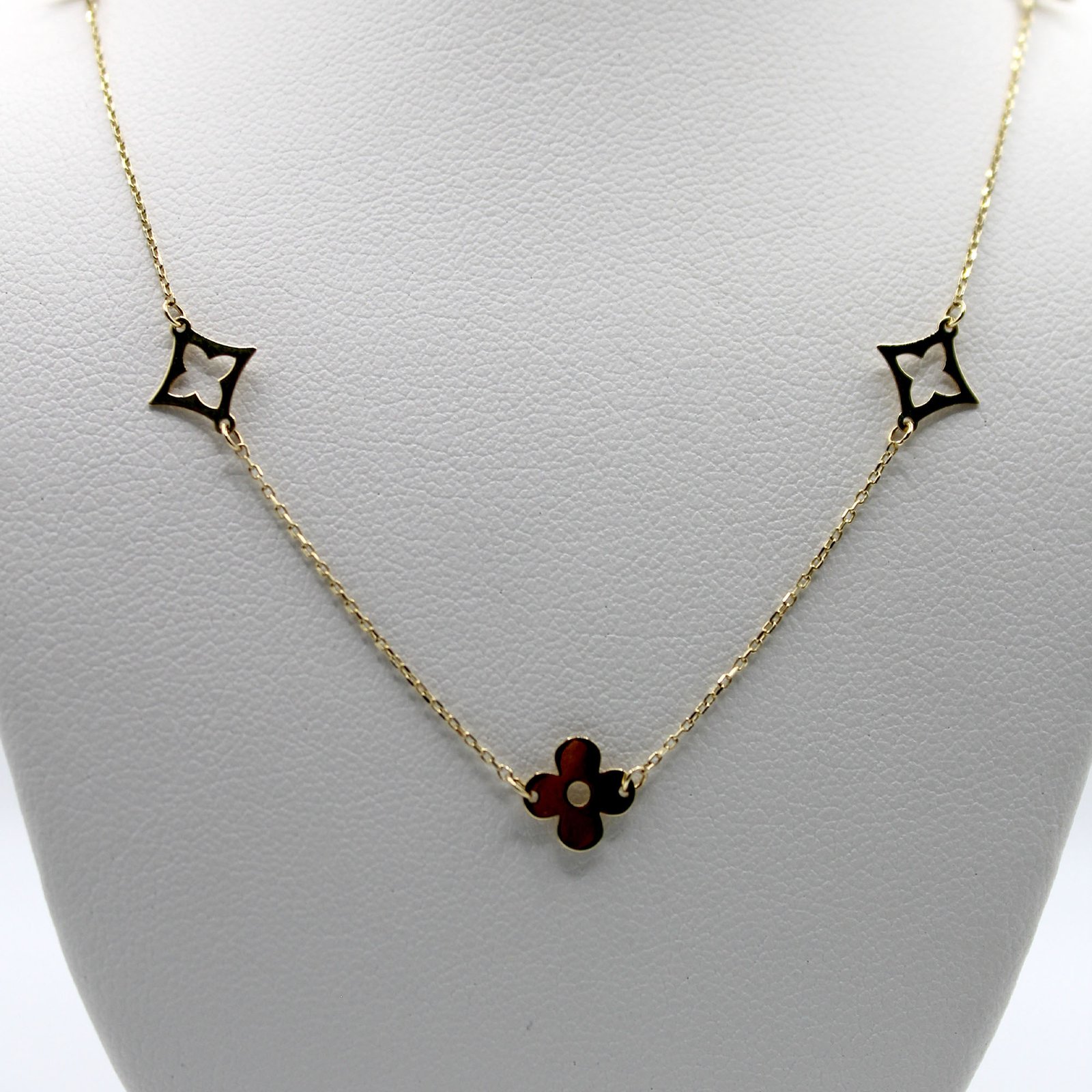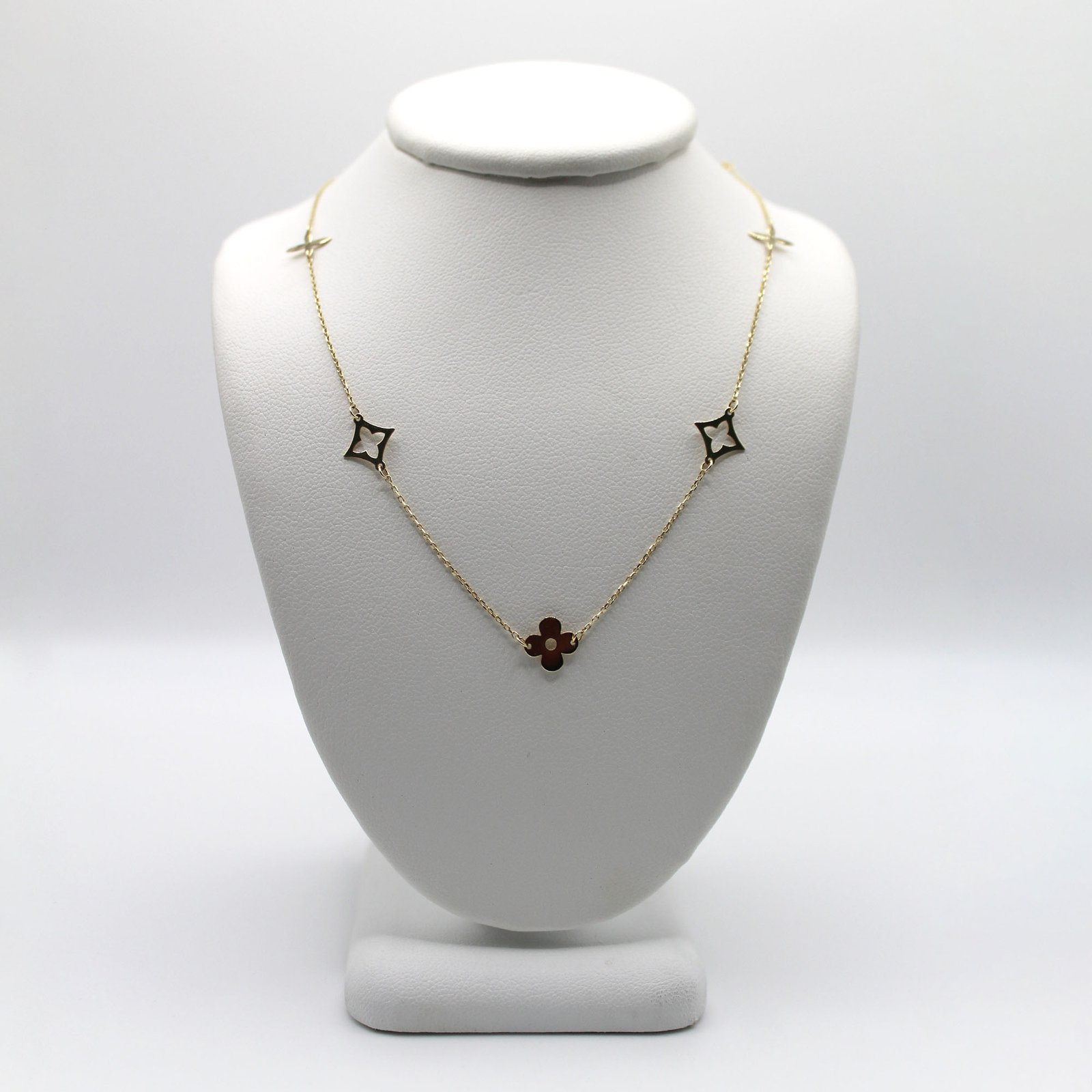 Crafted in warm 10KT yellow gold, this women’s necklace offers an elegant and meaningful station design. The delicate link chain is adorned with small, polished, open-silhouette clover or star motifs that are evenly spaced along the length. The central, slightly larger pendant features the same four-leaf clover silhouette, but is inlaid with a smooth, dark red color stone material, providing a striking focal point and contrast. This piece is perfect for adding subtle sparkle and a sophisticated touch of color to everyday wear, and its minimalist design makes it ideal for comfortable, continuous wear.