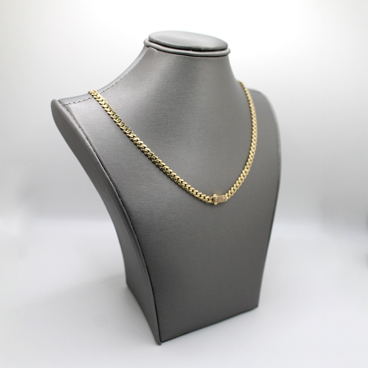 A classic 10KT yellow gold curb link chain featuring a sleek box lock clasp decorated with small white stones.