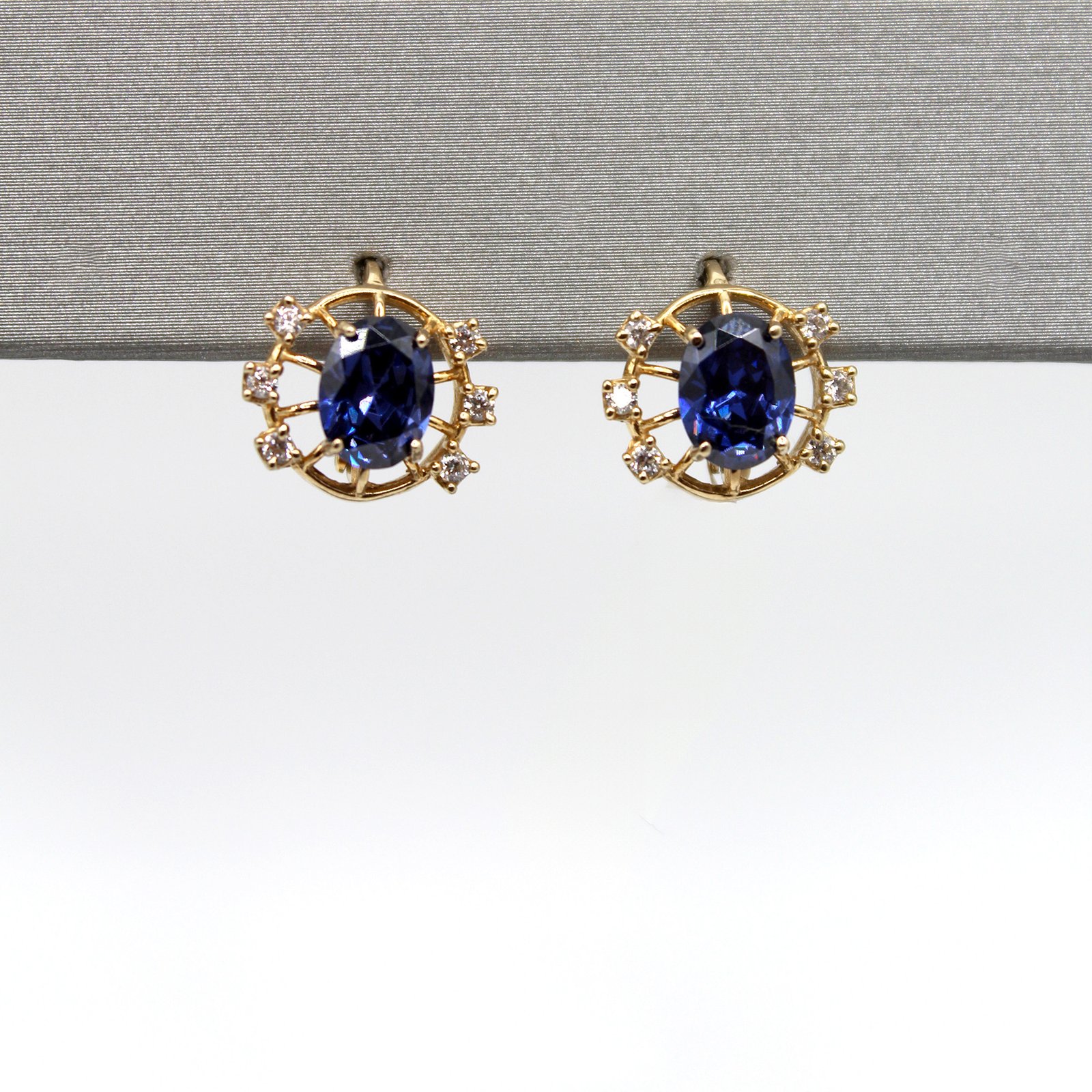 Crafted in warm 10KT yellow gold, these women’s earrings are designed for luxurious glamour. Each piece showcases a prominent oval blue color stone as the focal point, held within an ornate setting. This central stone is framed by a delicate openwork cluster of gold and several small, brilliant white stones, creating a dazzling halo effect. The earrings are secured with a leverback or hinged closure, offering a comfortable and secure fit. These stunning earrings are perfect for adding a sophisticated splash of color and sparkle to formal occasions or evening wear.