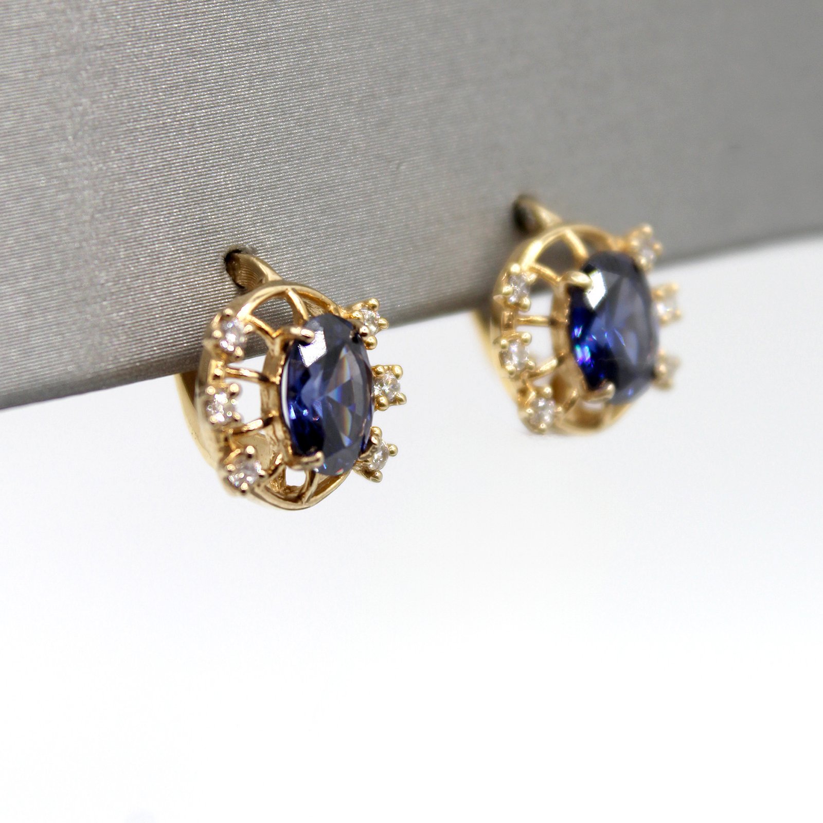 Elegant 10KT gold earrings featuring a large oval blue color stone center surrounded by a striking halo of small white stones.