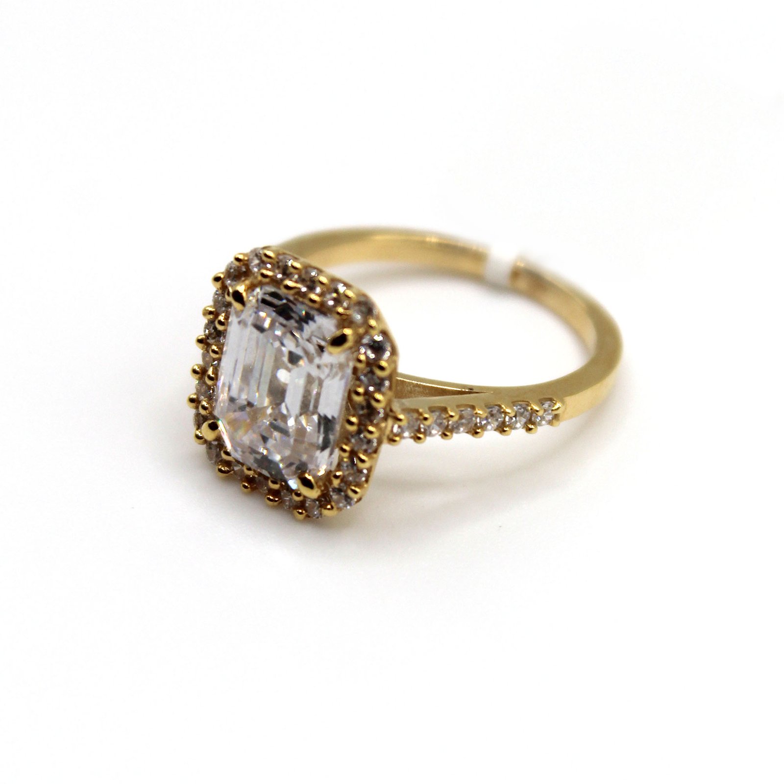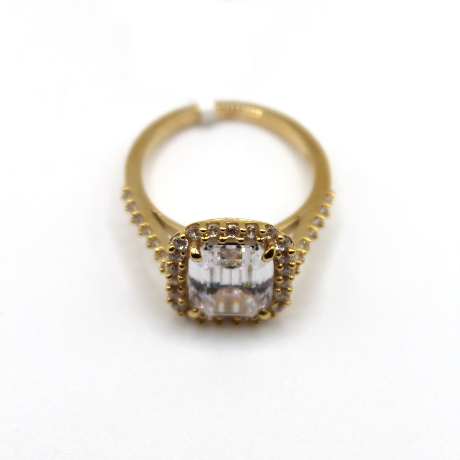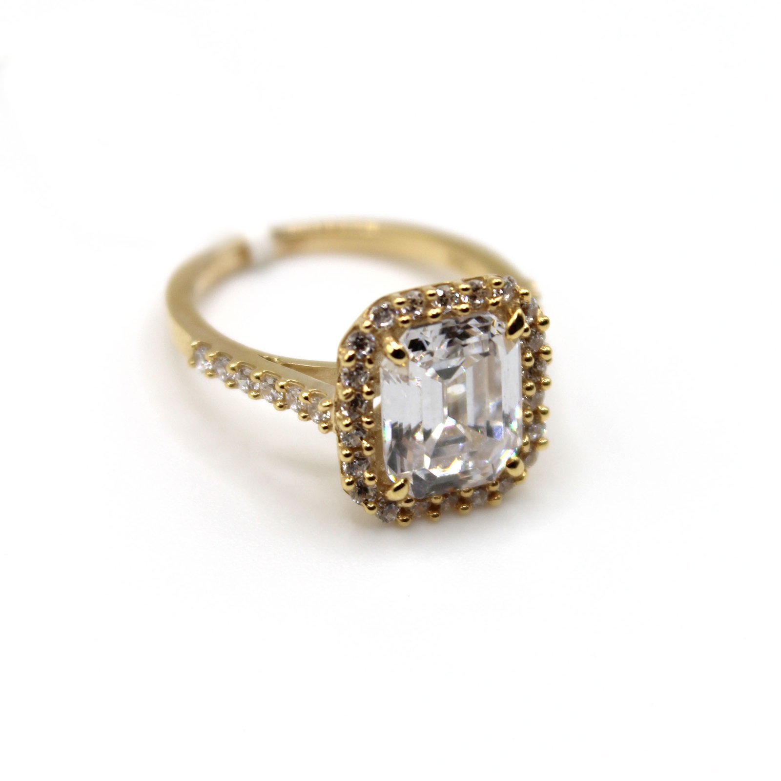 A dazzling 10KT yellow gold women’s engagement ring featuring a large, brilliant cushion-cut white center stone surrounded by a sparkling halo and a pave-accented shank.