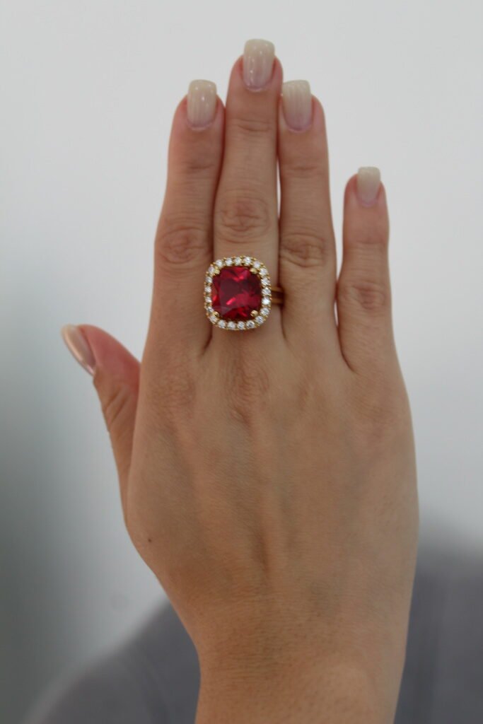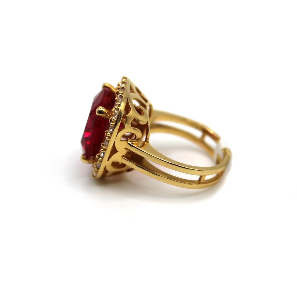 This eye-catching 10KT gold ring is a statement of luxury and elegance. The centerpiece is a striking cushion-cut red stone, deep red hue, beautifully surrounded by white sparkling stones that enhance its brilliance. The sleek gold band complements the bold design, making this ring perfect for special occasions or as a treasured addition to your collection. A piece that radiates sophistication and timeless charm.