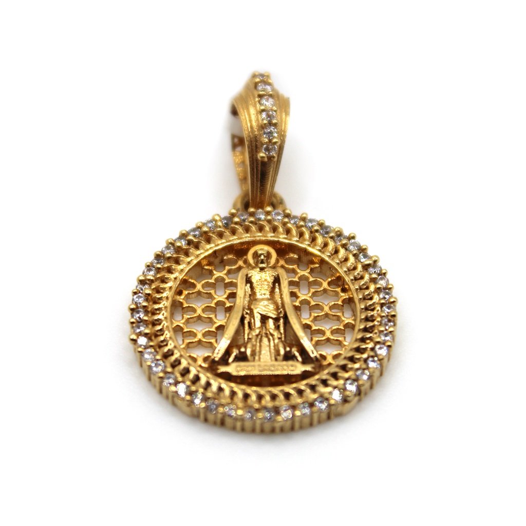 The Sacred Light of San Lázaro pendant is crafted in 10KT yellow gold and features a beautifully detailed image of San Lázaro at the center. Surrounded by a radiant lattice design, the piece is bordered with a sparkling halo of clear zirconia stones, adding brilliance and meaning. The bail is also set with zirconia for a continuous shine. This pendant embodies faith, strength, and healing, making it a cherished symbol to wear daily or gift to a loved one.