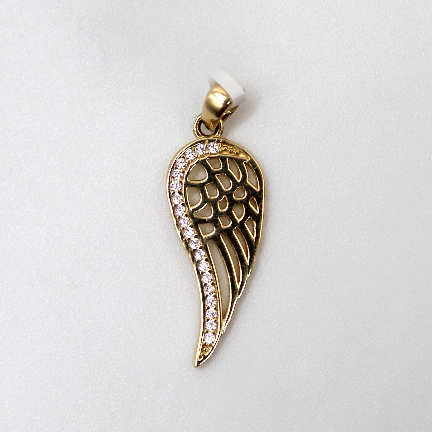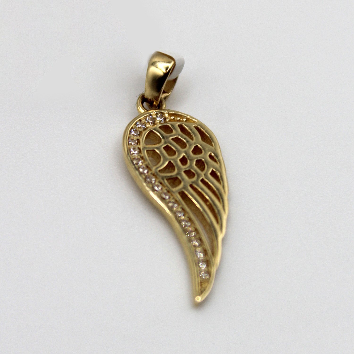 An ethereal 14KT yellow gold angel wing pendant featuring intricate open-work detailing and a brilliant row of diamond accents.