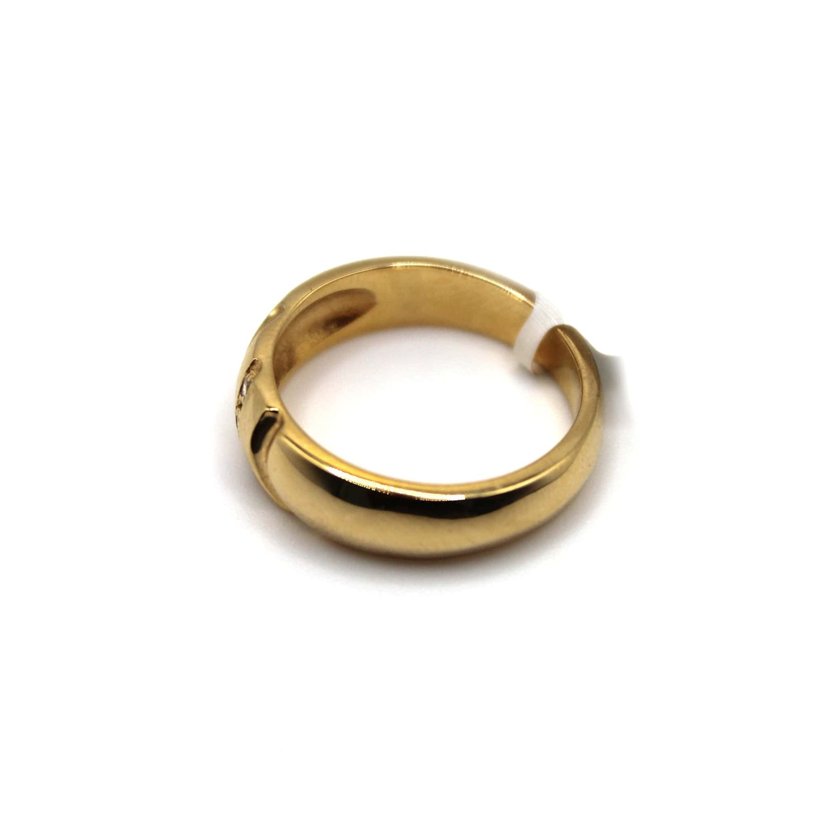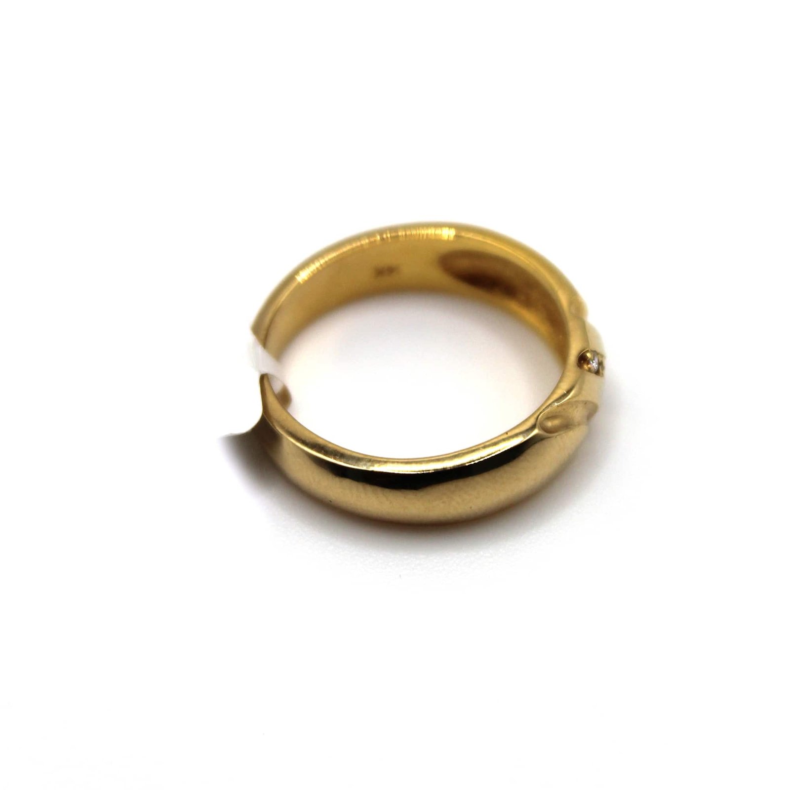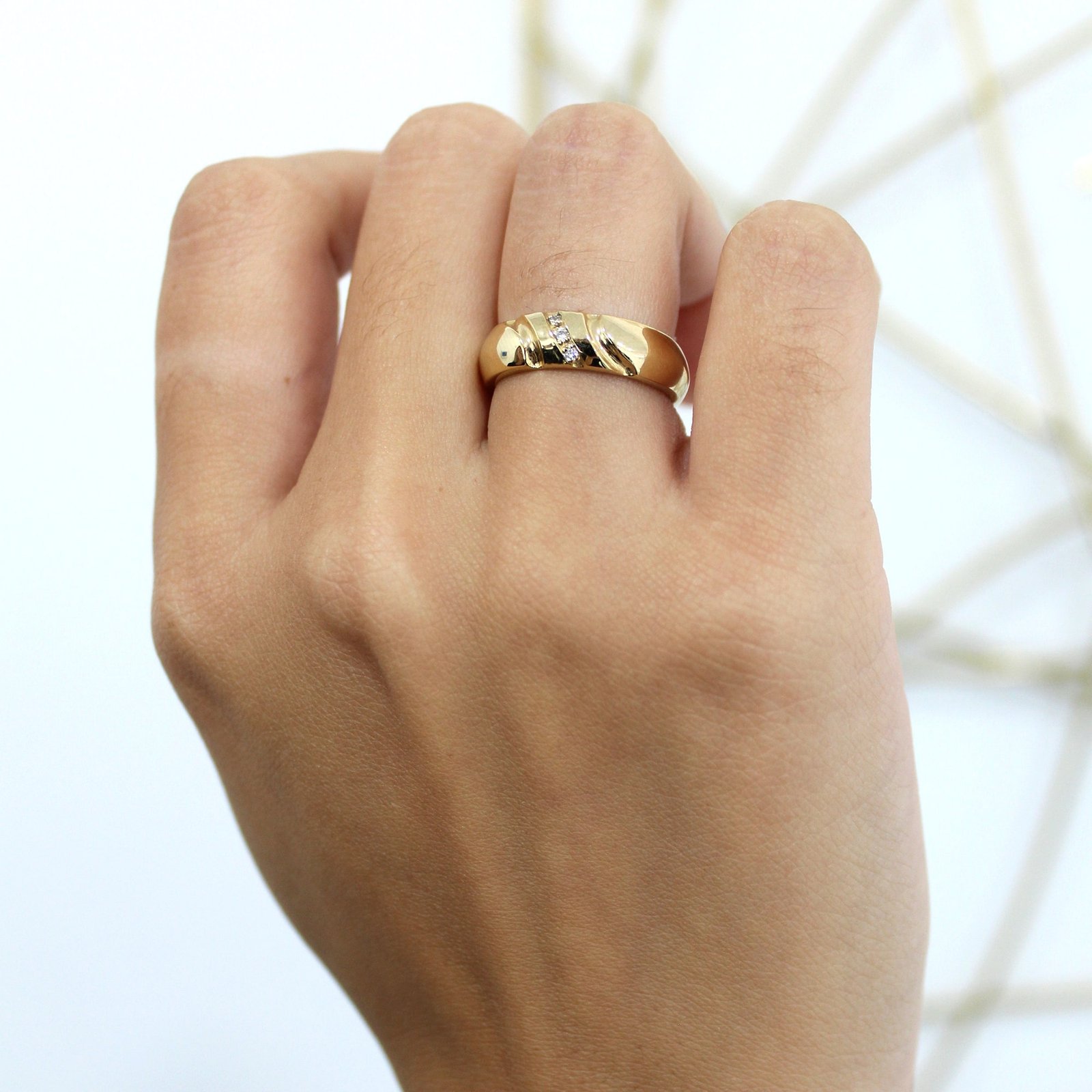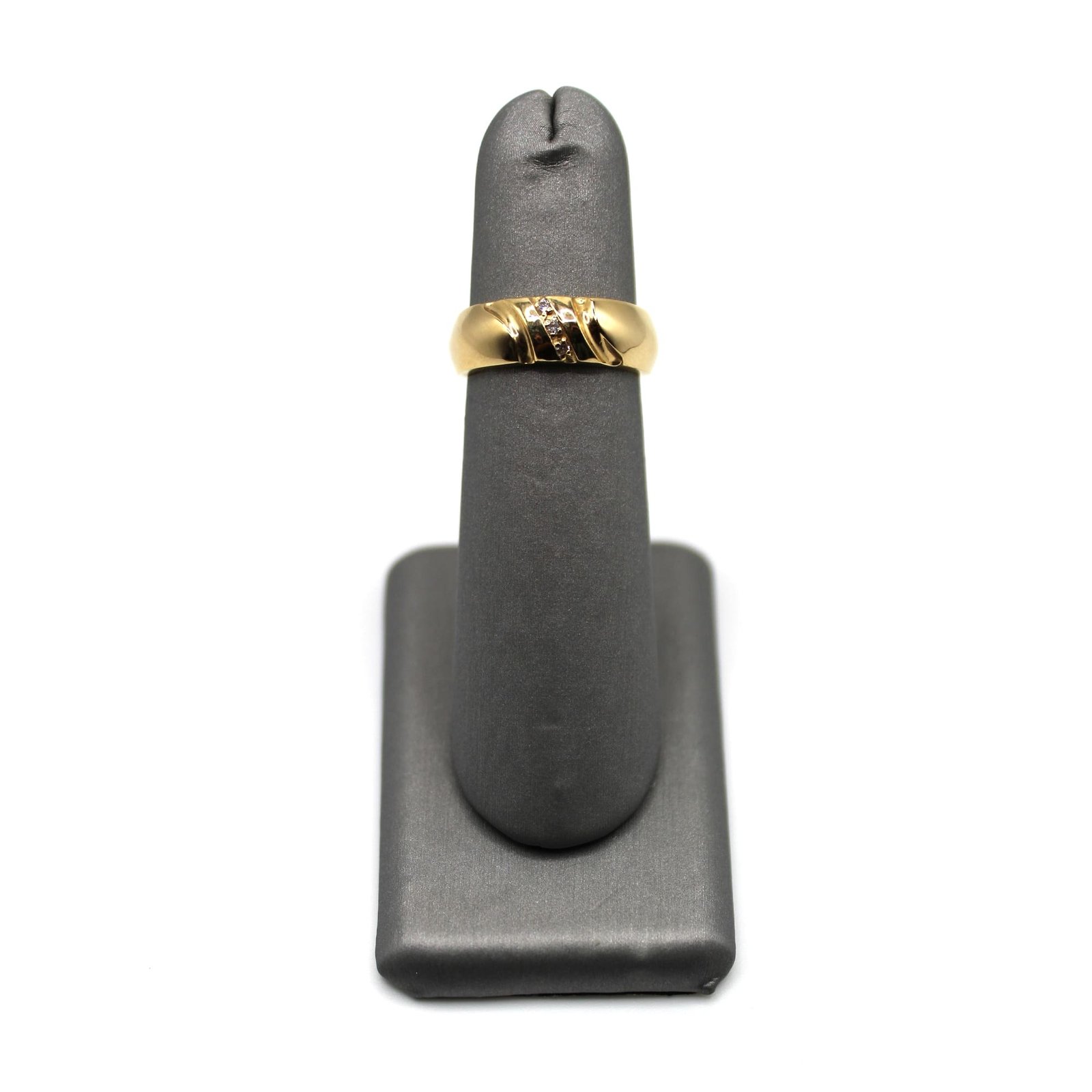 This 14KT gold band ring offers a timeless yet distinctive design. The polished gold surface is elevated by a diagonal arrangement of diamond accents, creating a sophisticated play of shine and structure. Perfect for those who appreciate sleek elegance with a touch of detail, this ring is ideal for daily wear or as a symbolic piece.