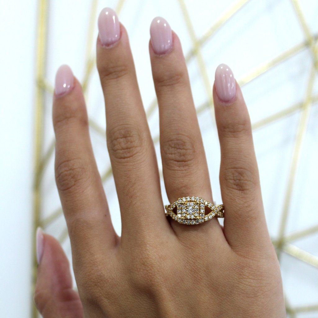 This exquisite 14KT gold ring showcases a bold square-shaped cluster of diamonds at its center, framed by shimmering side stones for added brilliance. The intricate split-shank design adds depth and sophistication, making this ring stand out with timeless elegance. Perfect as a statement accessory, anniversary gift, or promise ring, its versatile style complements both casual and formal looks.
