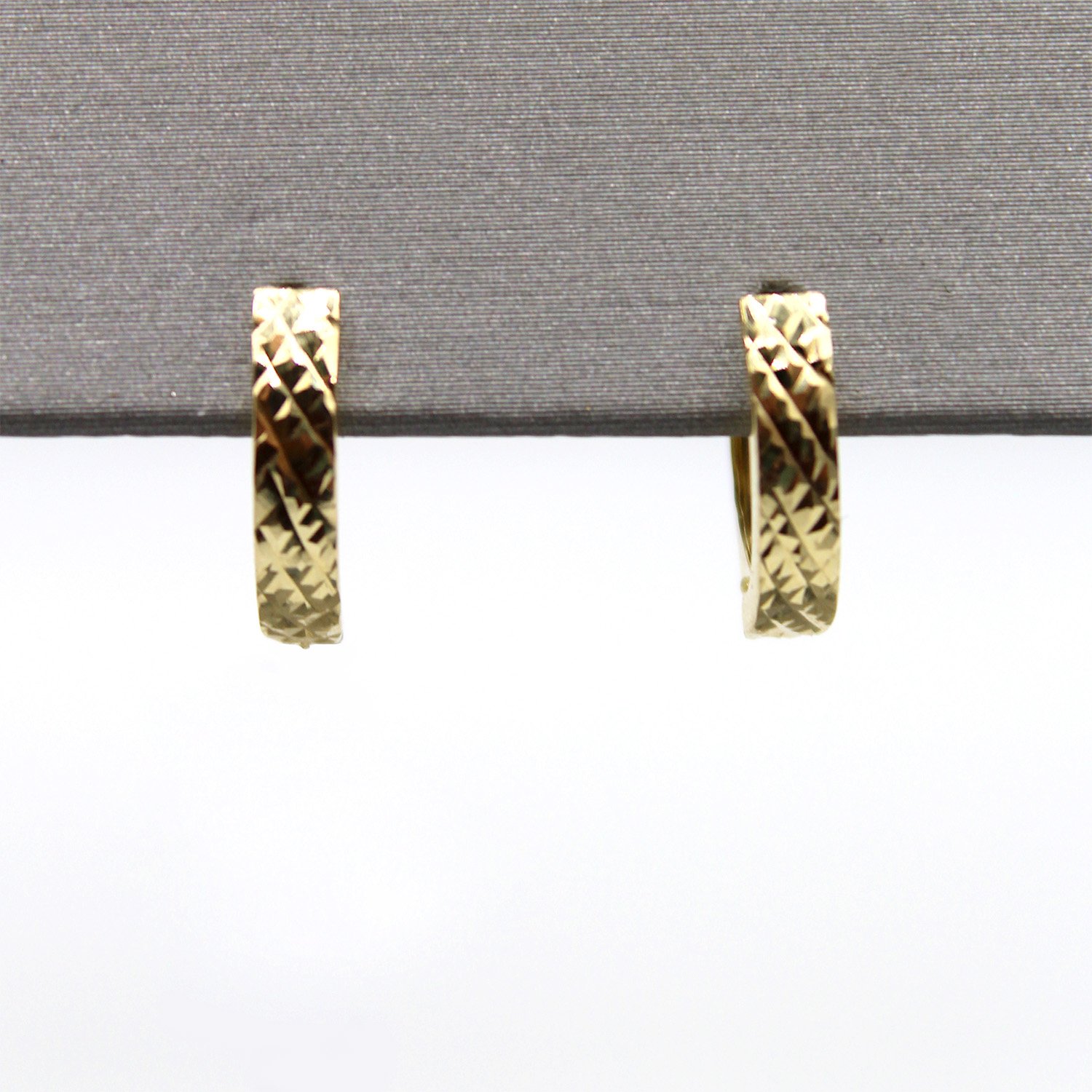A sophisticated pair of 10KT yellow gold huggie-style hoop earrings featuring an intricate diamond-cut geometric pattern for maximum sparkle.