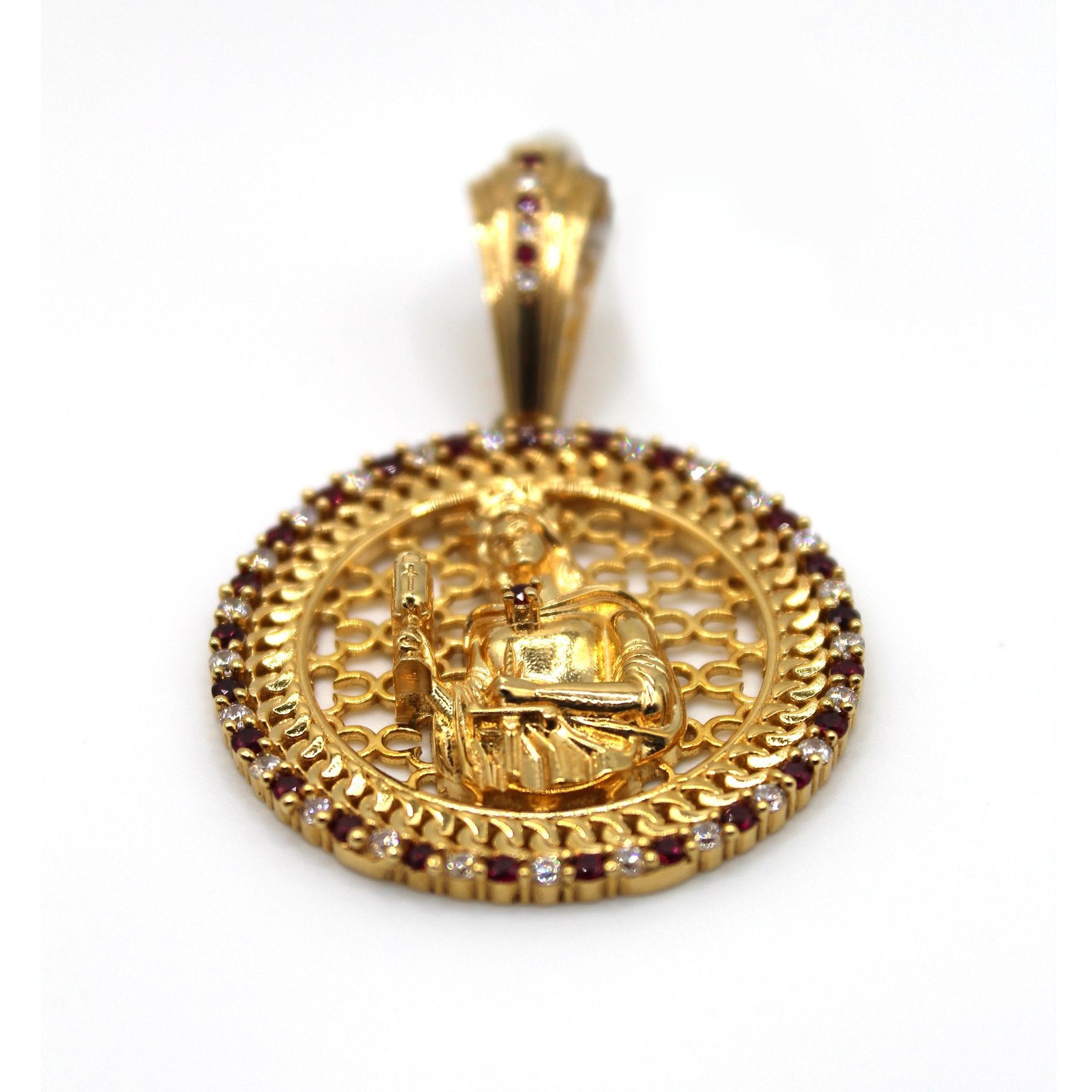 The Divine Guardian pendant is a striking 10KT yellow gold piece depicting Santa Barbara, beautifully framed with a circular border of shimmering zirconia stones. The intricate lattice background and radiant stone accents highlight the strength and devotion embodied by Santa Barbara, making this pendant both a powerful symbol of faith and a refined statement piece. Crafted with precision, it offers both elegance and spiritual significance, perfect for daily wear or as a cherished gift.