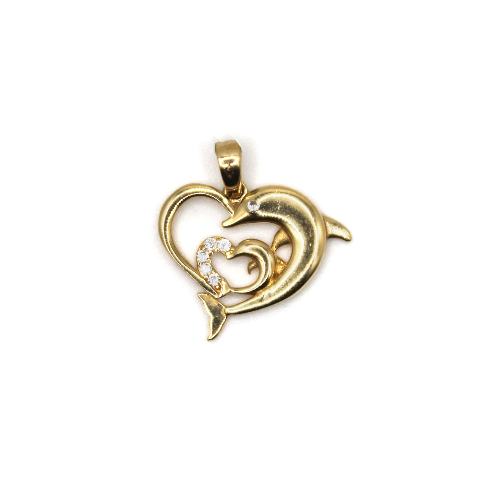 This Dolphin Heart Pendant is crafted in 14KT yellow gold, symbolizing love, harmony, and joy. The design features a graceful dolphin forming a heart with its body, enhanced by shimmering zirconia accents for extra brilliance. Perfect as a gift for ocean lovers or as a meaningful token of affection, this pendant adds a playful yet elegant charm to any look.