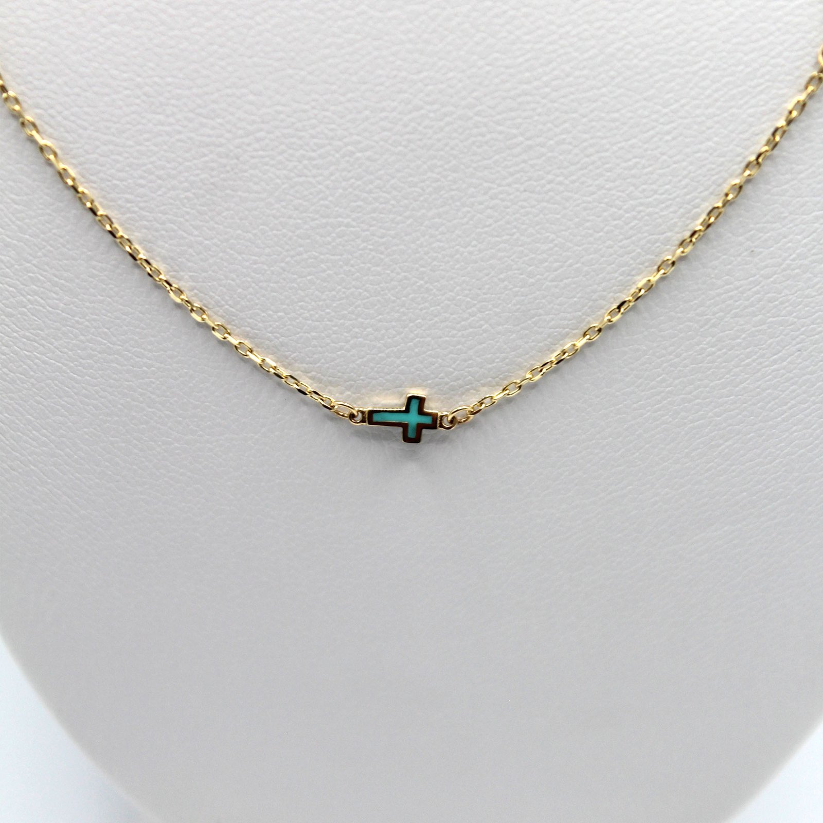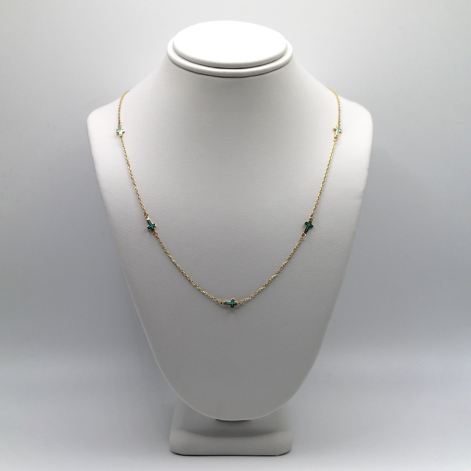 A 14KT gold necklace featuring delicate green cross accents for a subtle yet striking look.