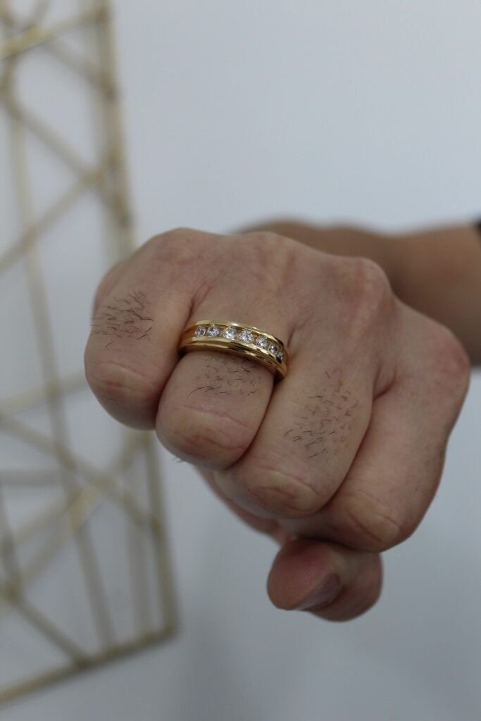 A bold 14KT men’s ring featuring a sleek channel of shimmering zirconia.