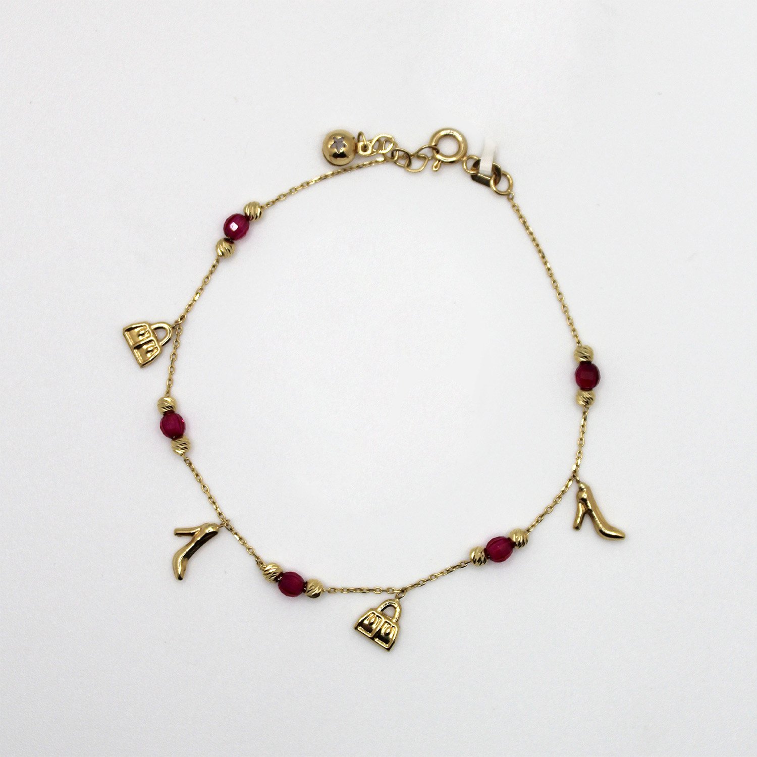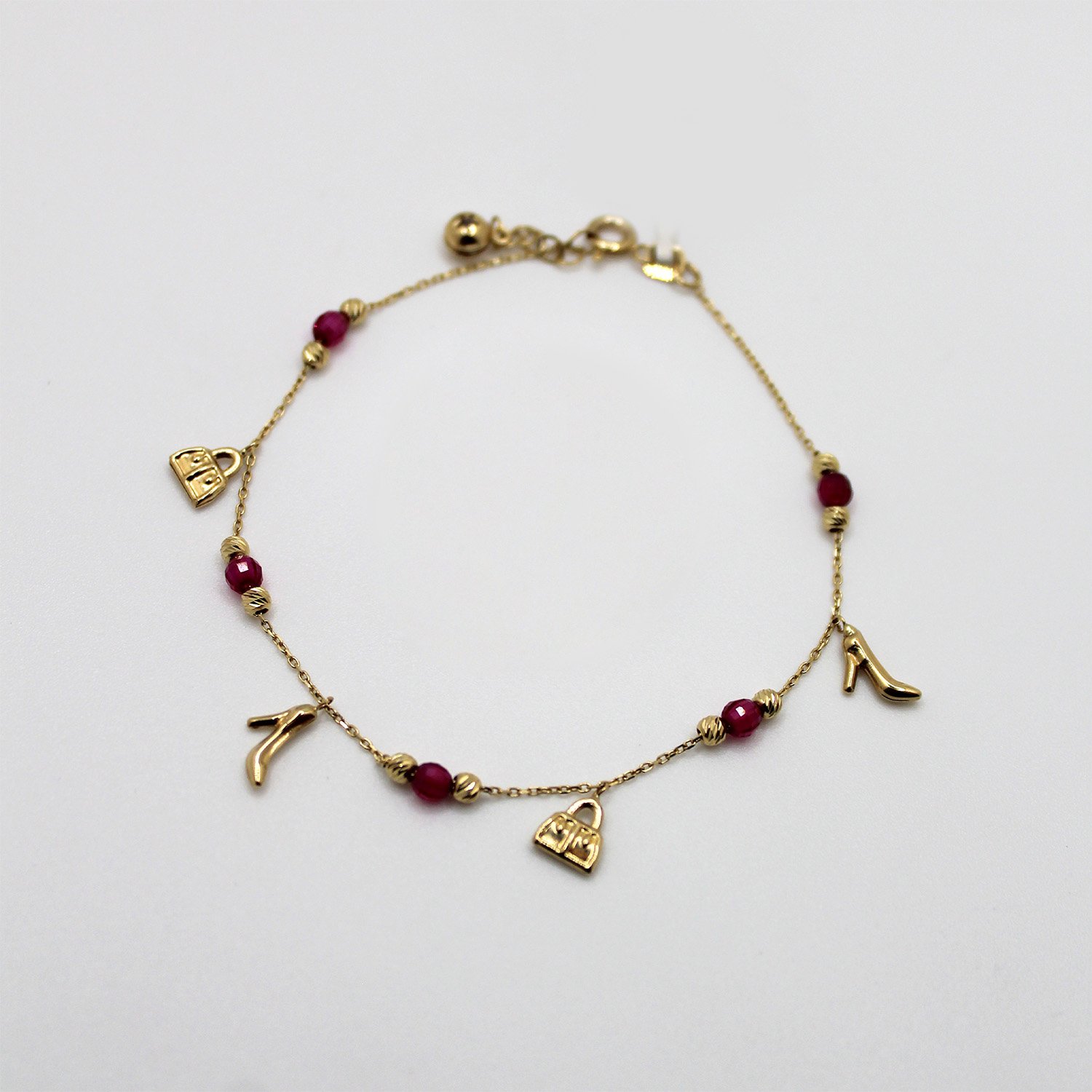 A stylish 14KT yellow gold charm bracelet featuring high heel and handbag charms accented with vibrant pink beads.