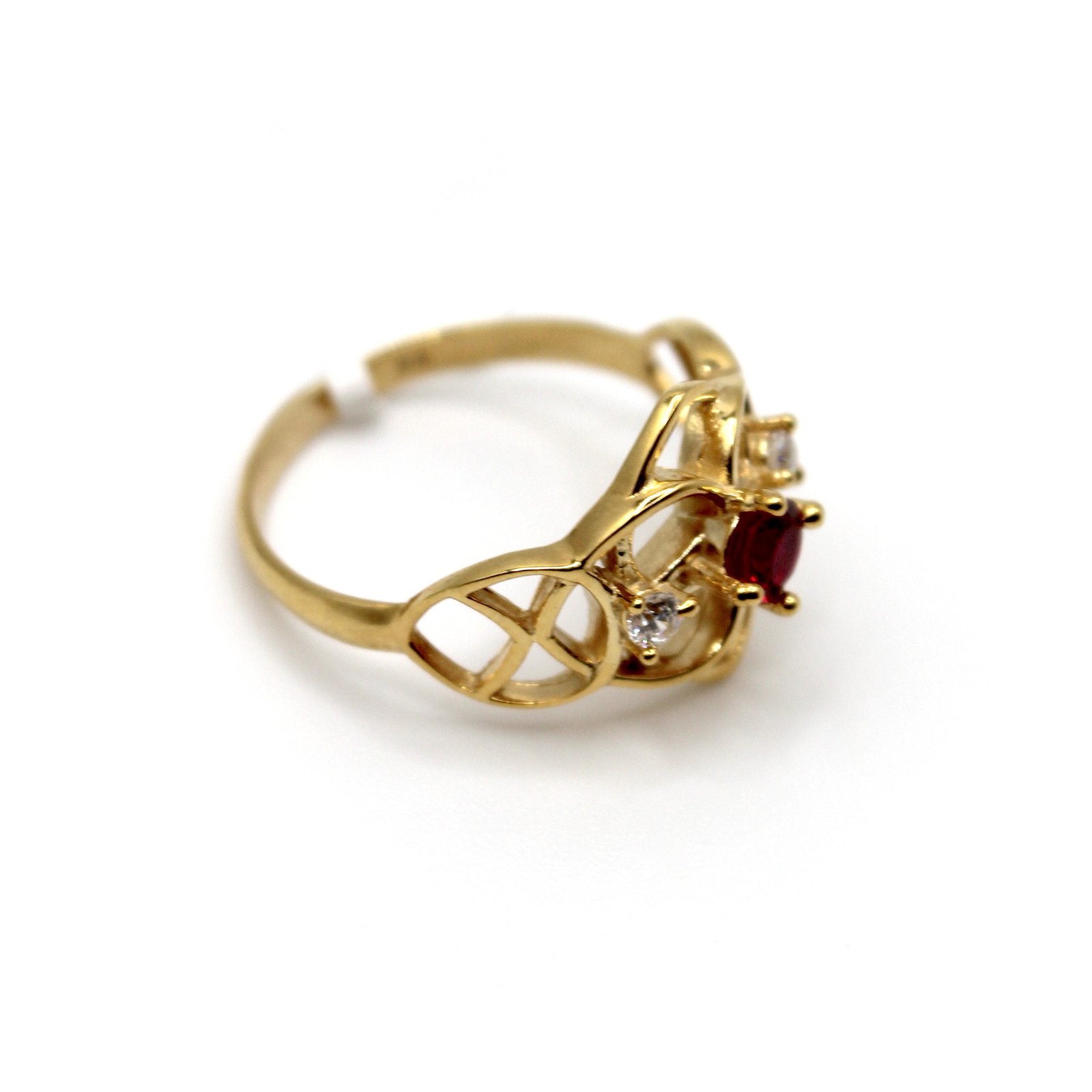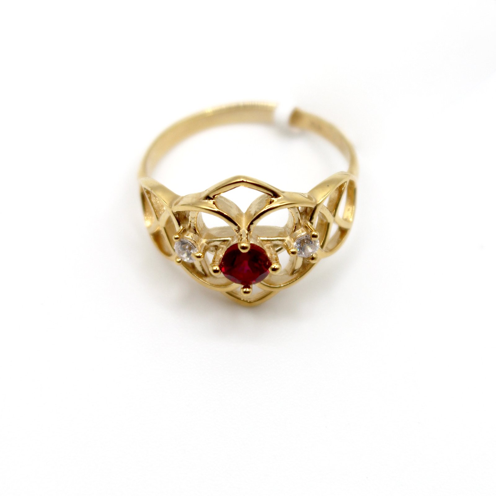 Elegant 10KT gold filigree ring featuring an open, floral-inspired design centered with a vibrant red stone and flanked by two clear stone accents.