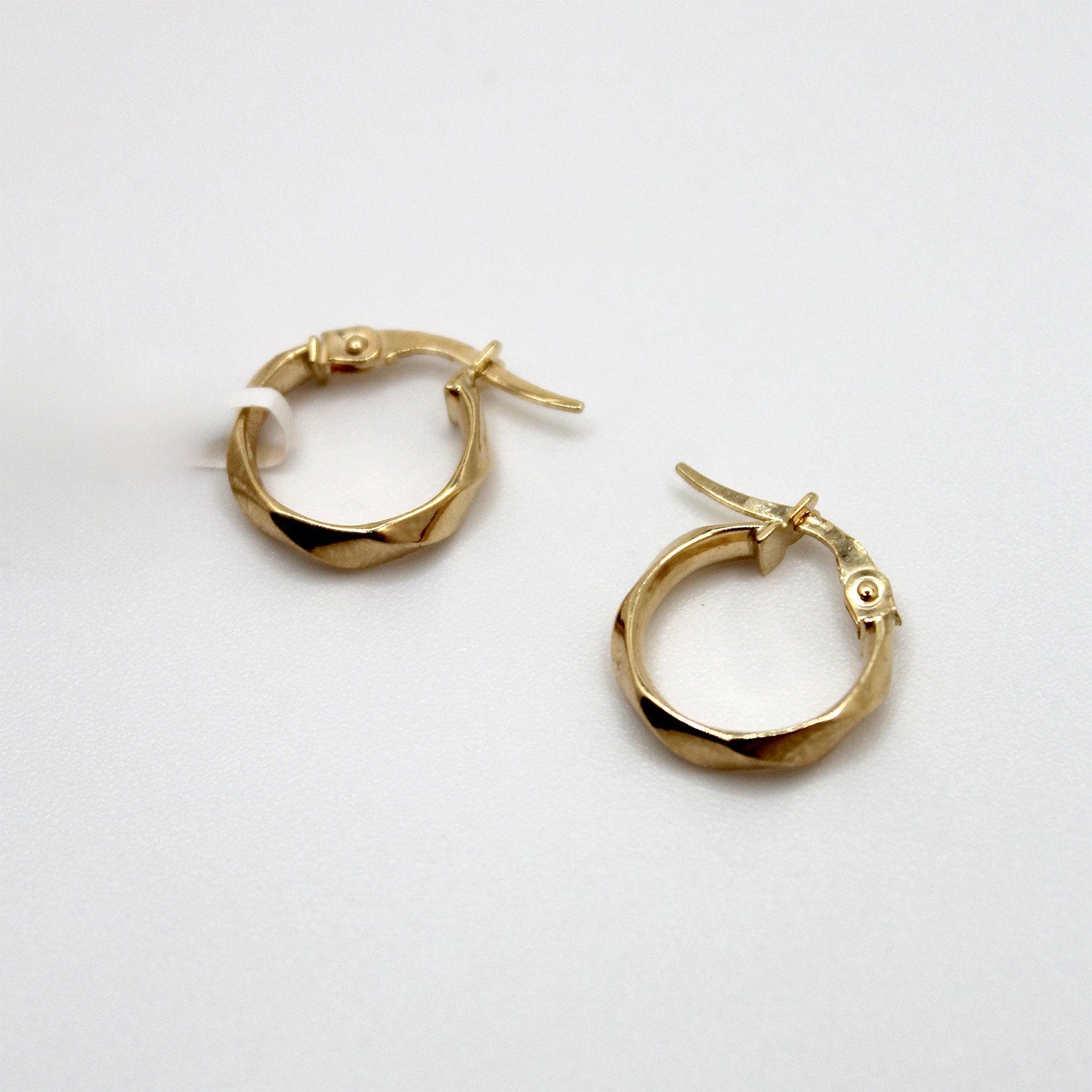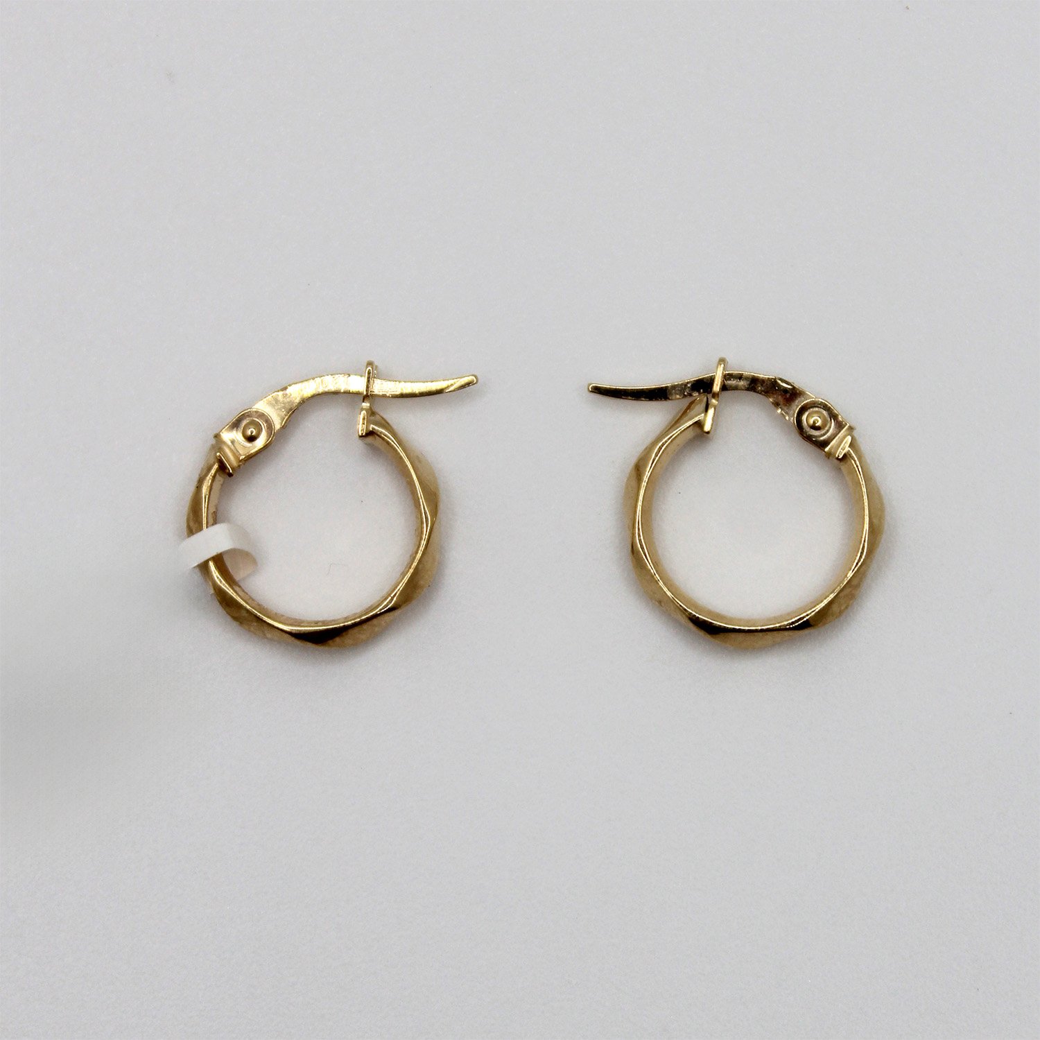 A modern pair of 10KT yellow gold hoop earrings with a small, flat-sided geometric shape and a shiny finish.
