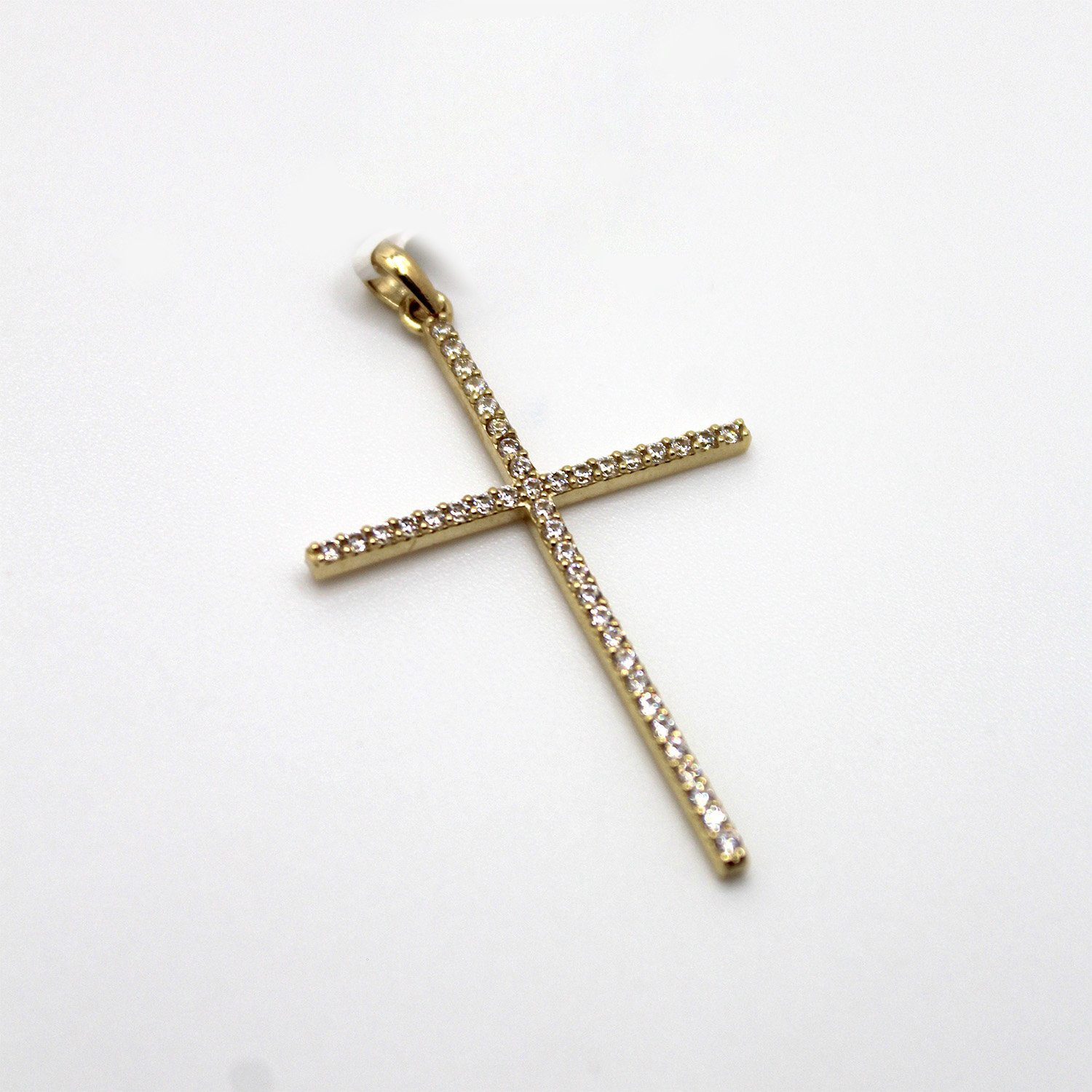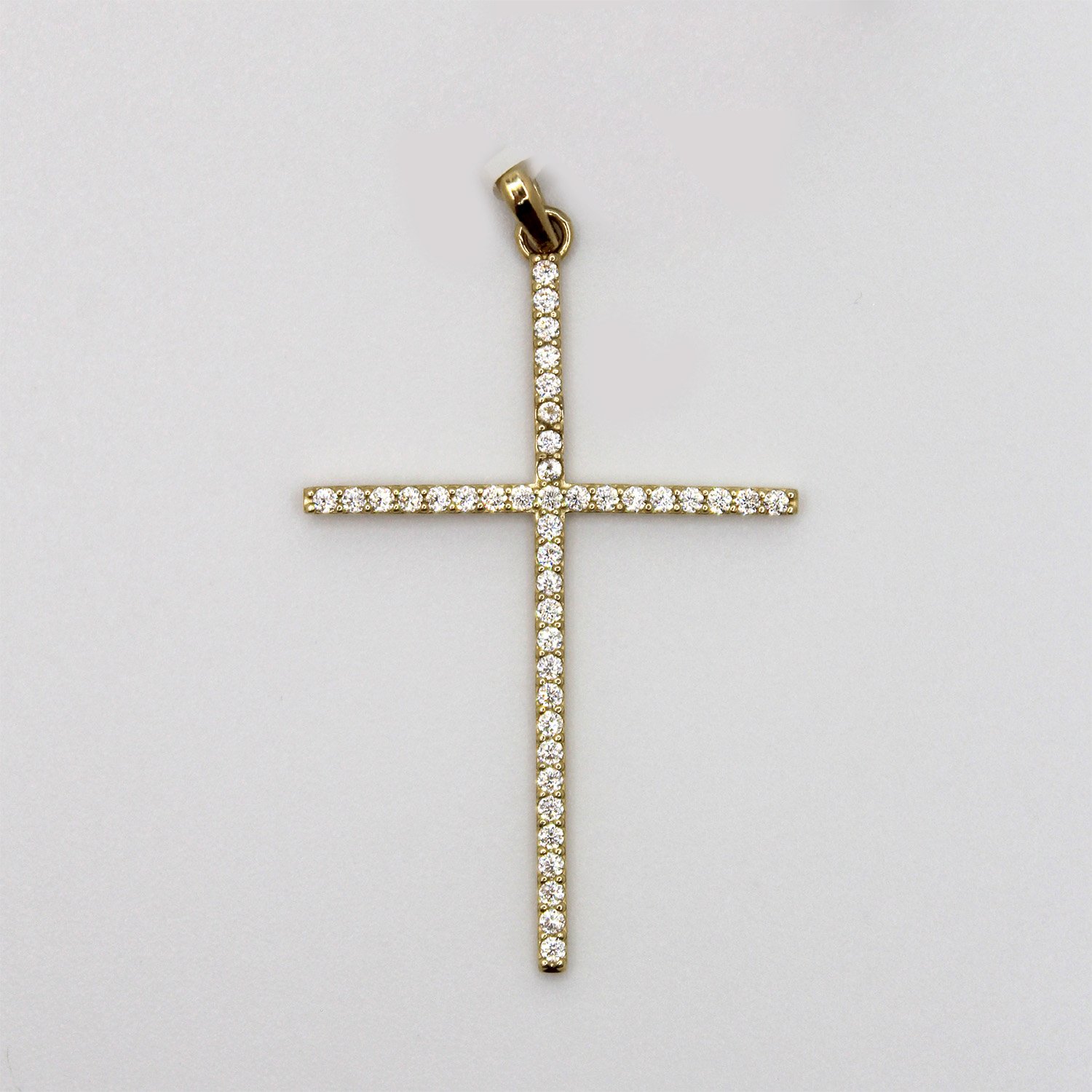 A delicate 10KT yellow gold cross pendant featuring a slender silhouette fully set with sparkling white stones.