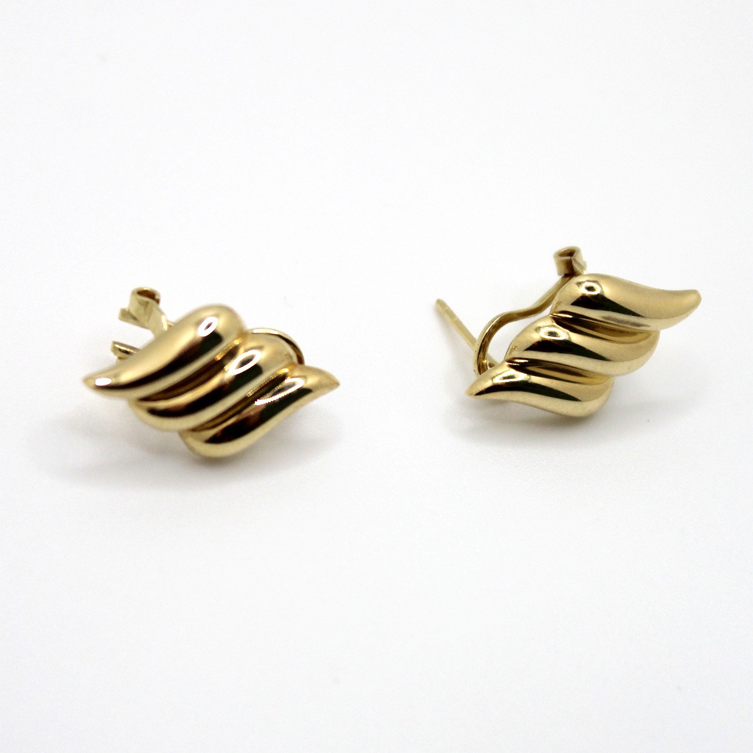 A stylish pair of 10KT yellow gold stud earrings featuring a curved, three-layered fan design with a shiny, polished finish.