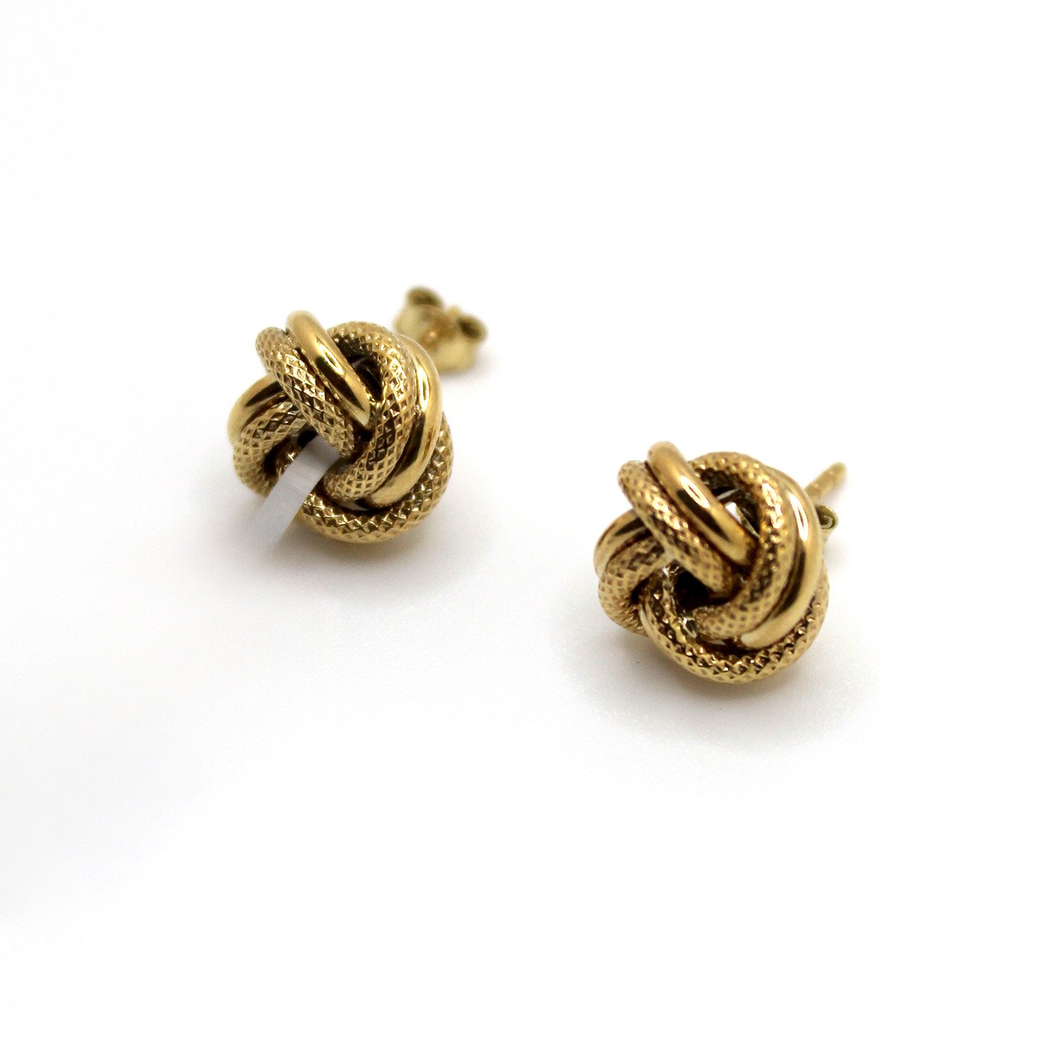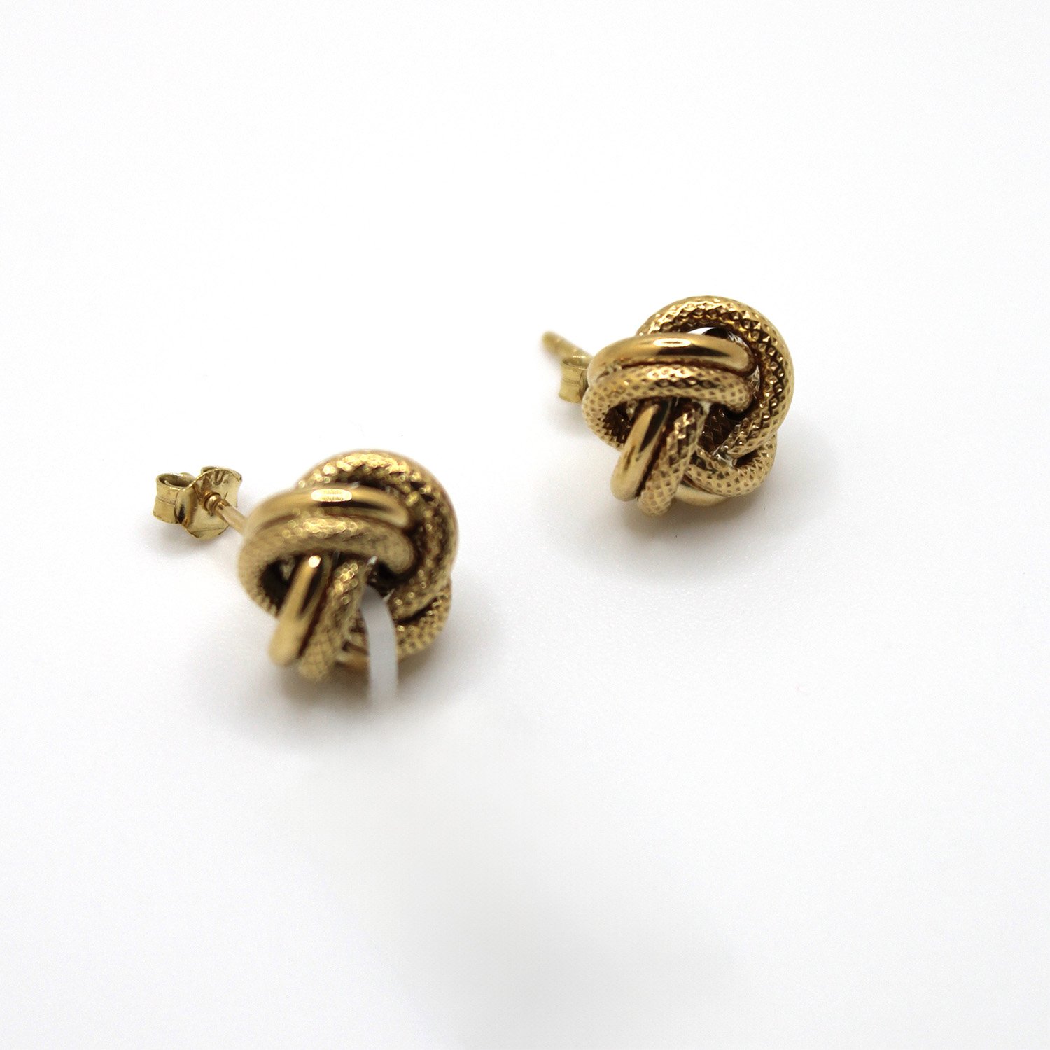 A classic pair of 10KT yellow gold stud earrings in a love knot design with a mix of smooth and textured finishes.