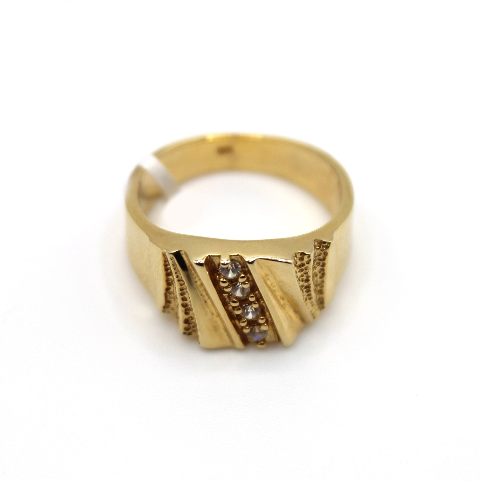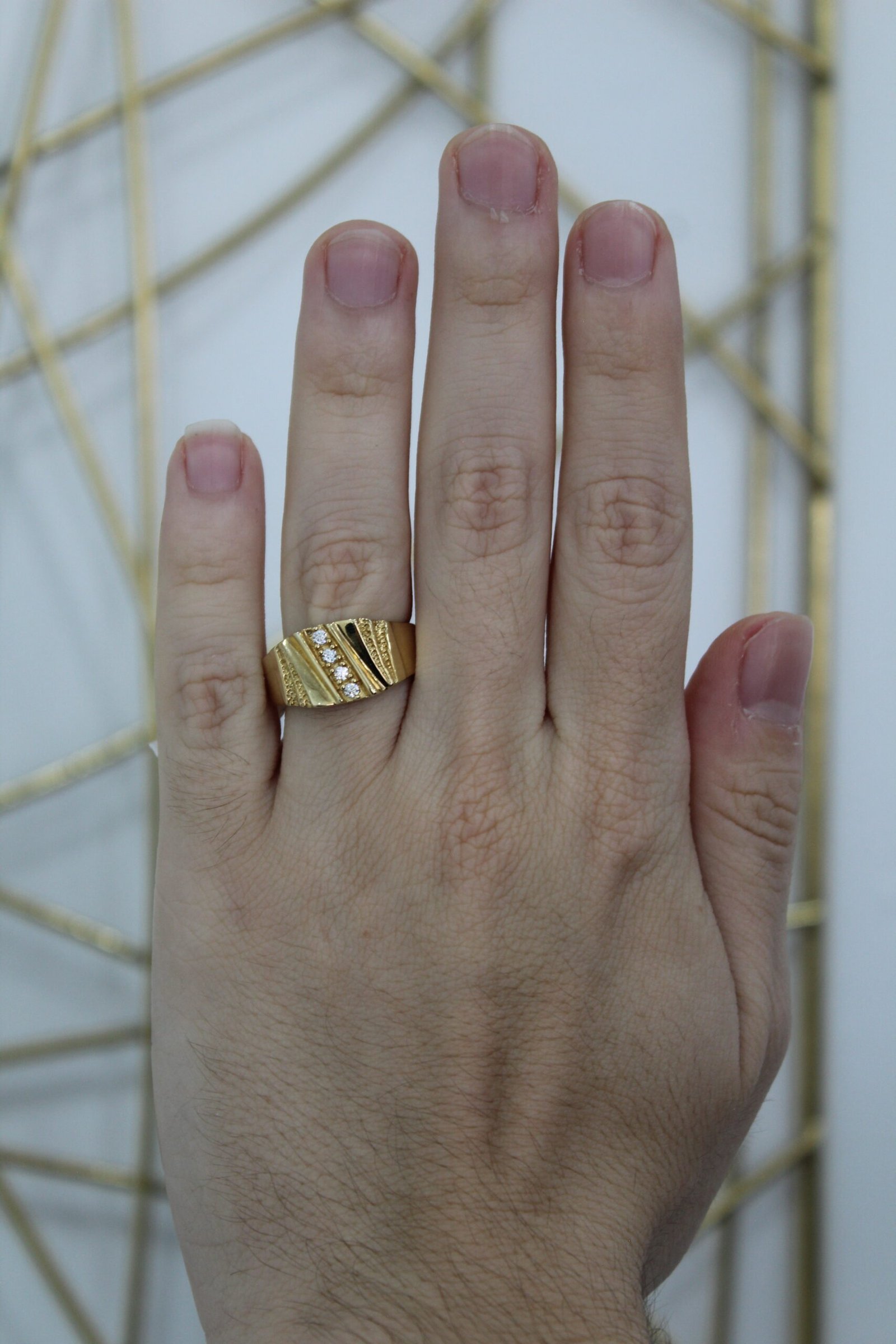 Golden Apex is a striking men’s ring crafted in 10KT yellow gold. Its powerful design features sharp, angled cuts across the band, leading to a trio of vertical zirconia stones at the center. The textured accents along the sides enhance its depth and dimension, giving it a rugged yet refined appeal. Golden Apex is the perfect balance of strength and style, making it a bold statement piece for the modern man.