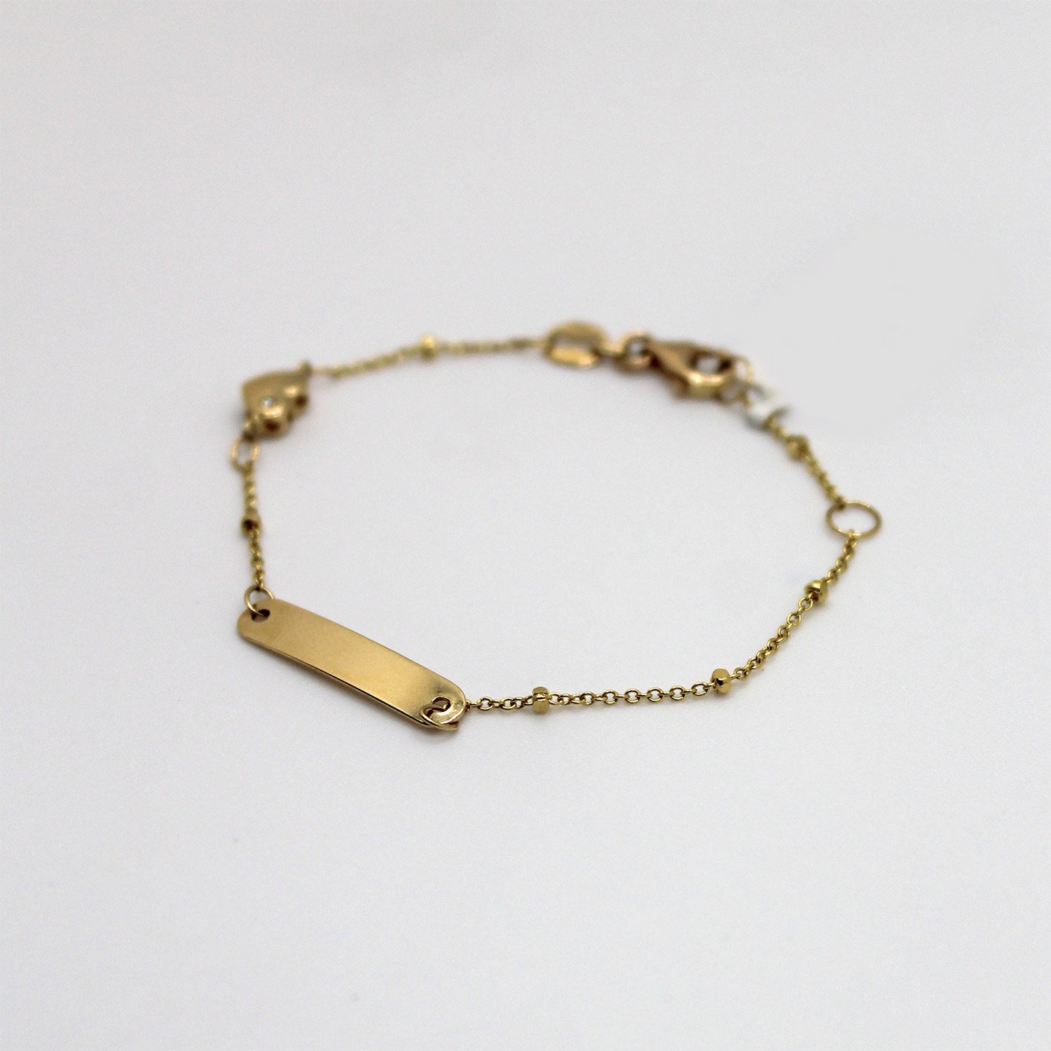 A charming 14KT yellow gold ID bracelet featuring a polished engravable plate, a petite heart charm with a sparkling stone, and a delicate station chain.