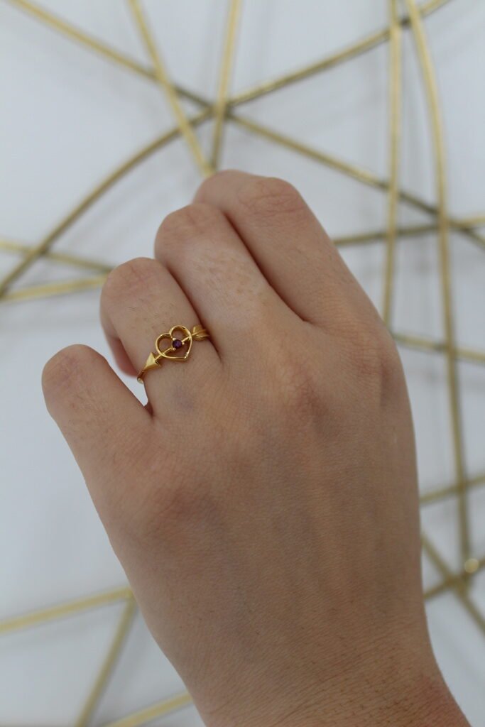 A dainty 14KT gold heart ring featuring a single Red Stone at its center, symbolizing love and passion.