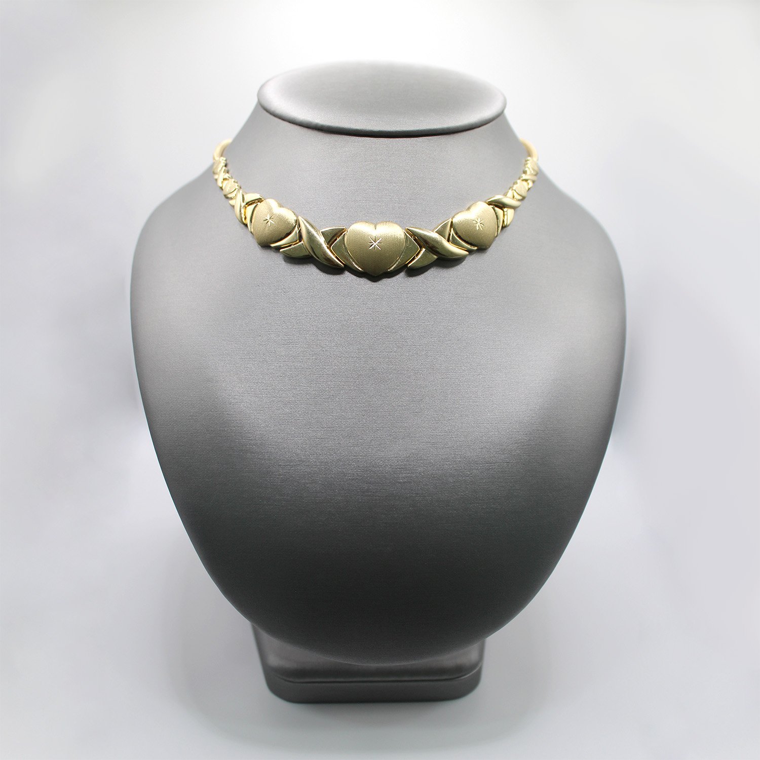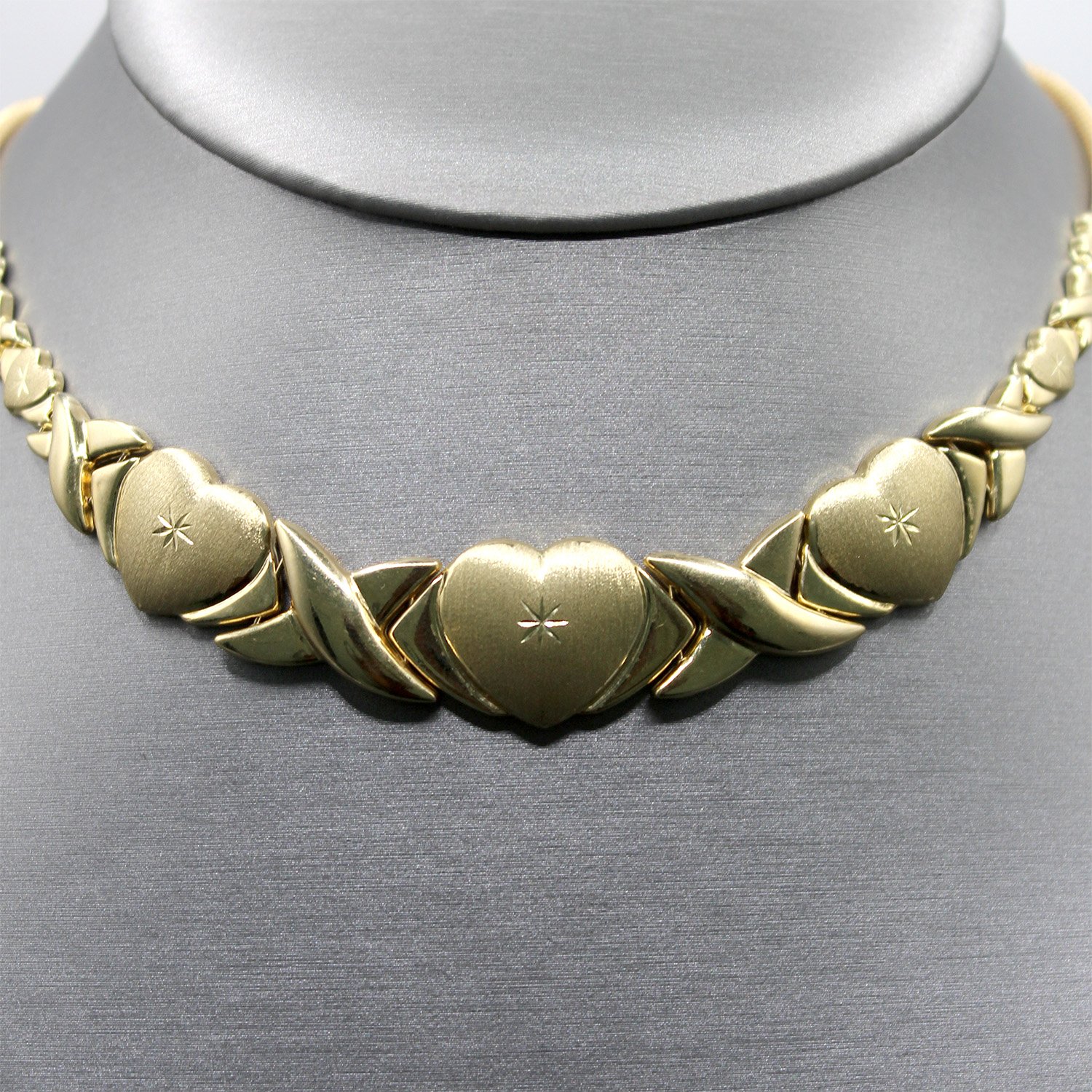 A charming 10KT yellow gold choker necklace featuring a romantic “X” and heart link design with a mix of brushed and polished finishes.