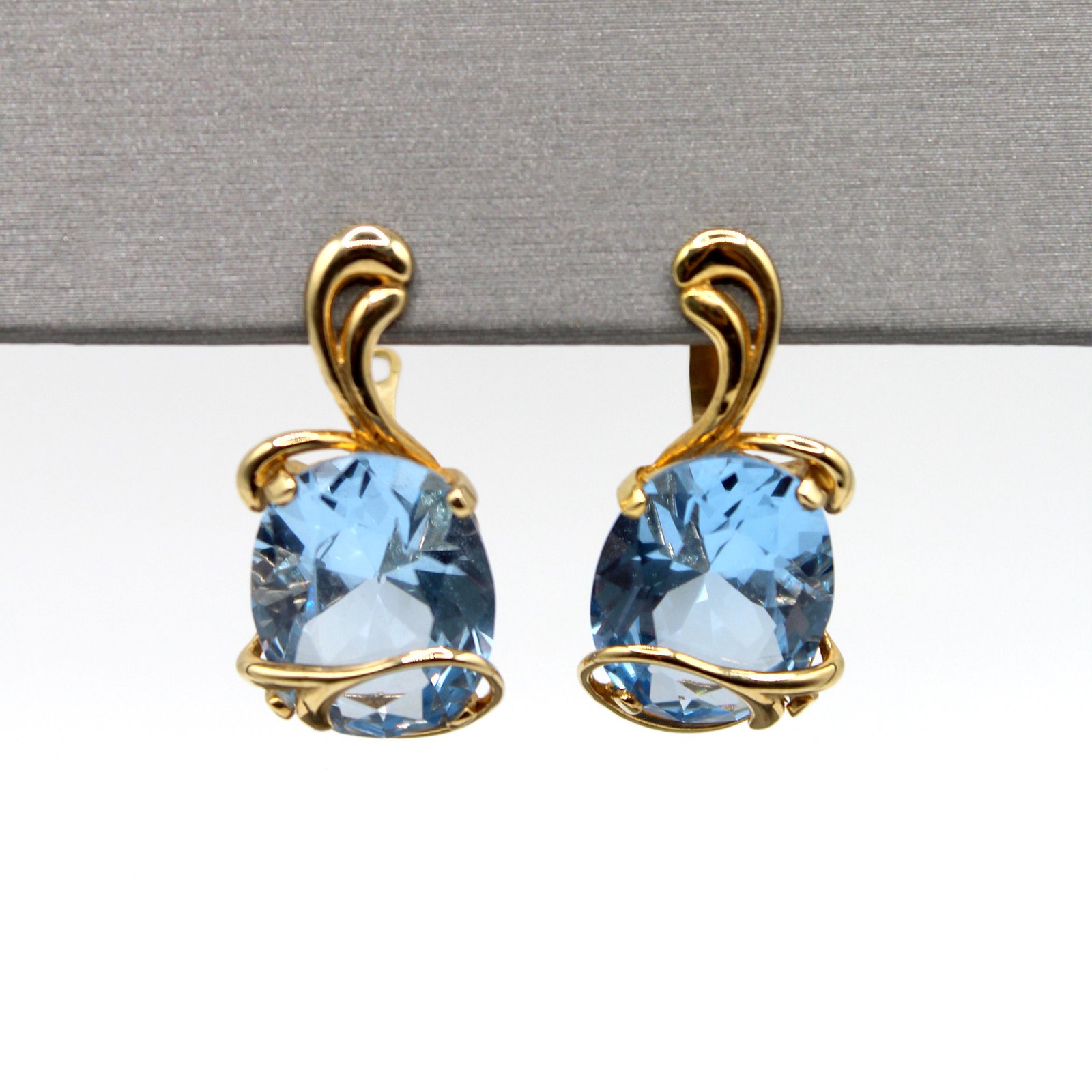 Crafted in warm 10KT yellow gold, these women’s earrings are designed to make a luxurious statement. Each earring showcases a substantial, beautifully faceted cushion-cut blue color stone, which displays exceptional light and clarity. The stone is held by a distinctive swirl or ribbon-style gold setting that flows up to the post, giving the piece a sophisticated, continuous drop look. Secured with a sturdy post closure, these stunning earrings are perfect for adding a bold splash of color and timeless elegance to any evening or special occasion ensemble.