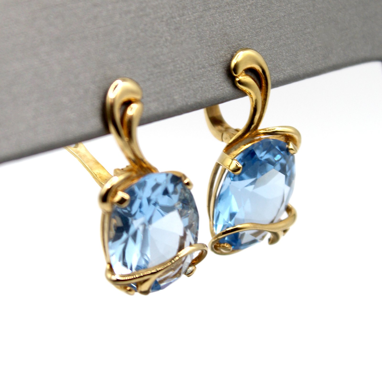 Elegant 10KT gold earrings featuring a captivating, large, cushion-cut blue color stone set in a gracefully curved gold mounting.