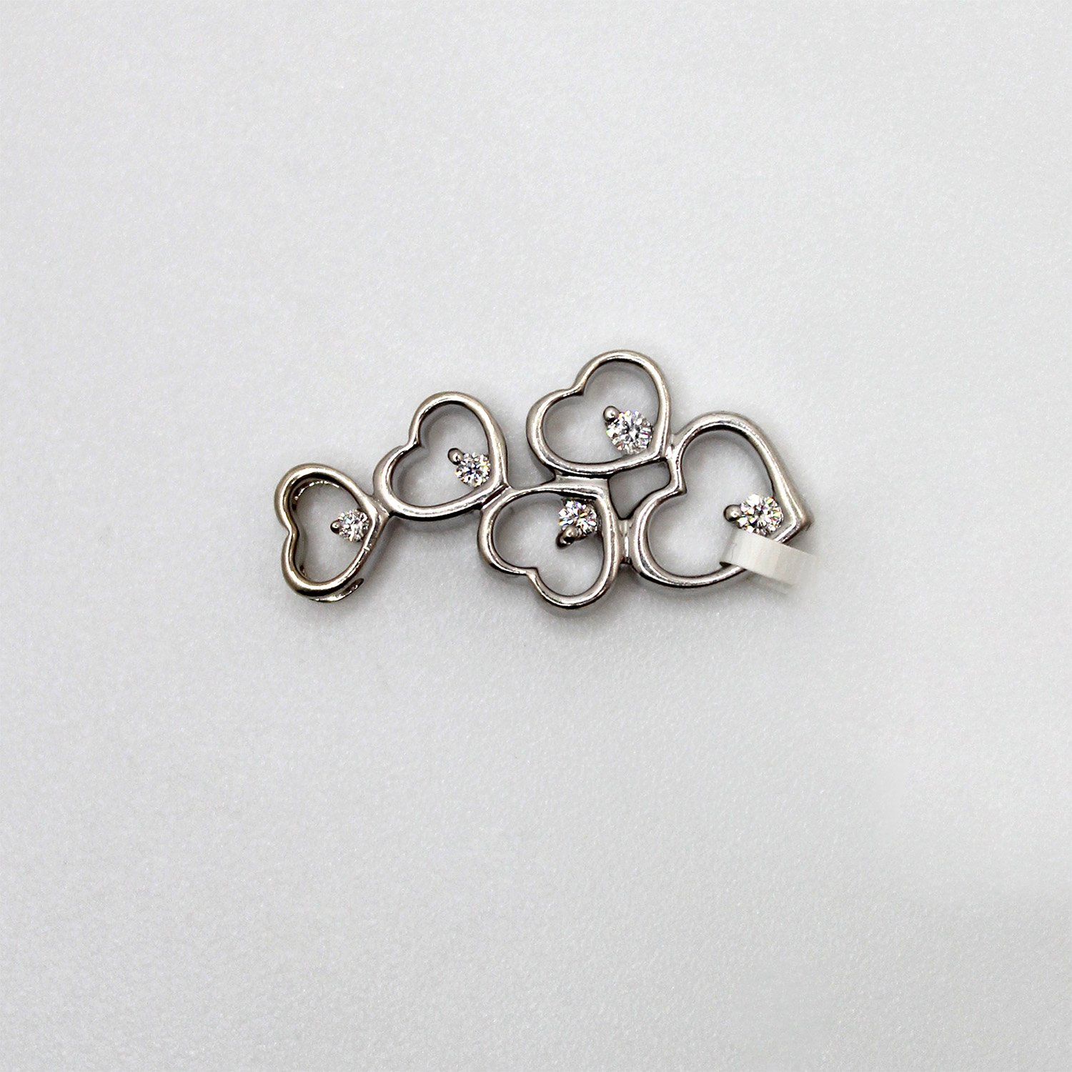 An elegant 10KT white gold pendant featuring five interlocking open hearts, each accented with a sparkling 0.10ct total weight diamond.