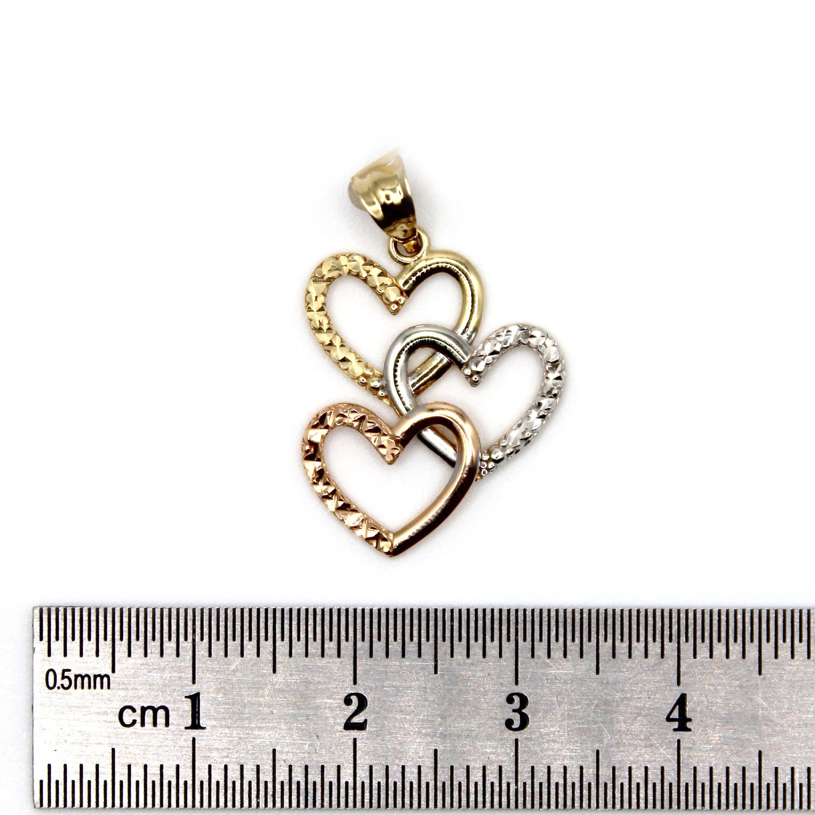 14KT gold pendant with three interlocking hearts in yellow, white, and rose tones.