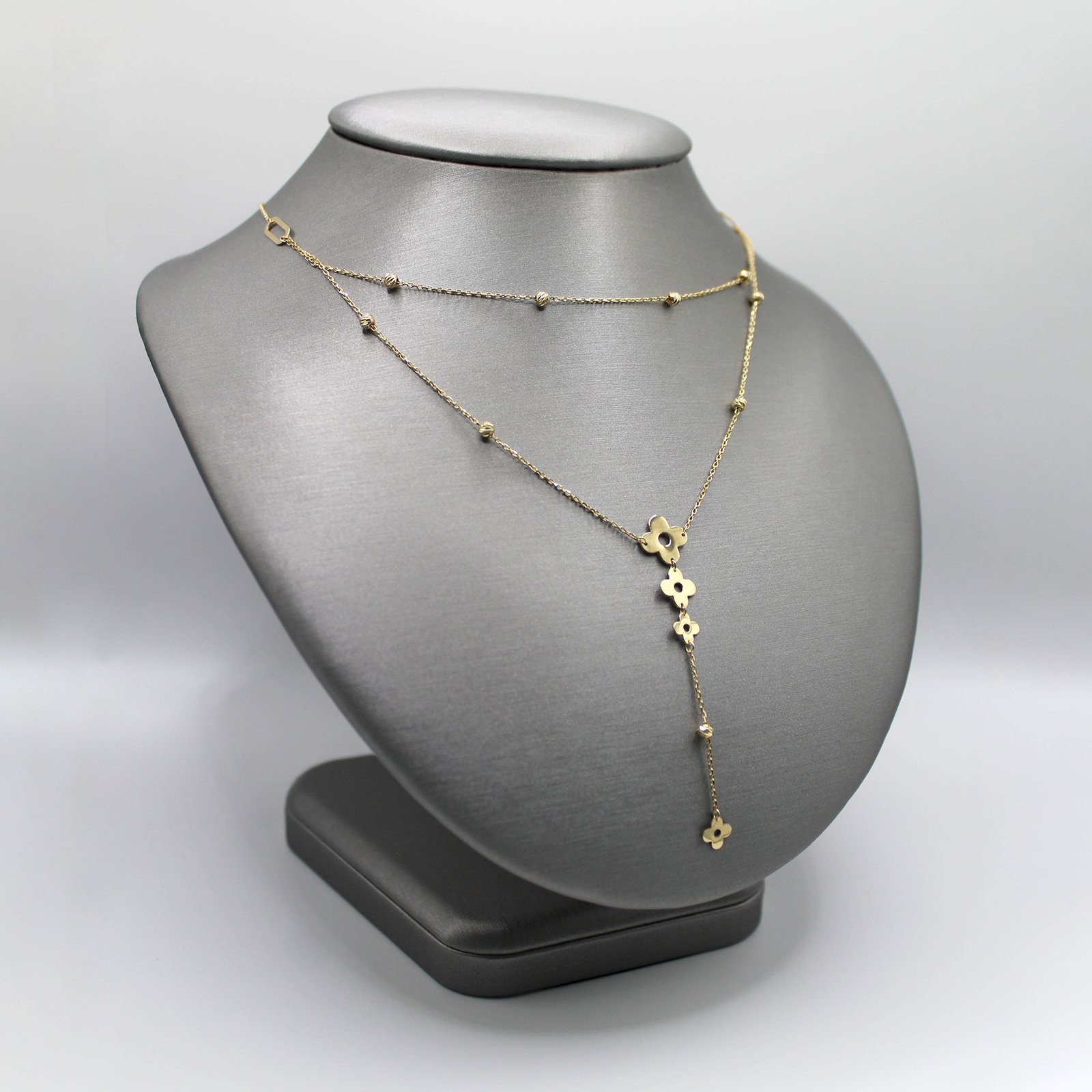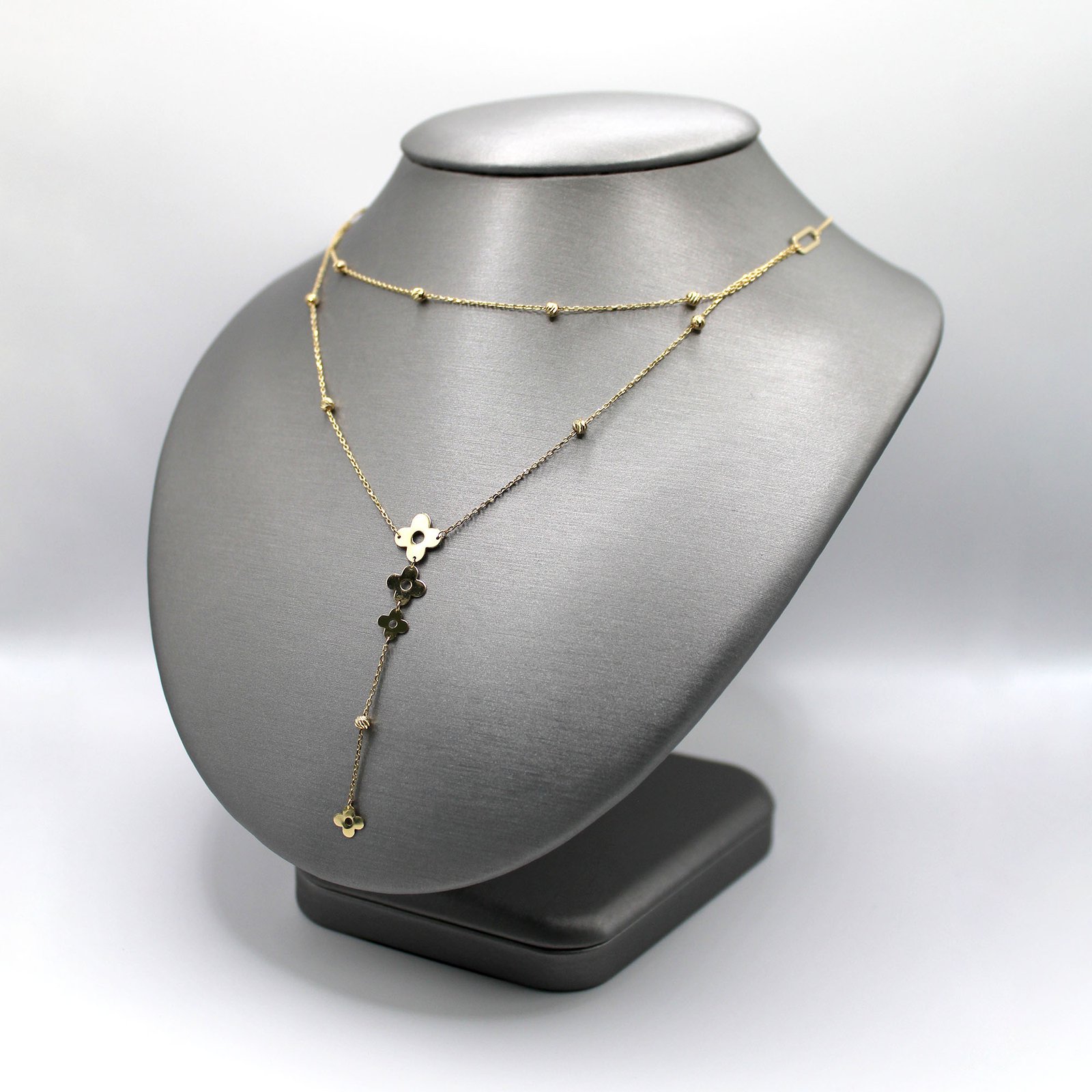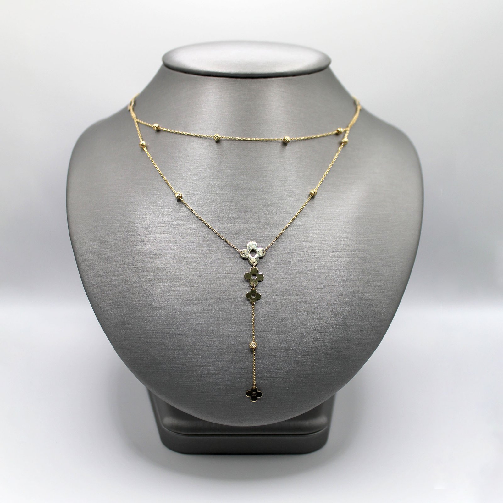 Crafted in radiant 14KT gold, this women’s necklace offers a stylish, ready-to-wear layered look. The design features two delicate chains connected at the clasp. The top layer is a station chain with small, polished gold beads. The longer, bottom layer is a lariat-style drop that features three distinct clover or flower motifs: the uppermost clover appears to have a light/white color inlay, while the lowest clover features a dark color inlay (likely black or deep brown). This piece is perfect for adding contemporary dimension, texture, and a popular motif to any ensemble.