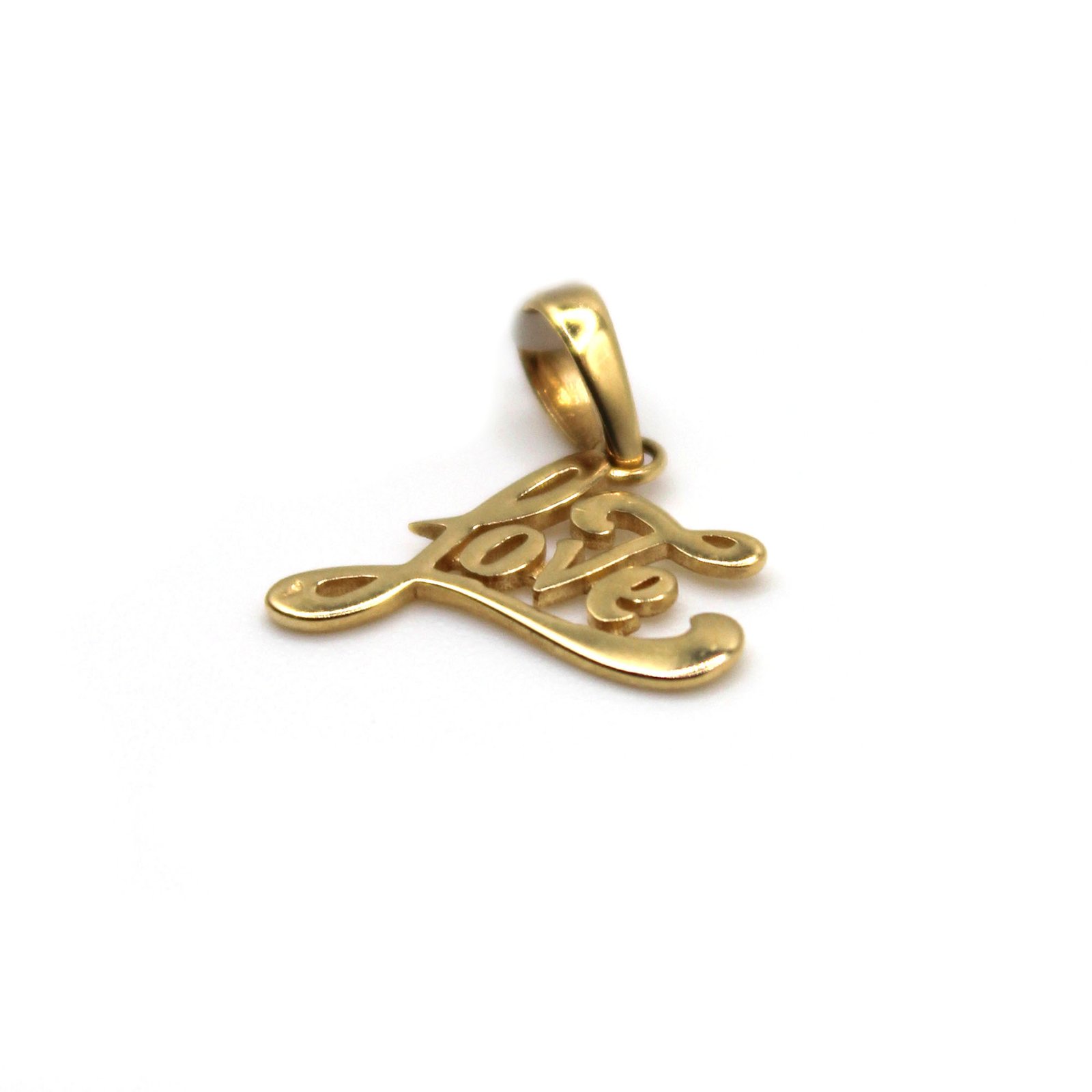 Elegant 14KT yellow gold pendant with “Love” in a flowing script design, symbolizing affection and timeless style.
