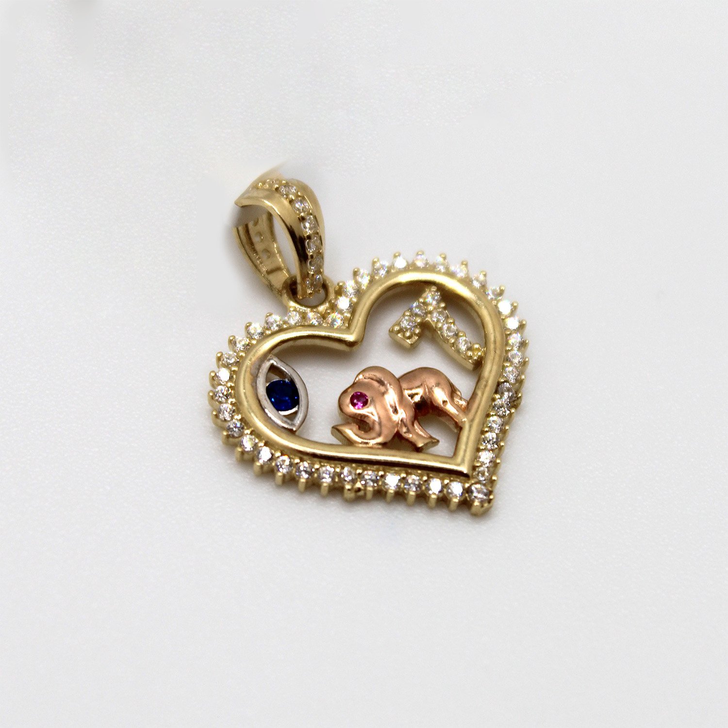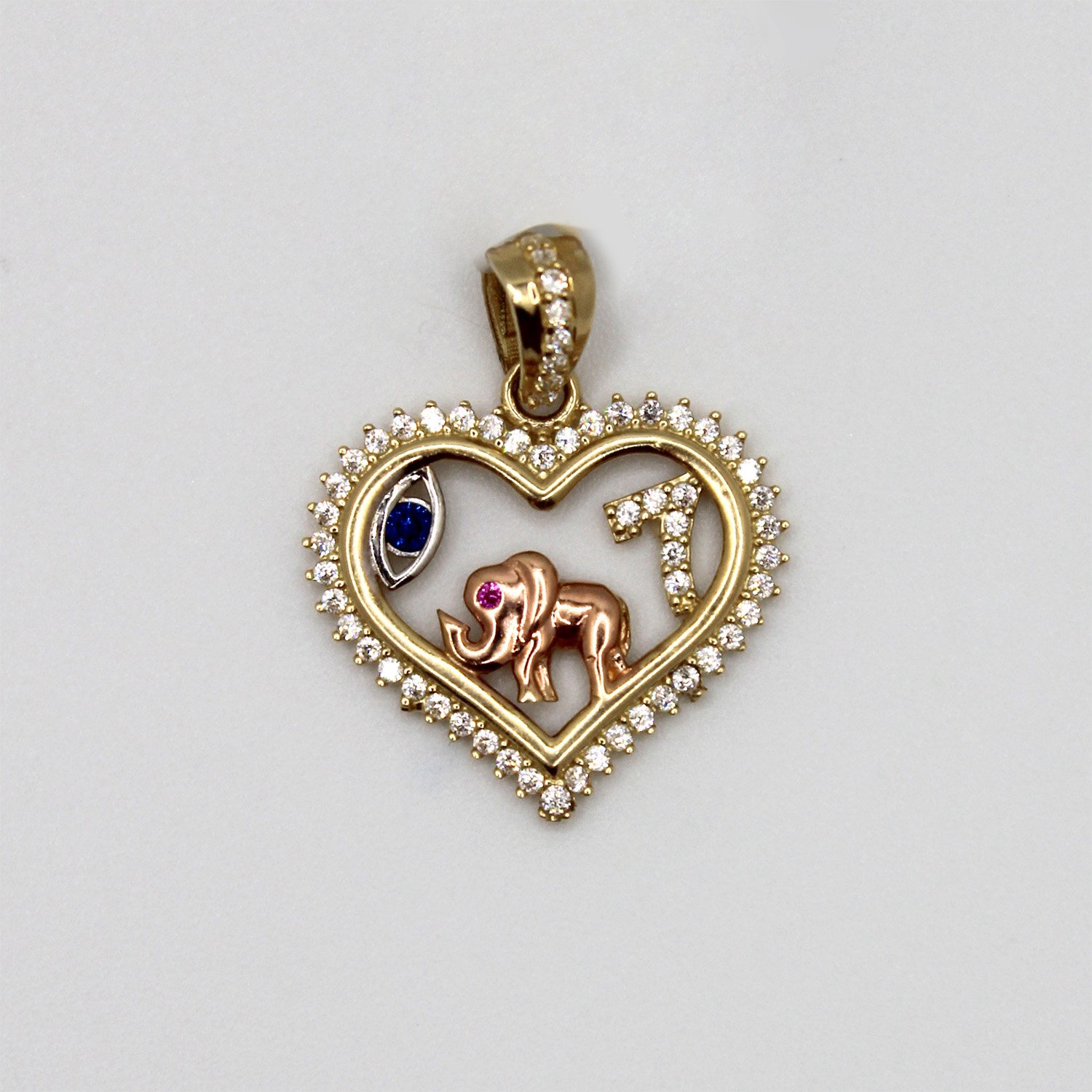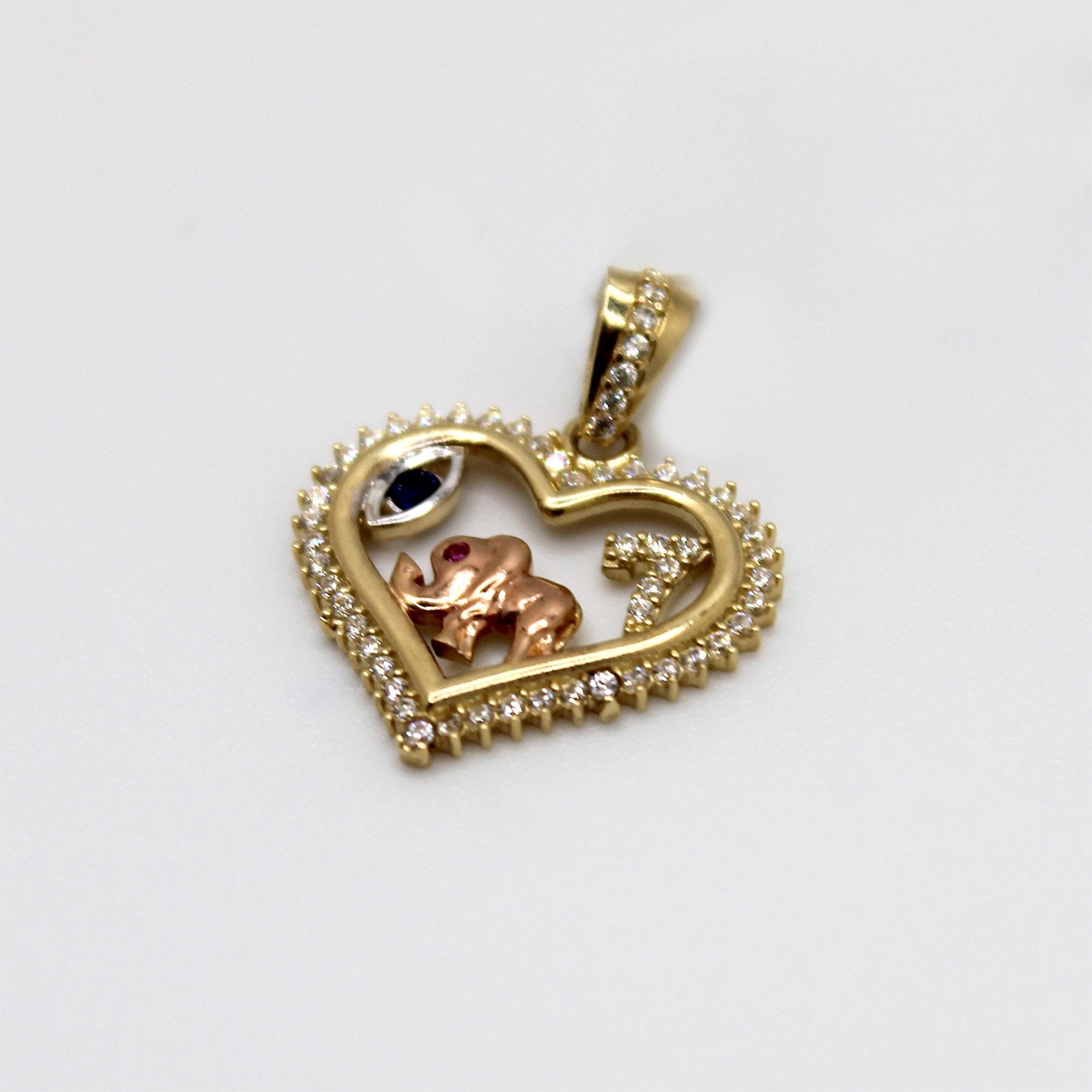 A detailed 10KT yellow gold open heart pendant featuring a rose gold elephant, a shimmering number 7, and a protective evil eye charm.