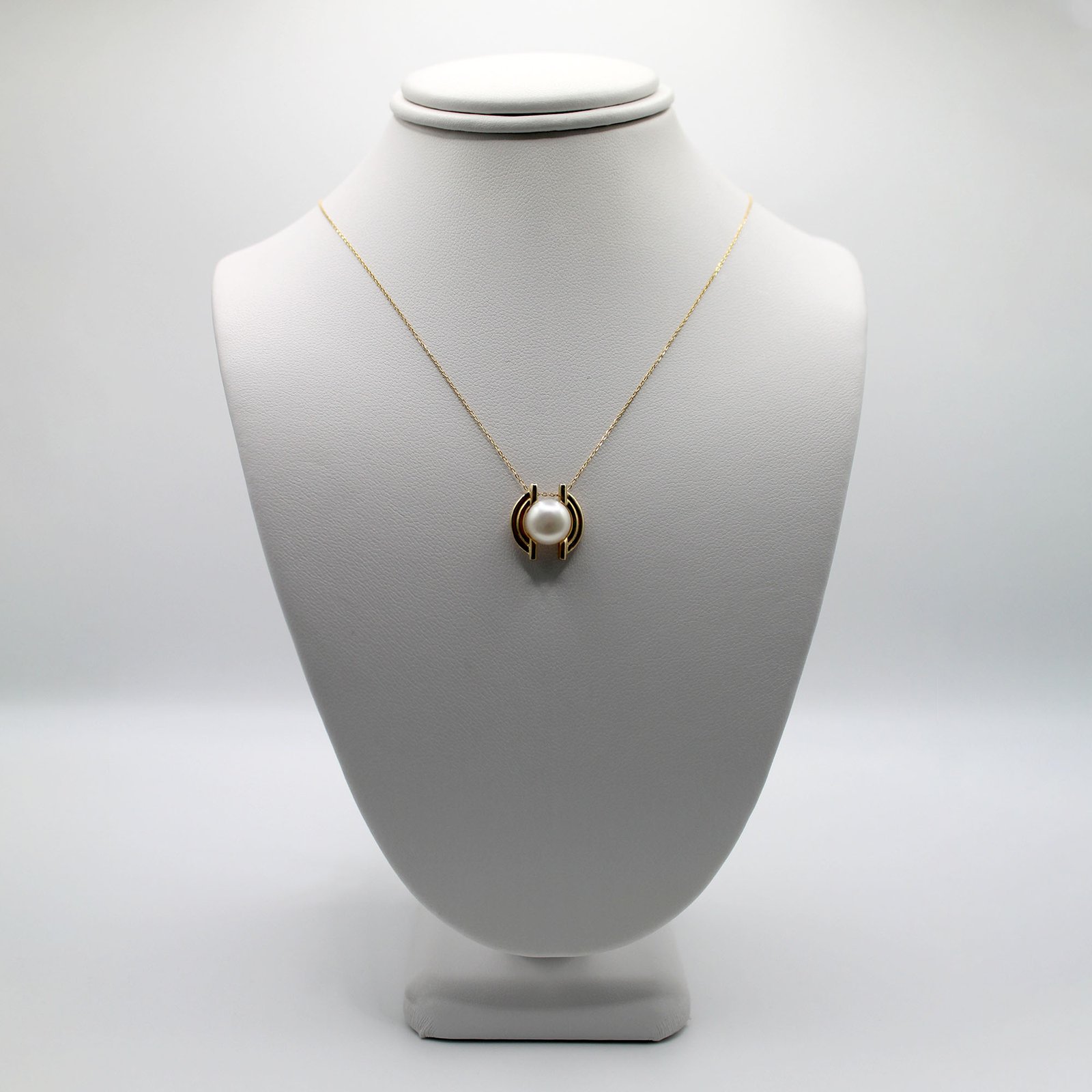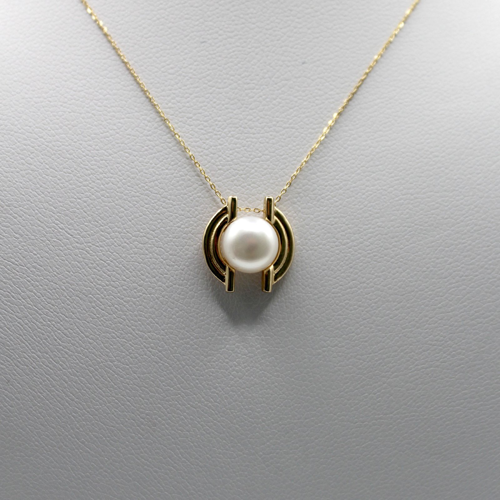 Crafted in fine 14KT yellow gold, this women’s necklace offers a contemporary and elegant design. It features a dainty link chain suspending a striking pendant. The focal point is a beautiful, smooth pearl held securely within a modern, architectural gold mounting that partially encircles the pearl. This unique setting gives the pearl a prominent, updated display. The necklace is lightweight and perfect for wearing alone as a refined statement piece, blending classic natural beauty with sharp, modern lines.