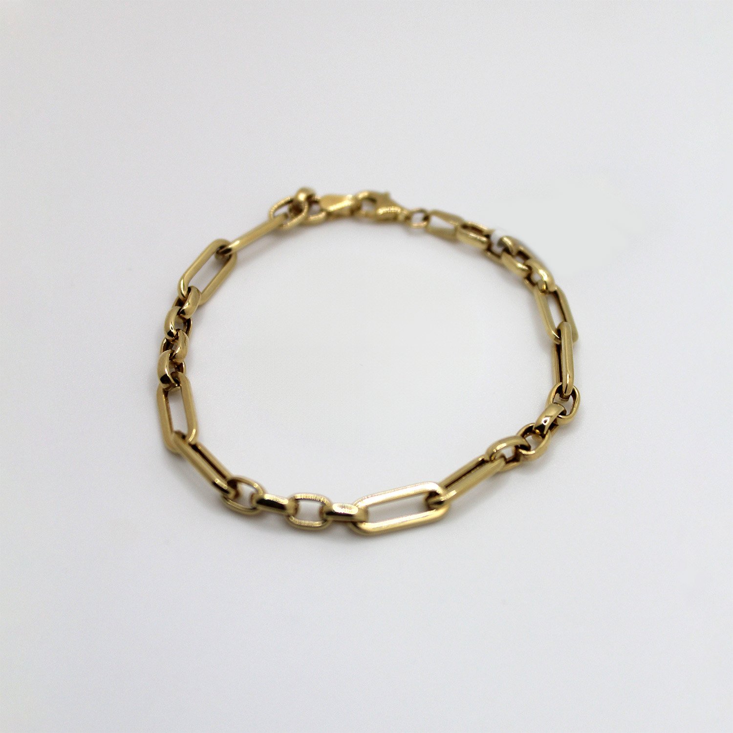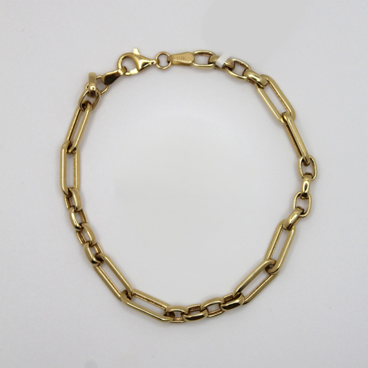 A trendy 10KT yellow gold bracelet featuring elongated paperclip-style links and a 7-inch length with a polished finish.