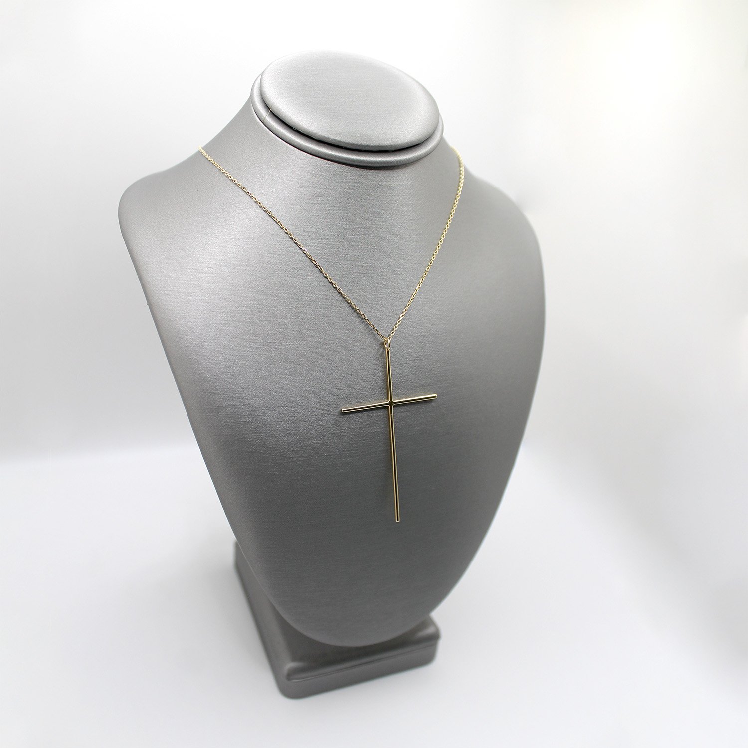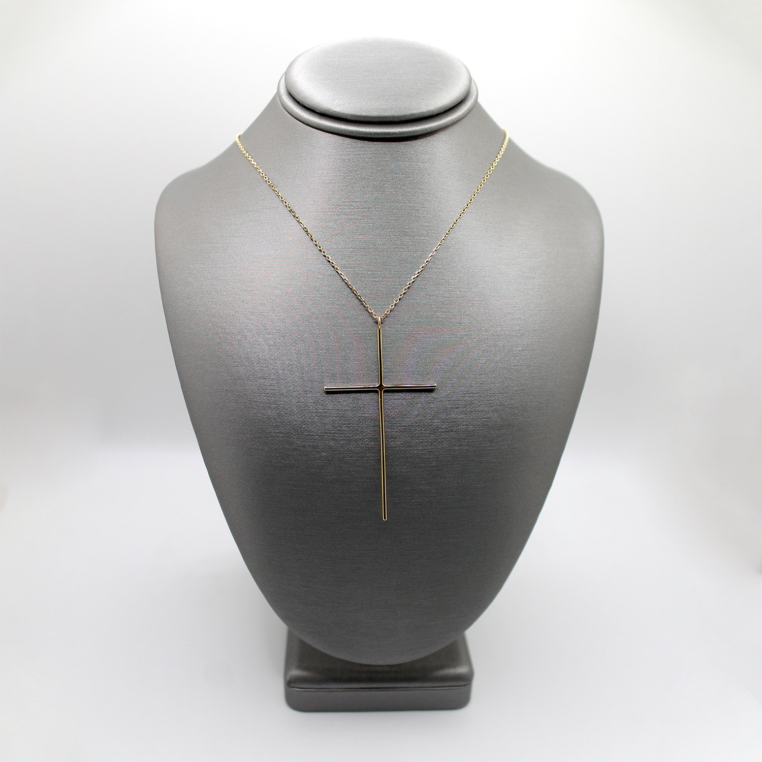 A contemporary 10KT yellow gold necklace featuring a large, minimalist oversized cross pendant on a delicate 16-inch chain.