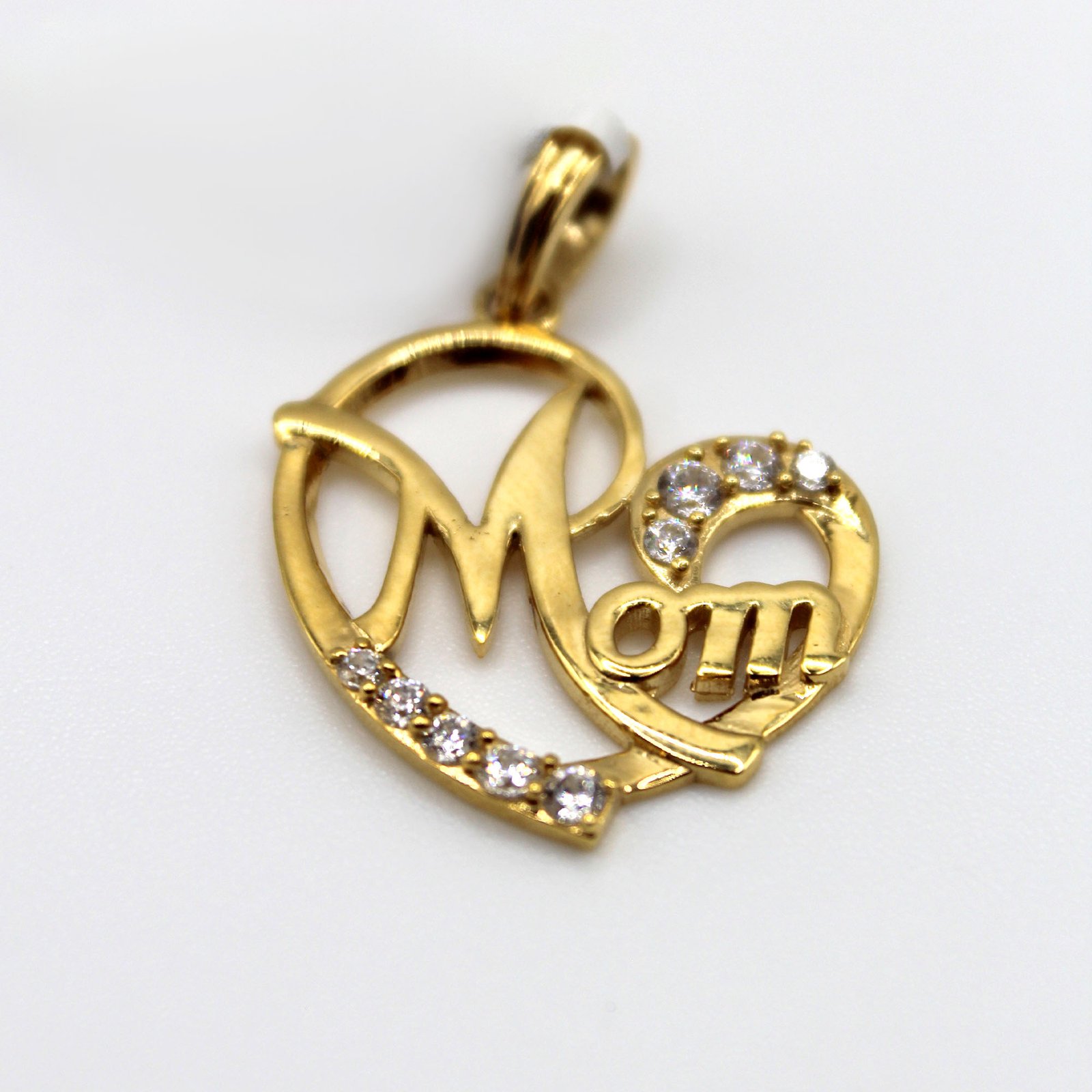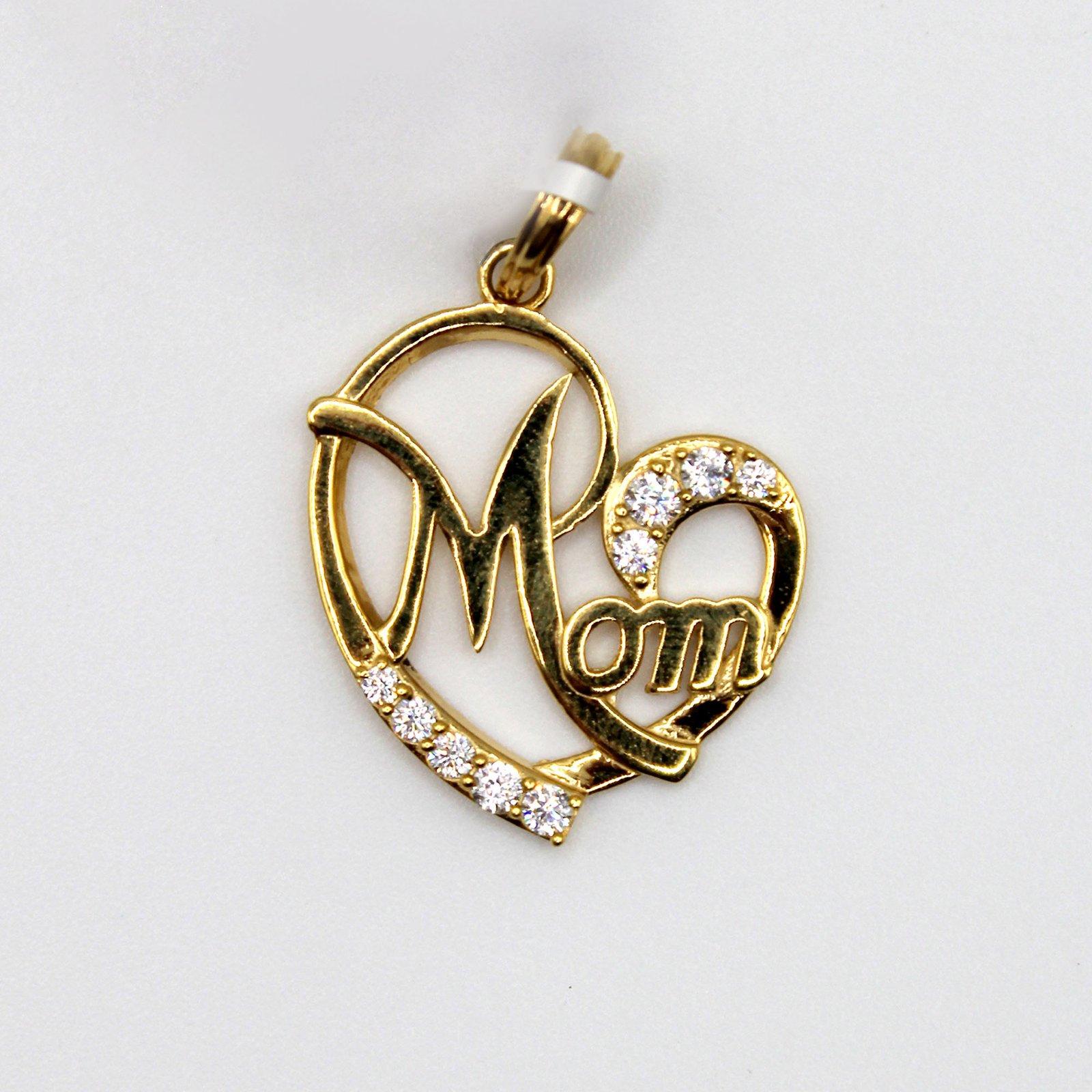 Crafted in warm 10KT yellow gold, this beautiful pendant is a perfect gift to celebrate motherhood. The design features the stylized word “Mom” integrated into a flowing heart shape. The heart and lettering are accented with multiple small, brilliant white stones, which are pave-set along the curves, maximizing the sparkle. The piece is finished with a smooth, polished bail, allowing it to hang elegantly on a necklace chain. This piece is a meaningful, timeless token of love and appreciation.